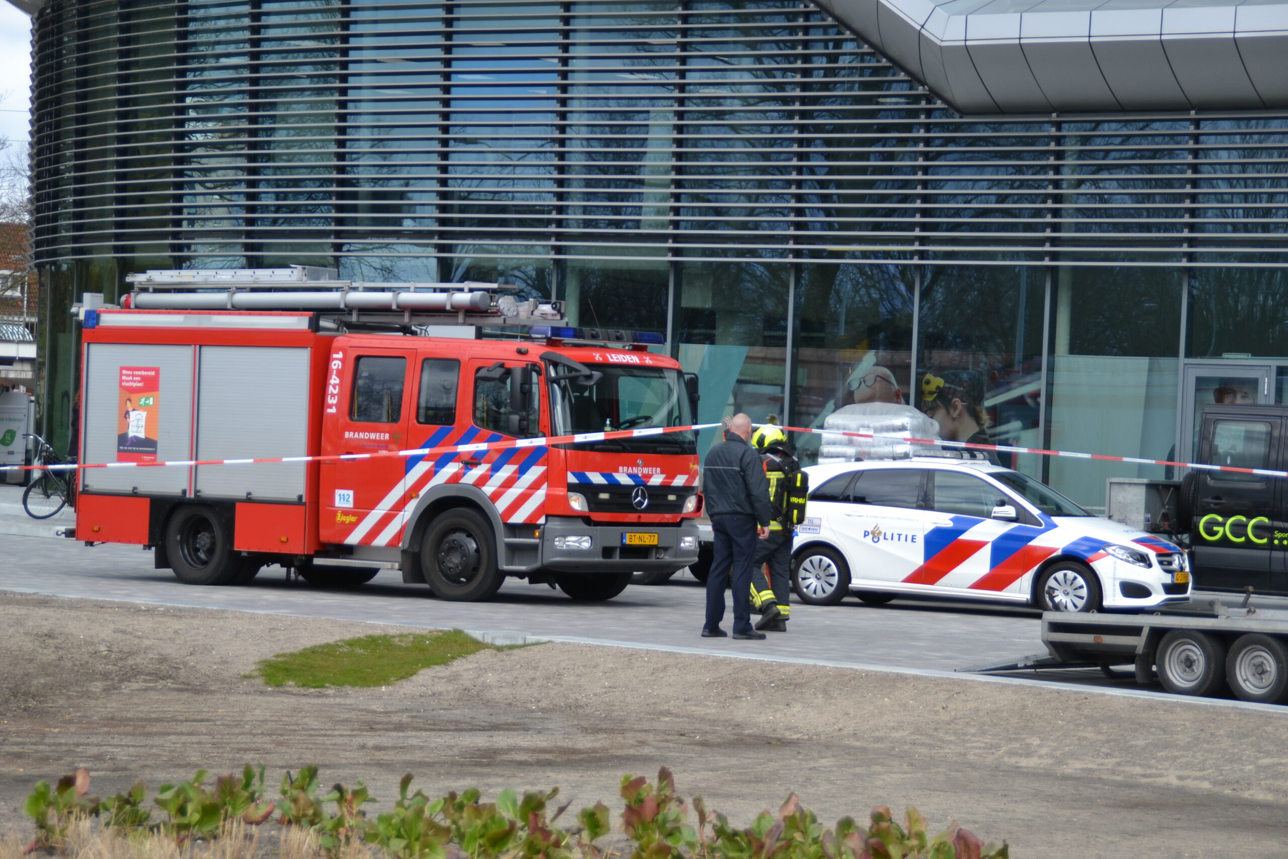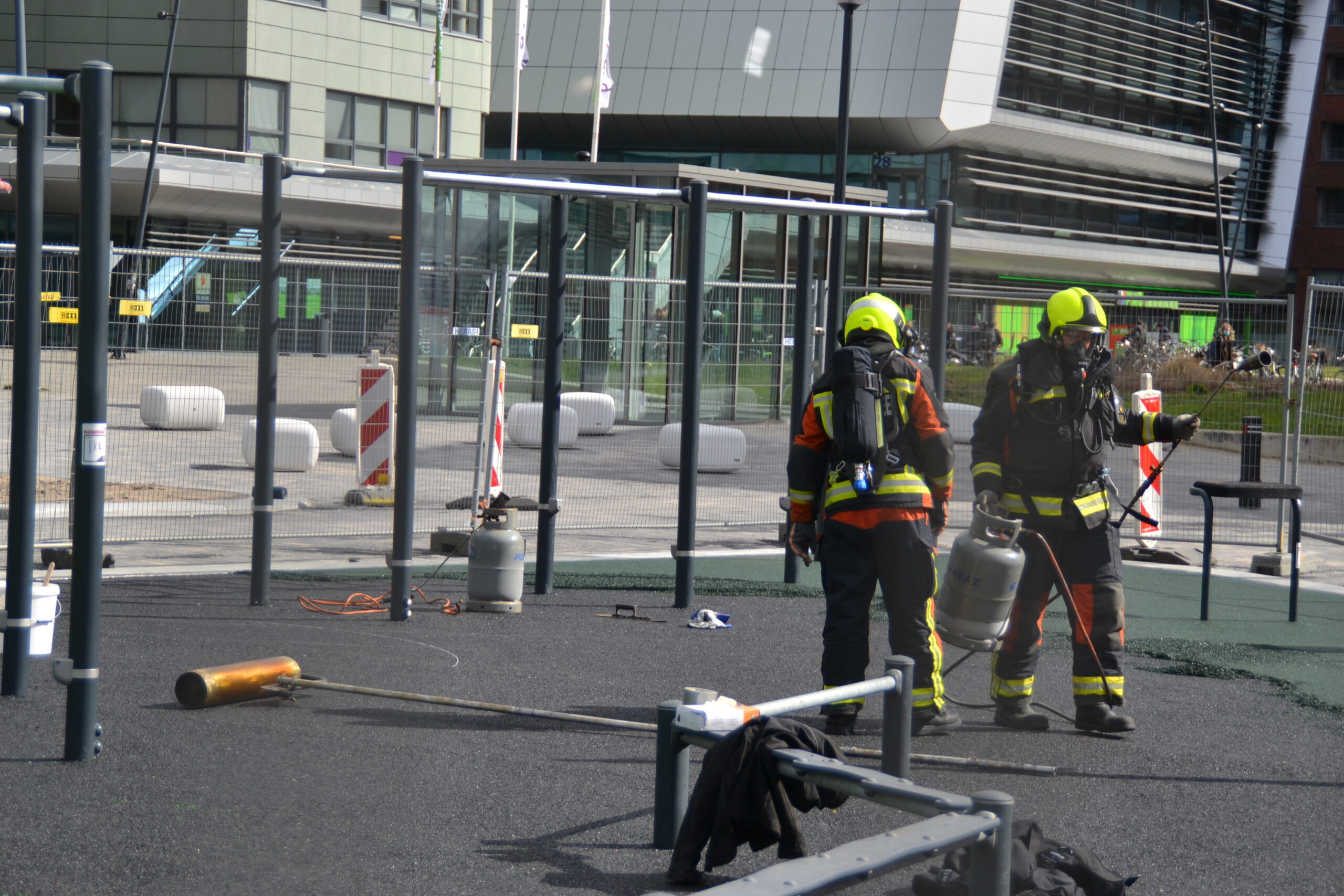 Het Betaplein in de Lammenschansdriehoek is vanmiddag rond 12.45 uur door politie en brandweer ontruimd toen bleek dat een gasfles in brand stond. De gasflessen worden gebruikt bij werkzaamheden aan het plein. Er wordt daar een sportparkje aangelegd.