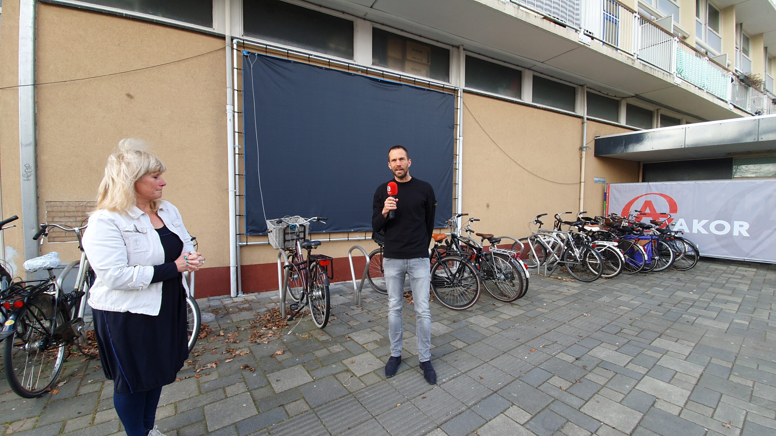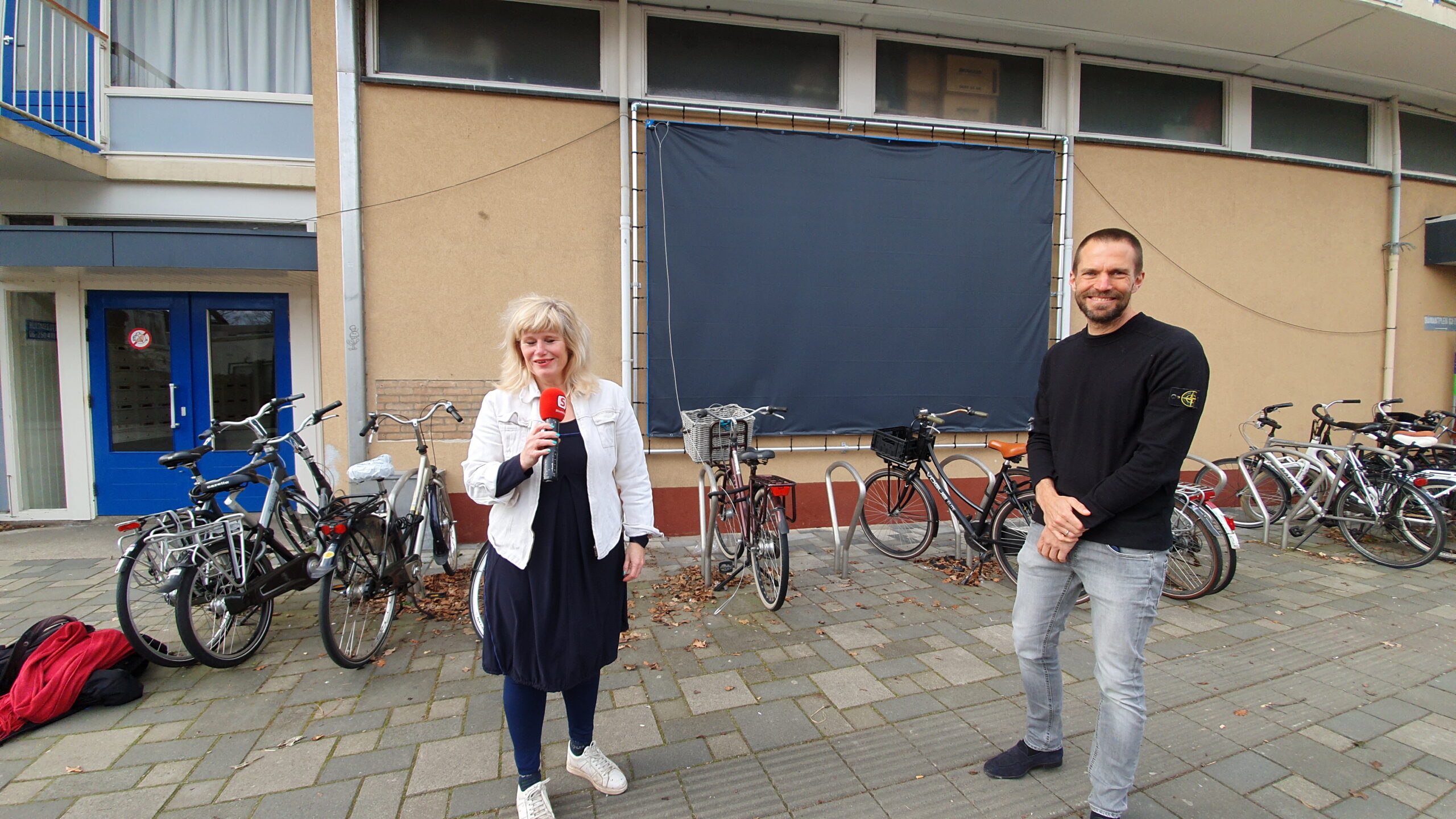 Wethouder Yvonne van Delft en Auke Geurts van eigenaar Topmunt BV van het winkelcentrum bij de start van de verbouwing.