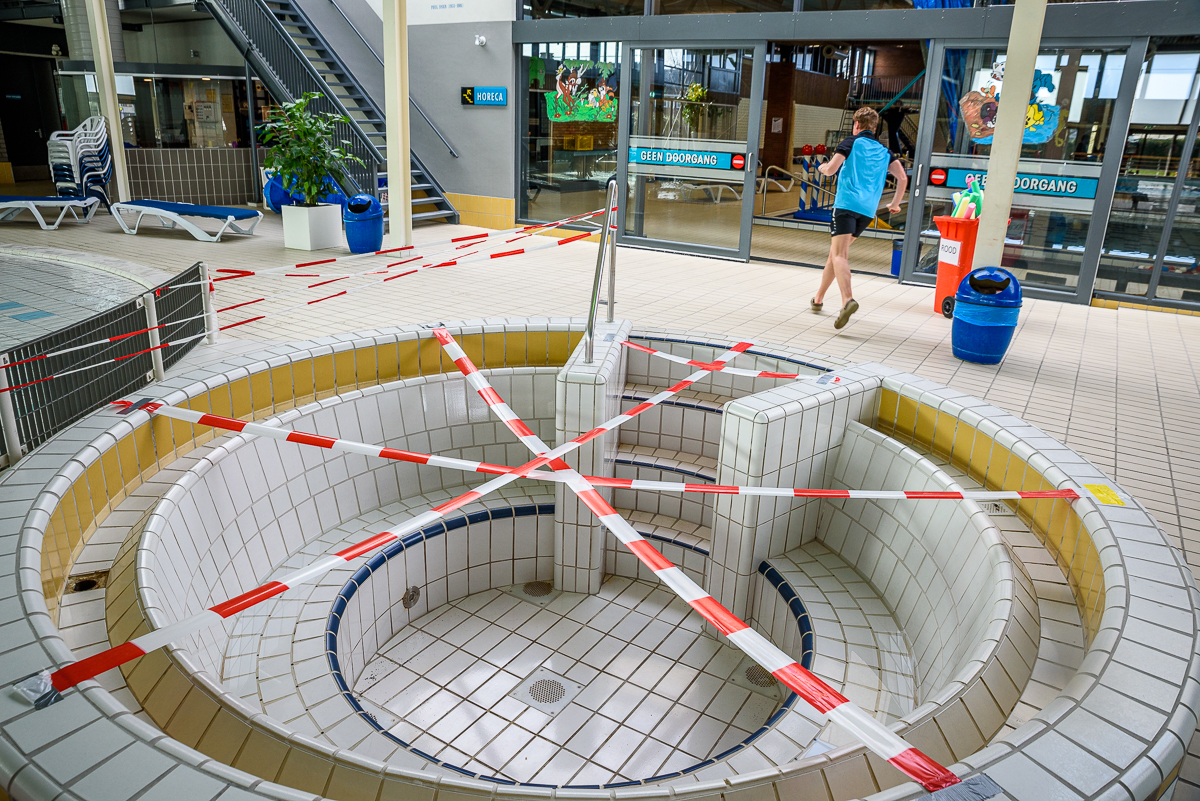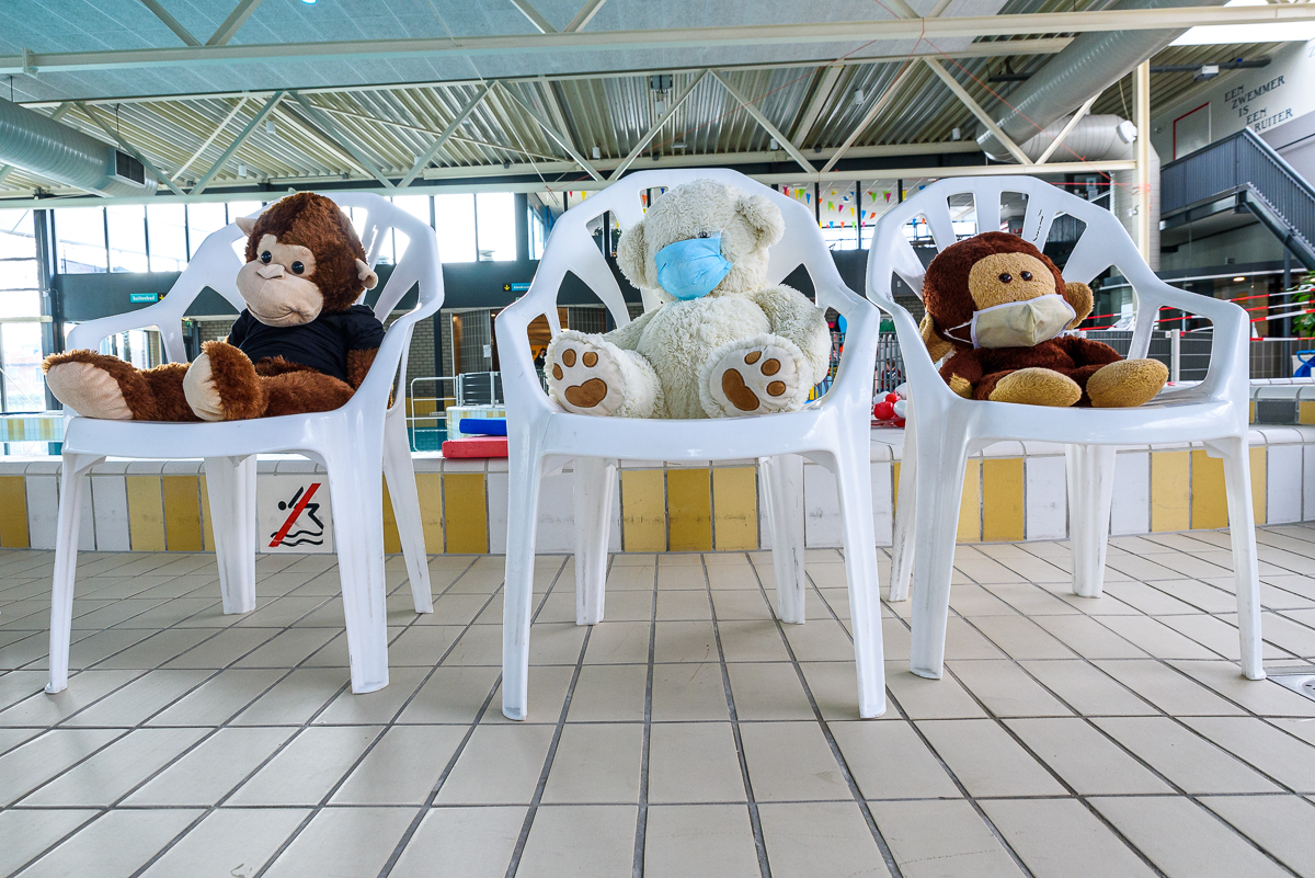 De whirlpool mag dan leeg zijn, en ook de glijbaan staat stil. Maar boven het grote zwembad is het feestelijk versierd met slingers en er is een provisorische tribune ingericht van plastic stoeltjes. Daarop zitten grote knuffels, met mondkapjes want het is wel coronatijd natuurlijk.