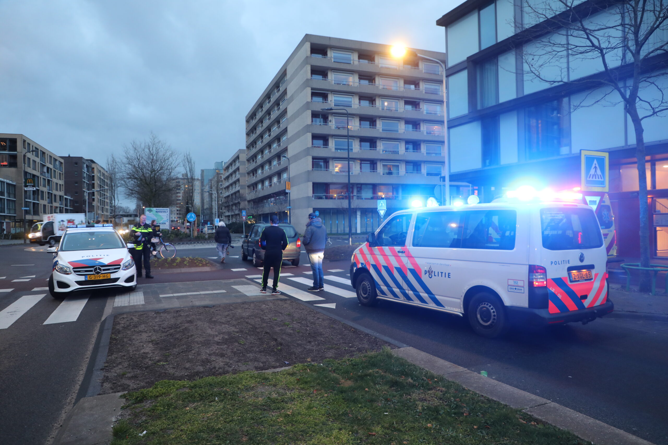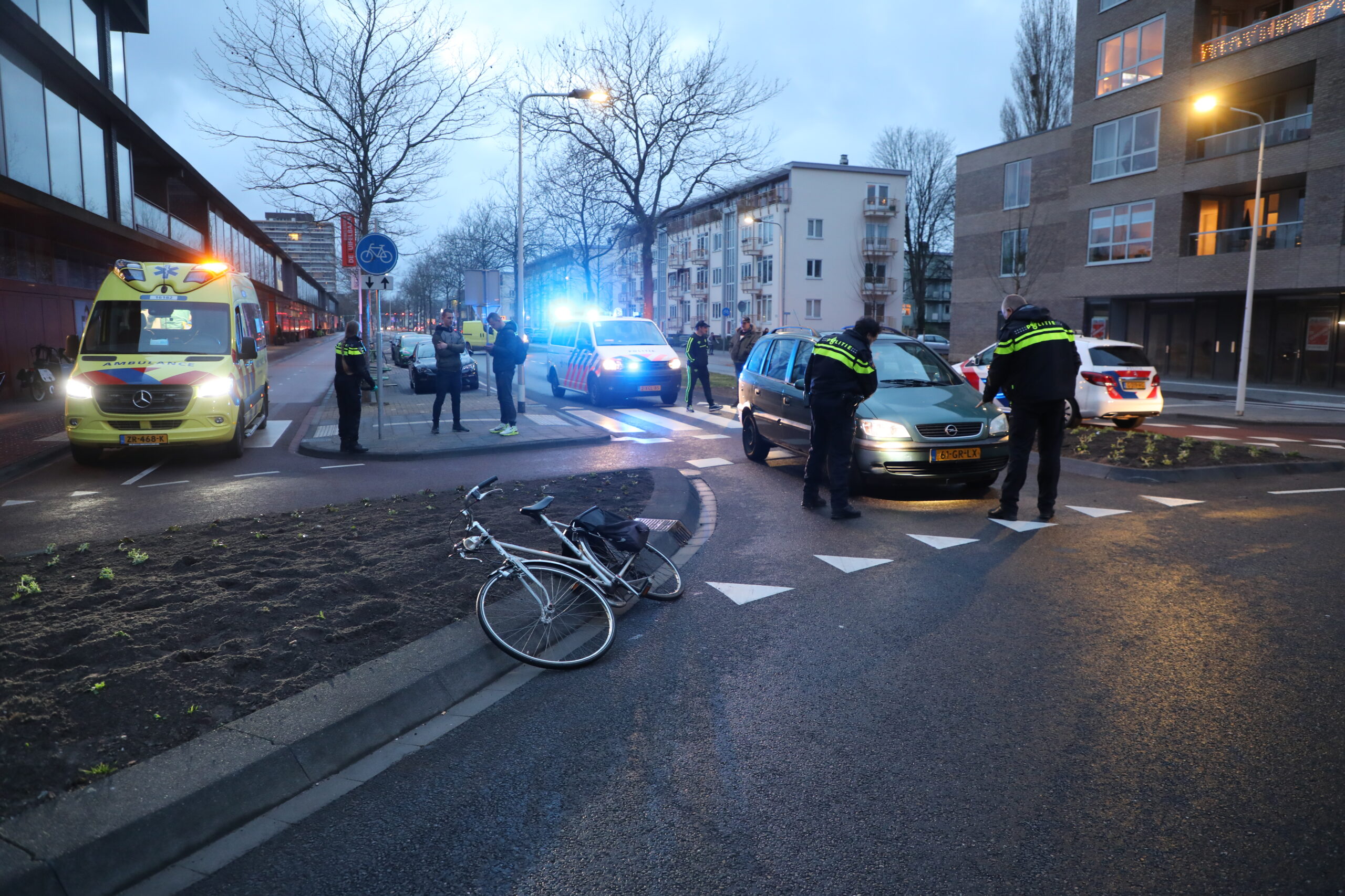 Op de rotonde bij de Vijf Meilaan in Leiden is vrijdagavond een fietser geschept door een personenauto. Het slachtoffer belandde enkele meters van het fietspad vandaan.
