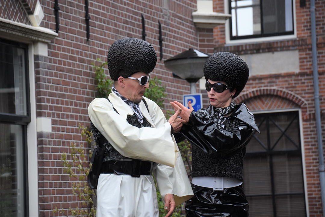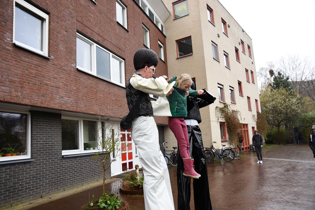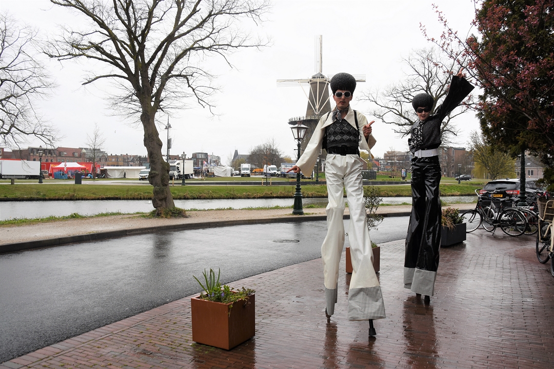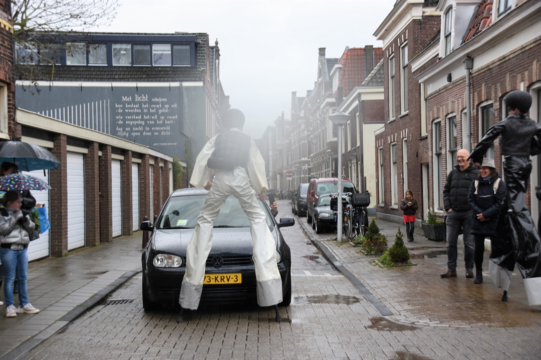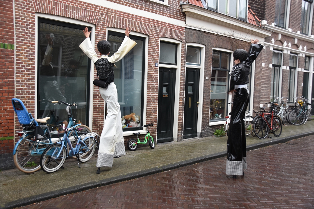 Op de stelten stonden initiatiefnemer Danny Molenaar van Levend Lijf en danseres Diewertje Spek. “We willen graag wat vrolijkheid brengen en de inwoners van leiden laten zien dat de culturele sector nog bestaat”, zegt Danny Molenaar. En dat lukt wonderwel. Mensen kwamen nieuwsgierig hun huis uit, liepen spontaan een stukje mee en waagden zich zelfs ook aan een dansje.