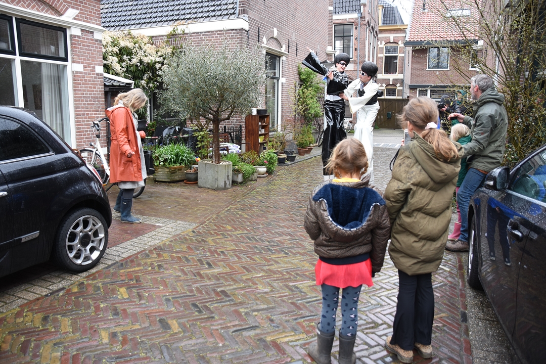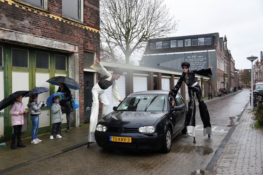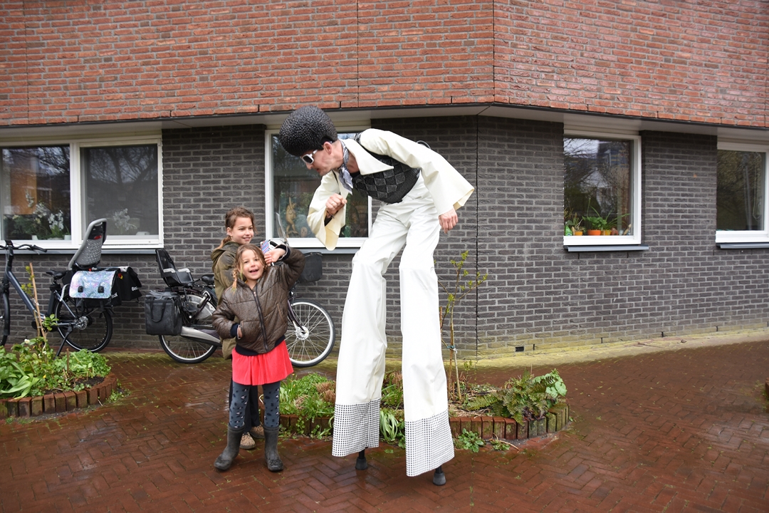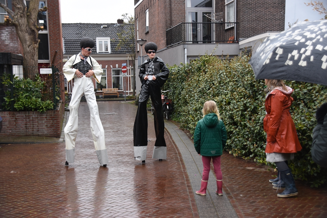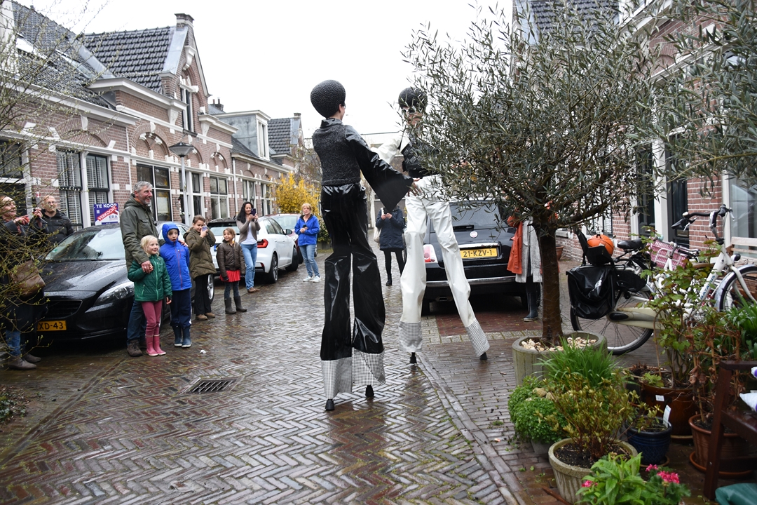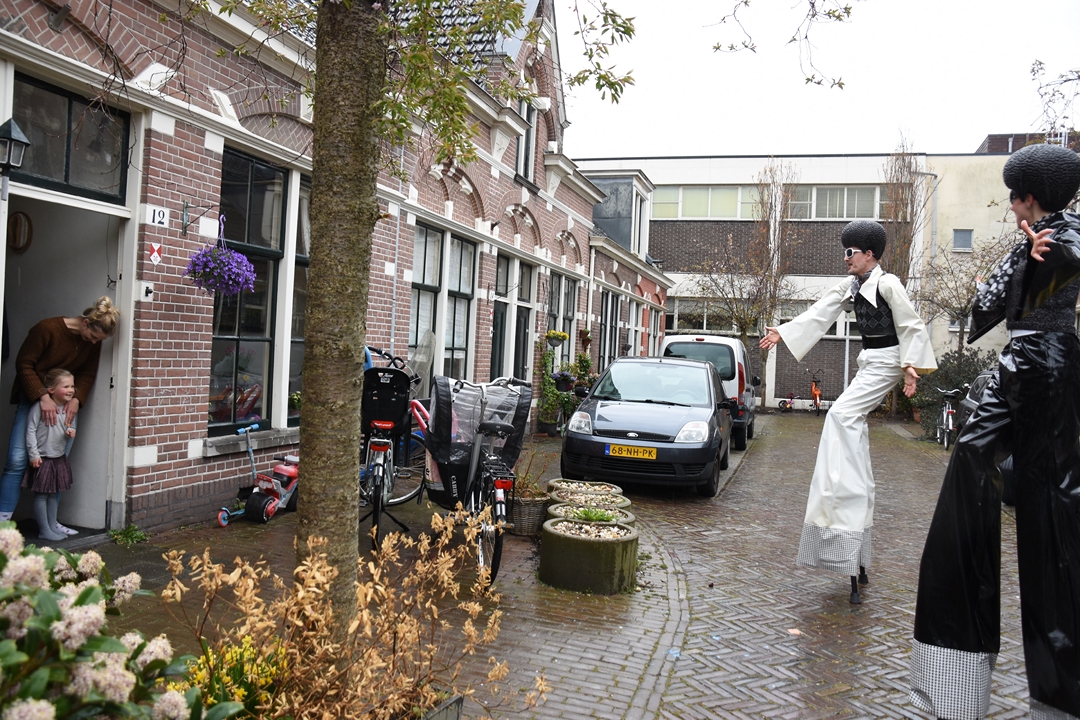Afgelopen zaterdag viel de Straatprijs toch, ondanks de regen en de kou. Langs de Rijnsburgersingel, de Maredijk, Oranjerie, Aloëlaan en Vendelstraat en omstreken werden bewoners getrakteerd op vrolijke muziek en twee dansers op stelten onder het motto de Blijf Thuis Parade komt naar je toe deze maand.