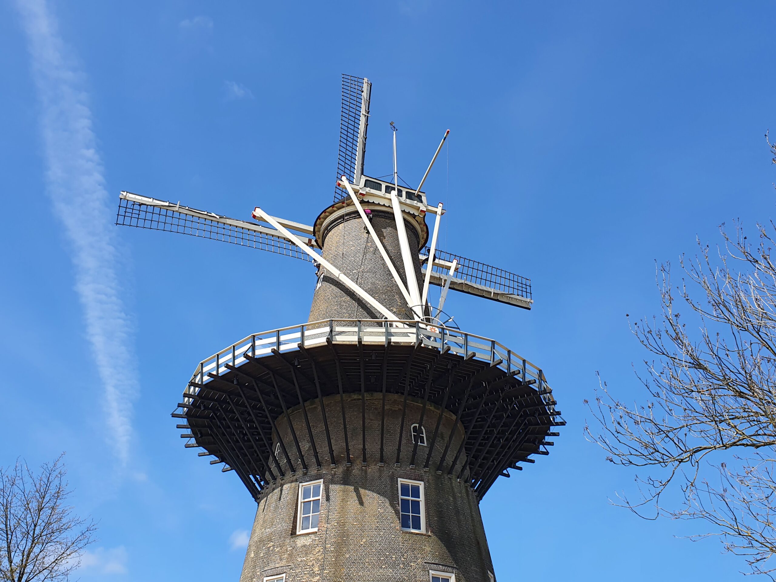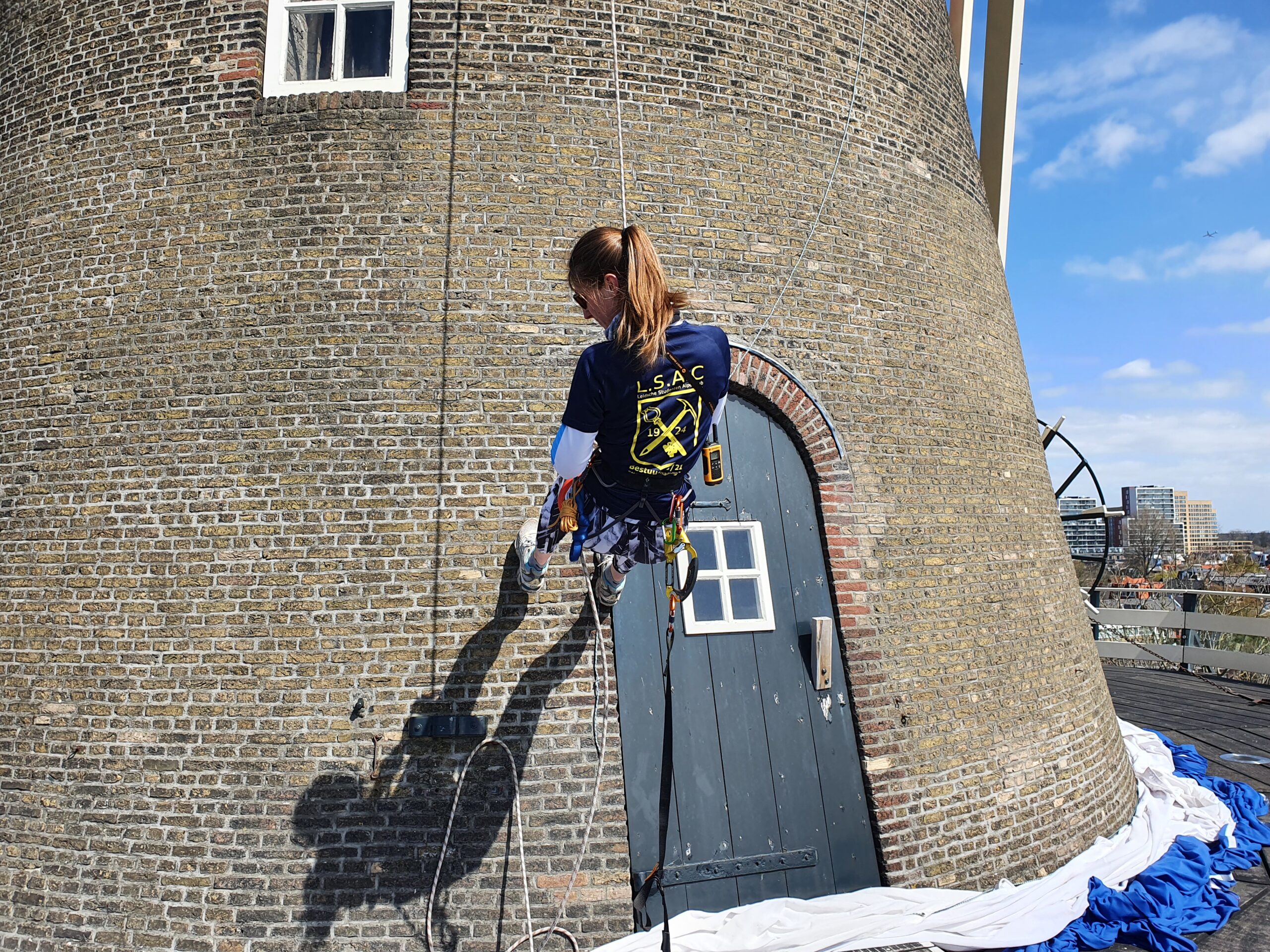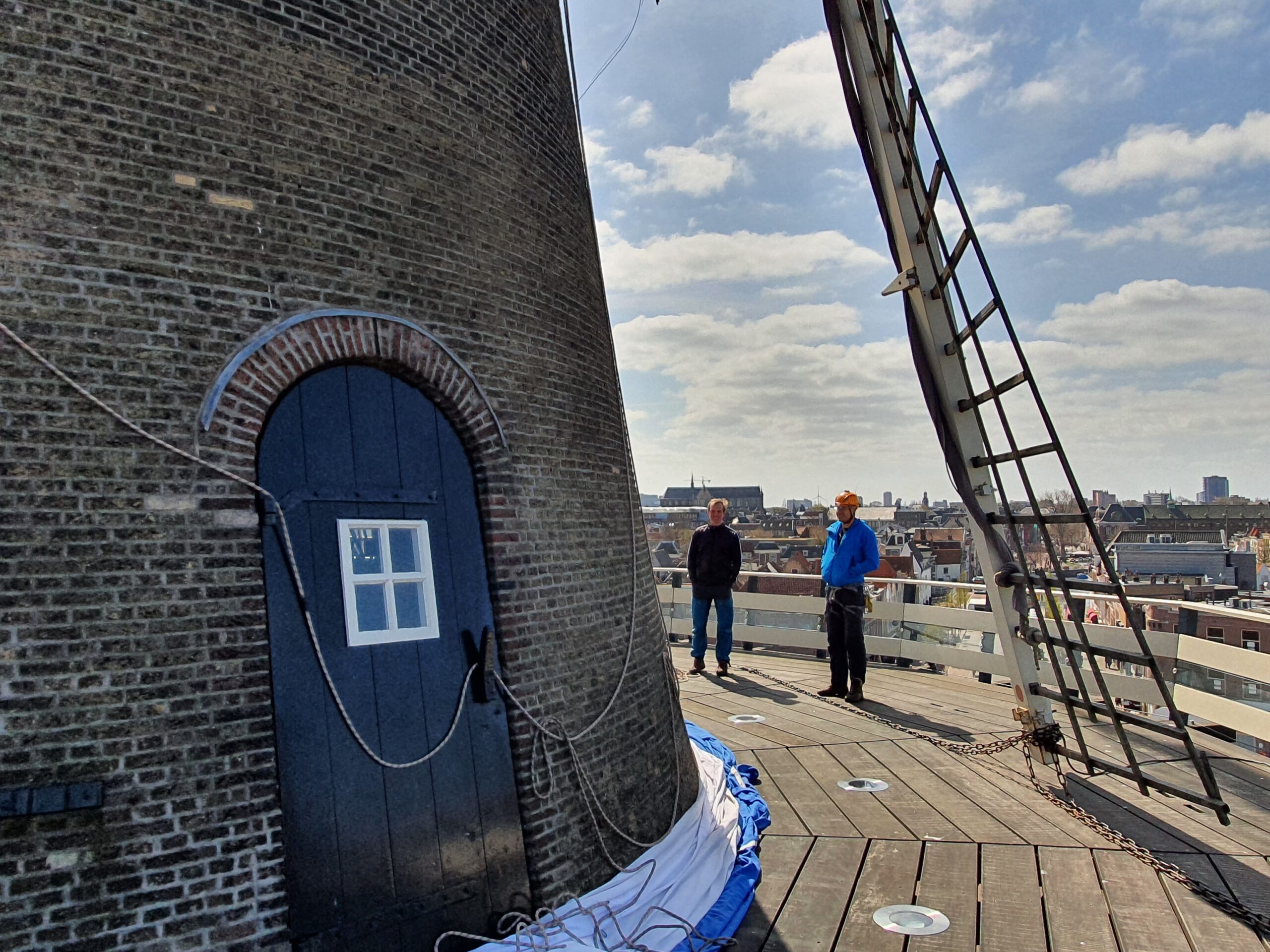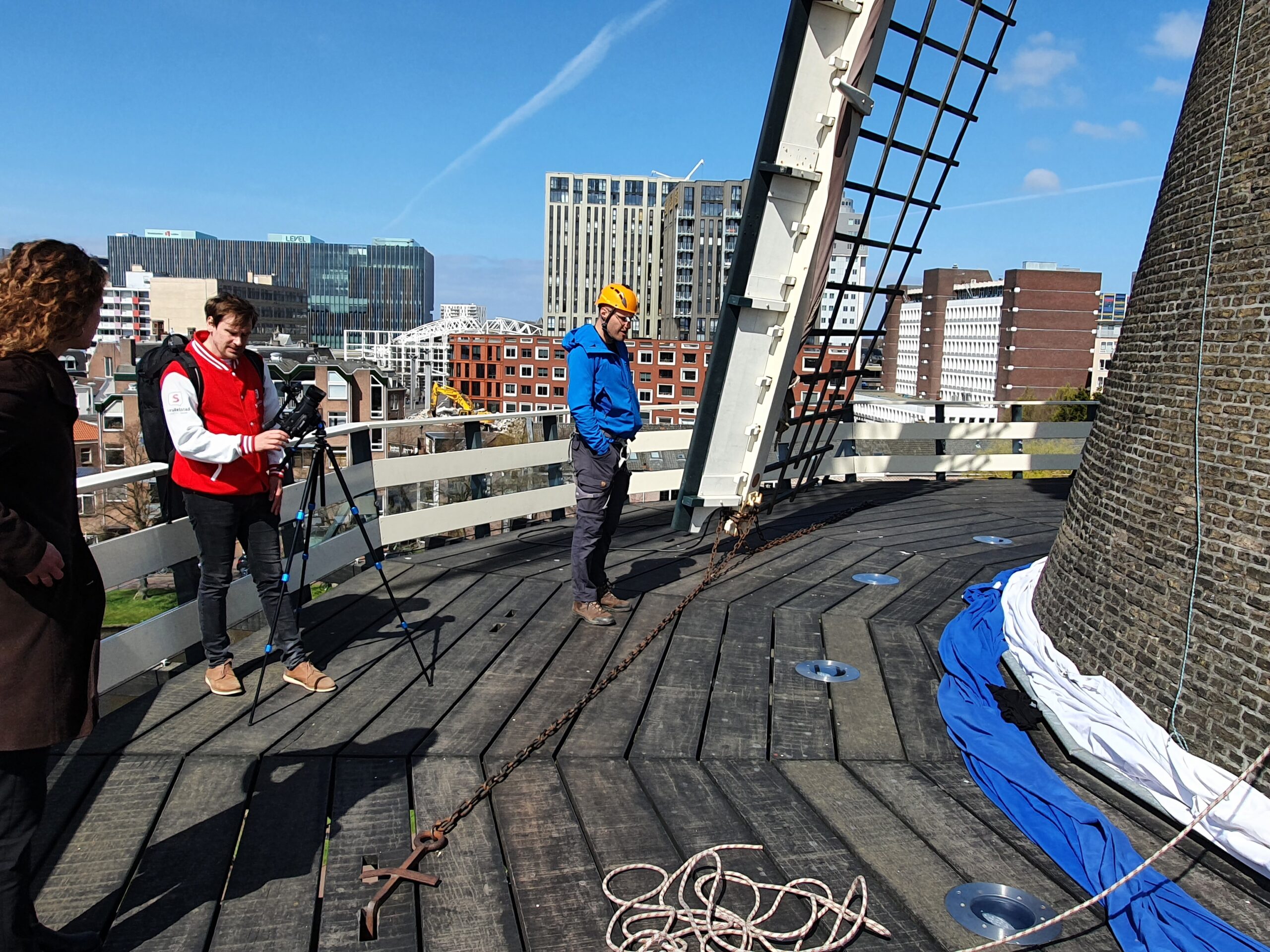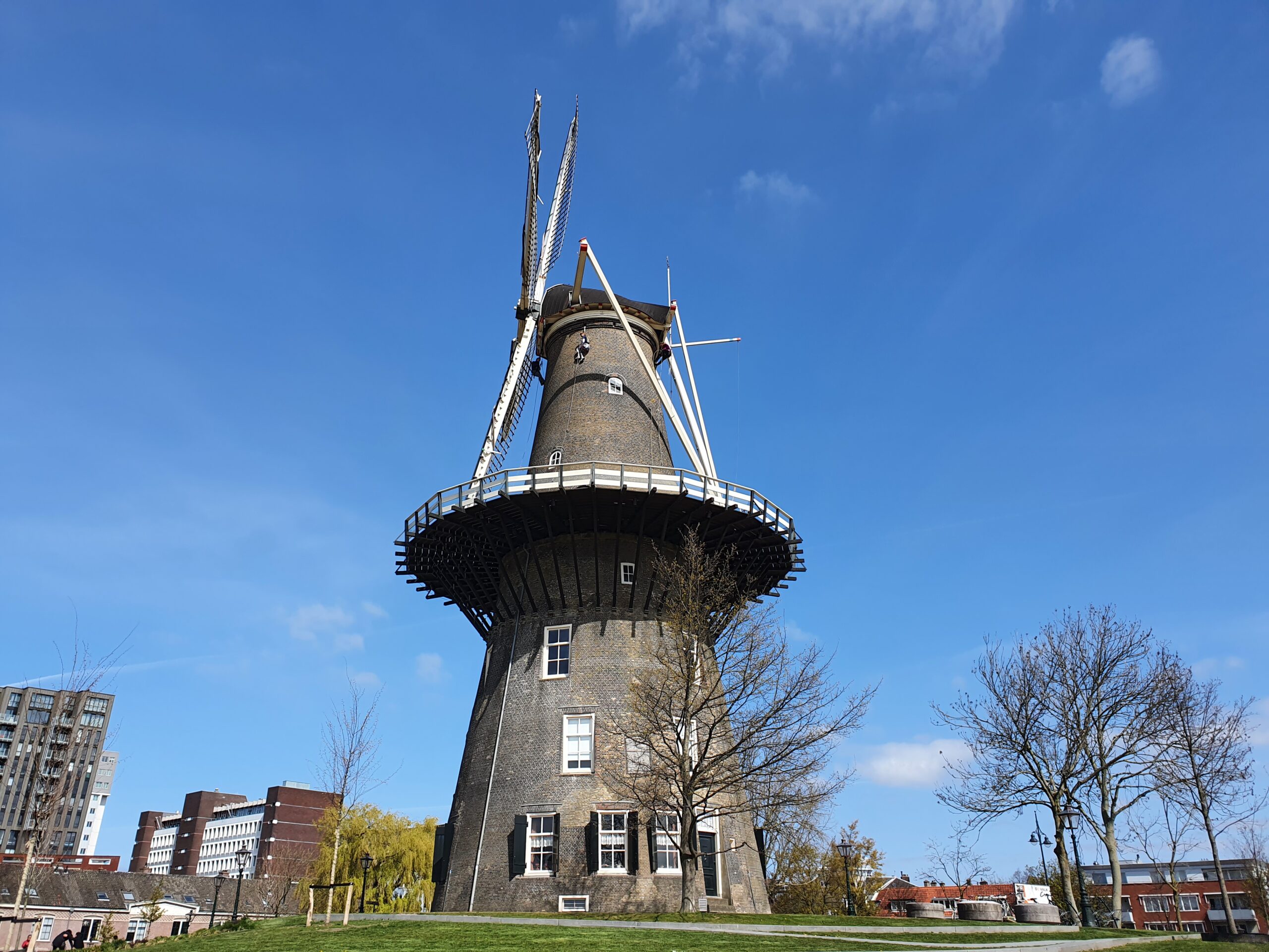 Eerst werd daarvoor een kabel rondom de molenromp bevestigd, waarna als eerste de rode vlag op z’n plek werd gehesen. Dat kunstje werd herhaald voor de kleuren wit en blauw. In de loop van de middag stond de molen in het rood-wit-blauw getooid te stralen in de Leidse lentezon.
