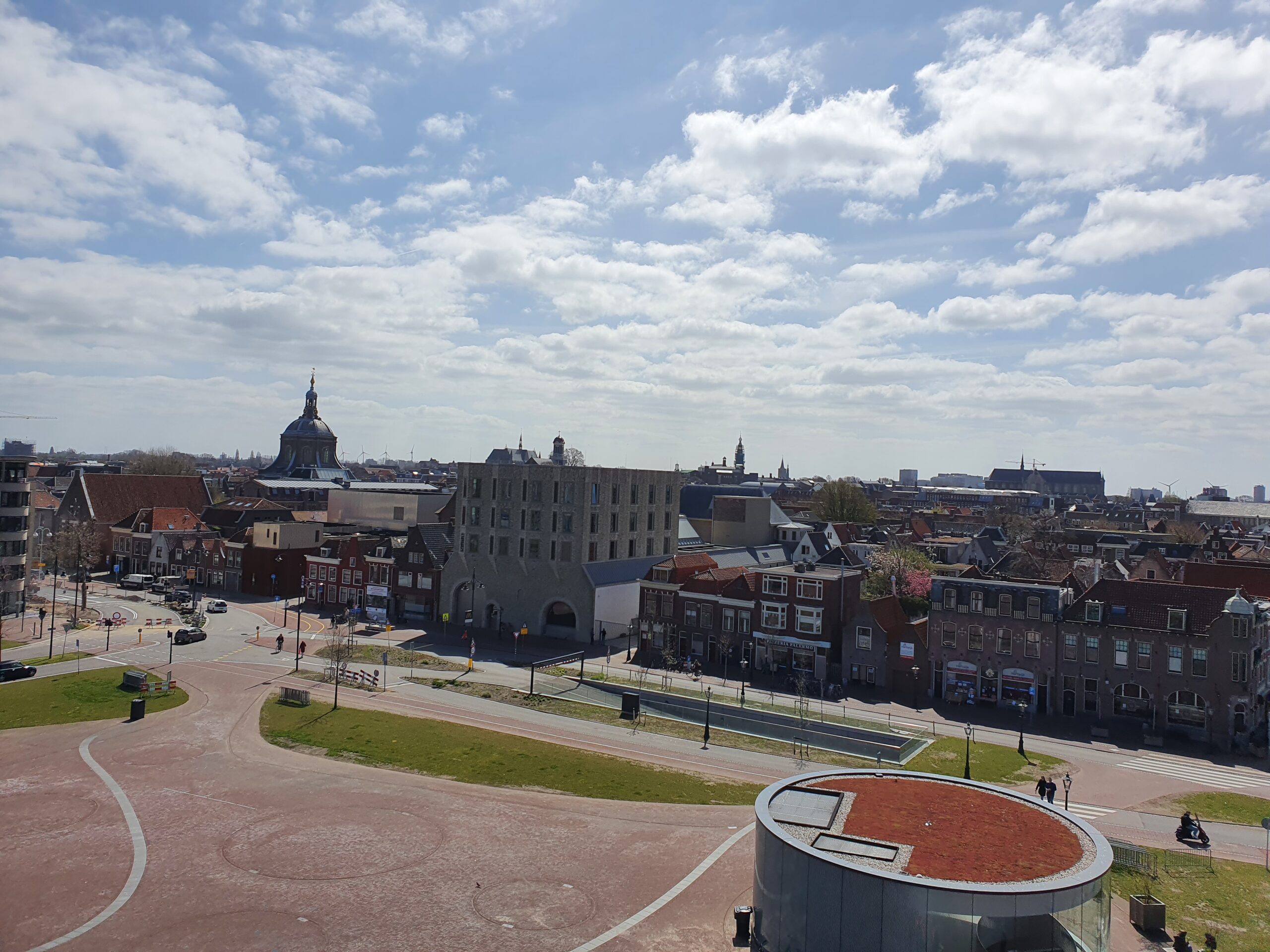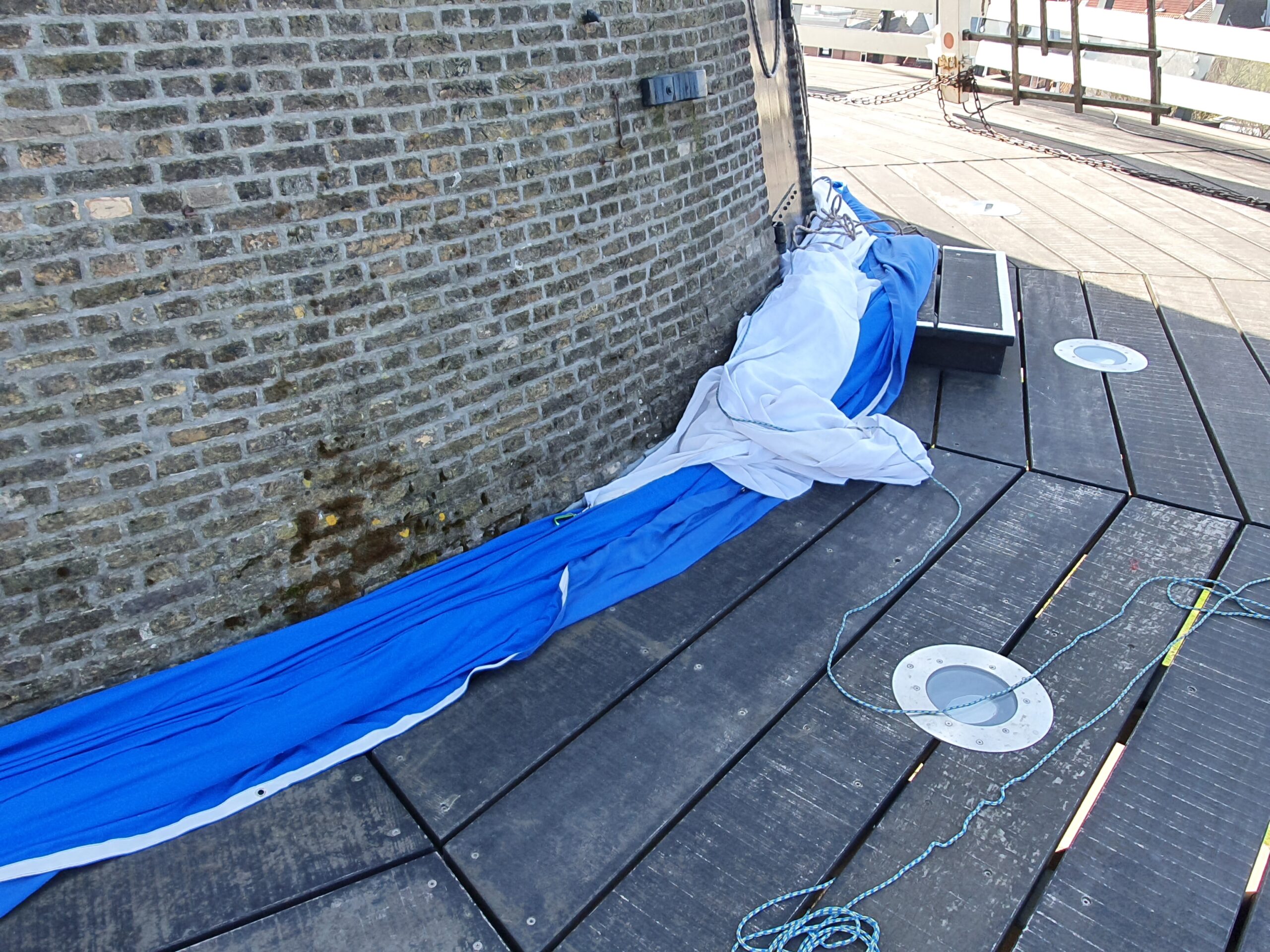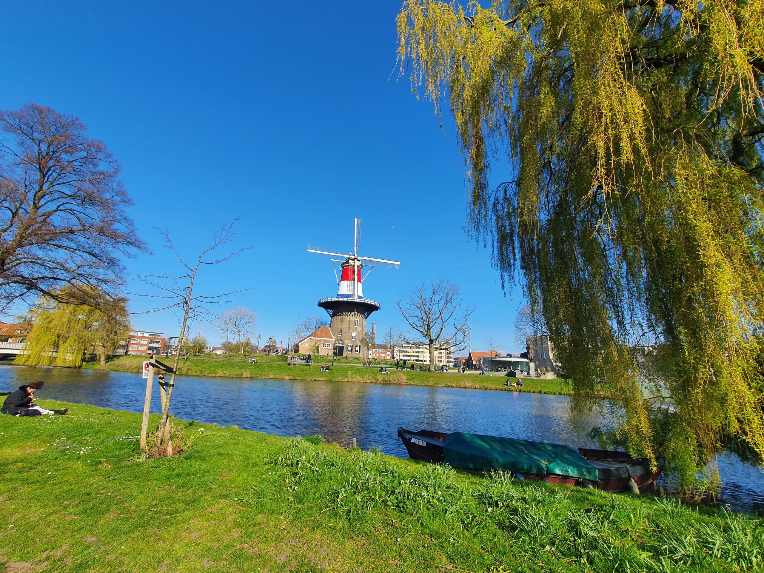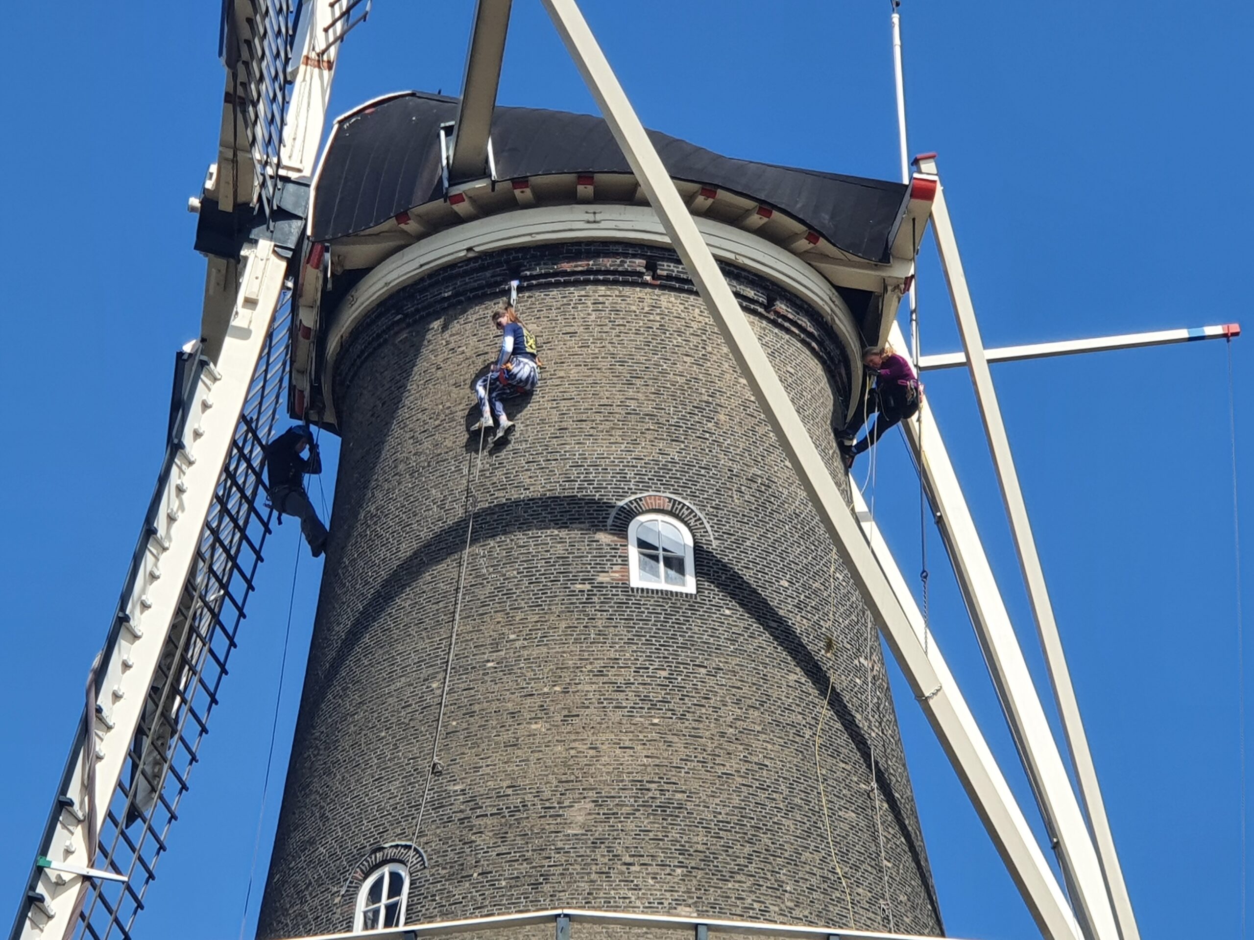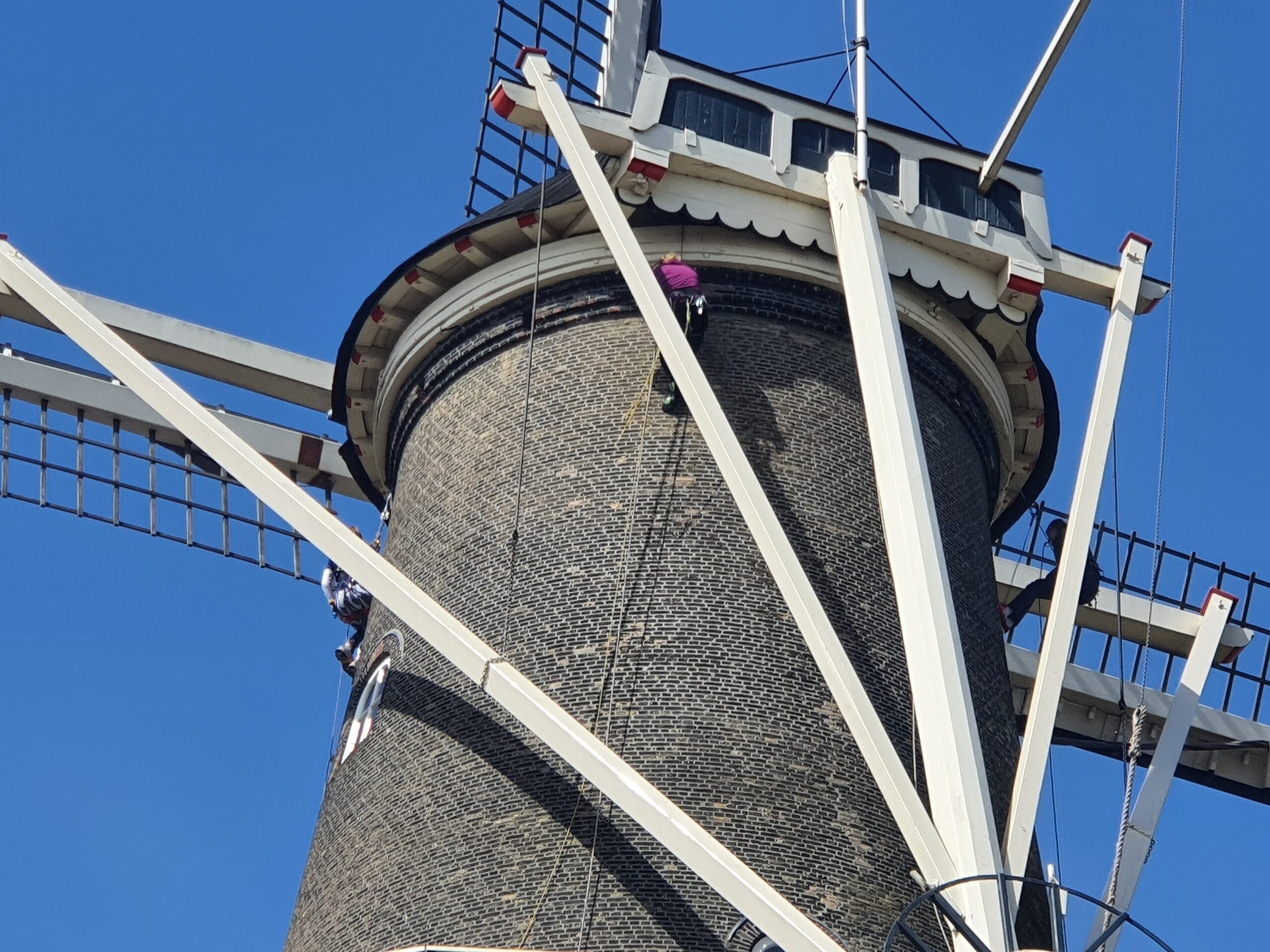 Eerst werd daarvoor een kabel rondom de molenromp bevestigd, waarna als eerste de rode vlag op z’n plek werd gehesen. Dat kunstje werd herhaald voor de kleuren wit en blauw. In de loop van de middag stond de molen in het rood-wit-blauw getooid te stralen in de Leidse lentezon.