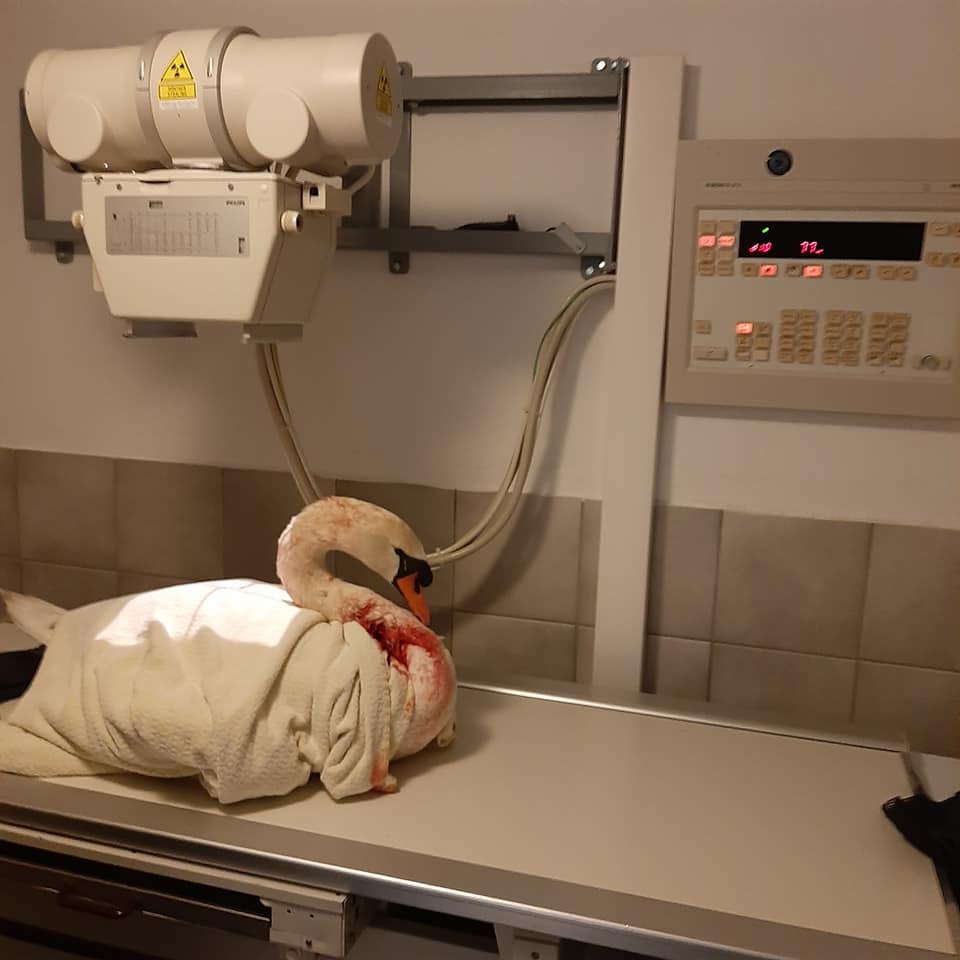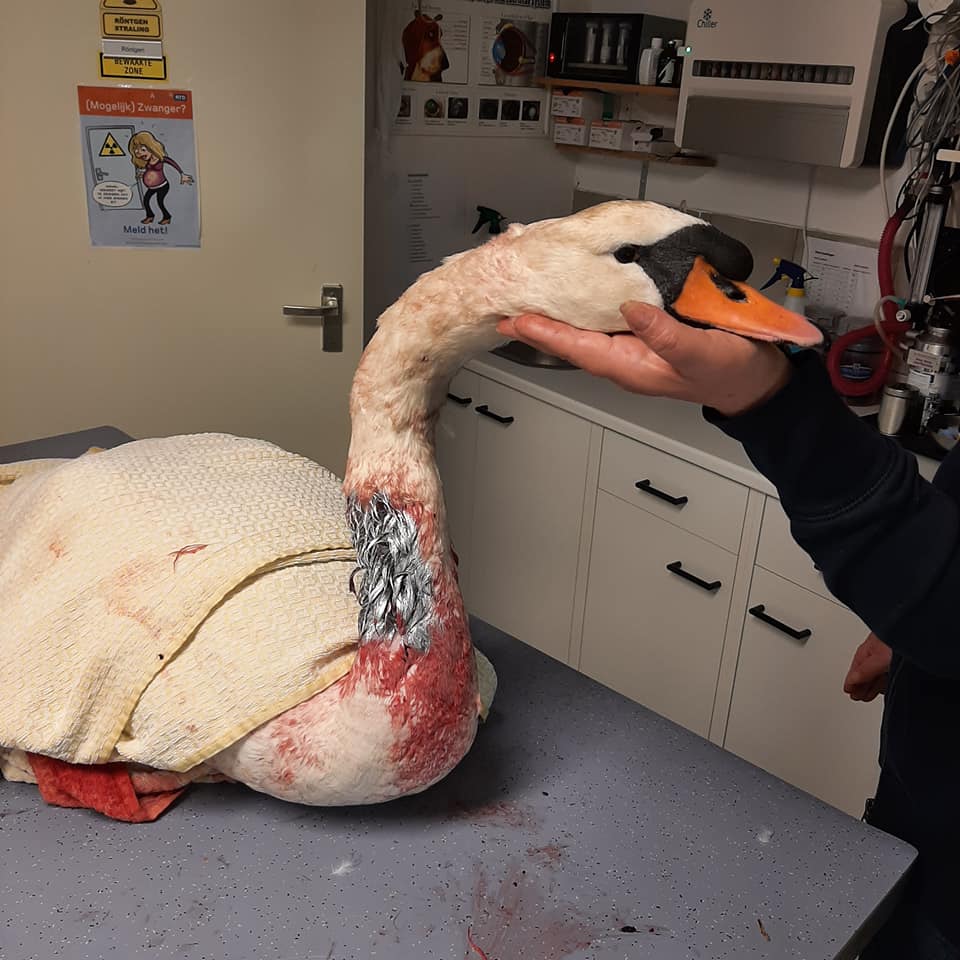 De zwaan is gevangen en bij de dierenarts behandeld. Ook zijn er röntgenfoto’s gemaakt. Haar verwondingen zijn veroorzaakt door een bijtwond. Waarschijnlijk van een grote hond. De zwaan werd aangevallen toen ze op haar nest zat. De eieren zijn door medewerkers van de dierenambulance teruggelegd in het nest. Daar zit de mannetjeszwaan nu te broeden. De zwaan wordt nu afgeschermd en het nest wordt nauwlettend in de gaten gehouden door de dierenambulance.