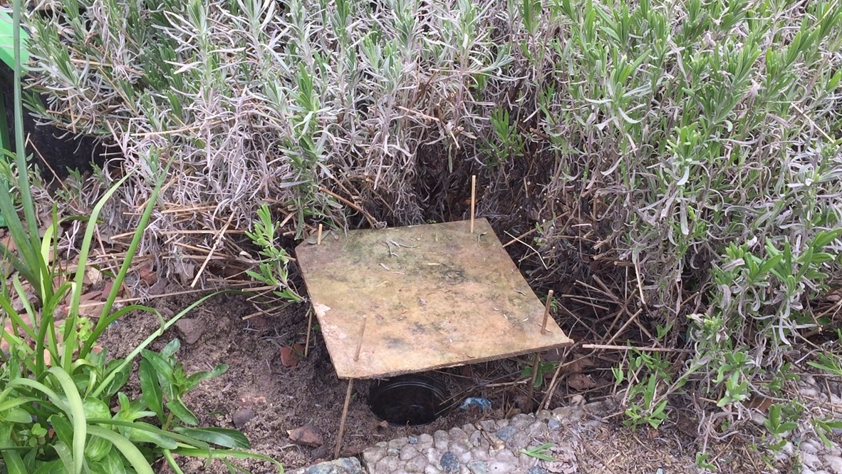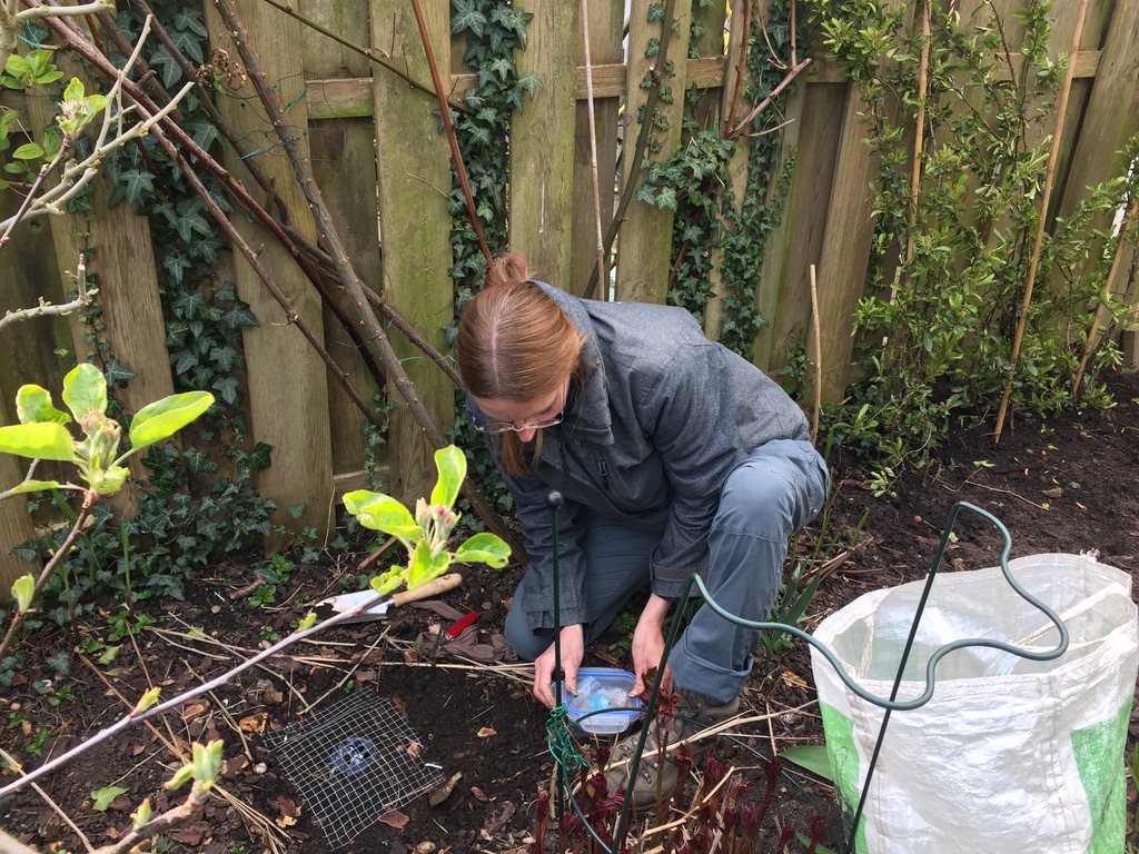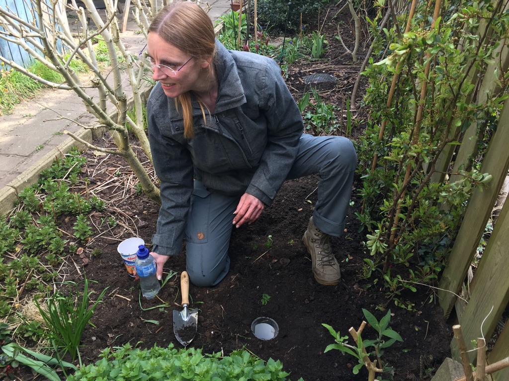 Aglaia Bouma is ondertussen druk in de weer om vier insectenvallen te plaatsen. Een gat graven zodat de beestjes er vanzelf invallen en niet een heuveltje hoeven te beklimmen. “Dan draaien ze om en nemen een andere route. Het aas stop ik in een panty, dan blijft het op zijn plek en komt de geur toch goed vrij.” Ze waarschuwt Antje nog even voor de stank. Bovenop de val komt een stukje gaas. Zo moet de val veilig zijn voor aanvallen van katten en de kraaien.