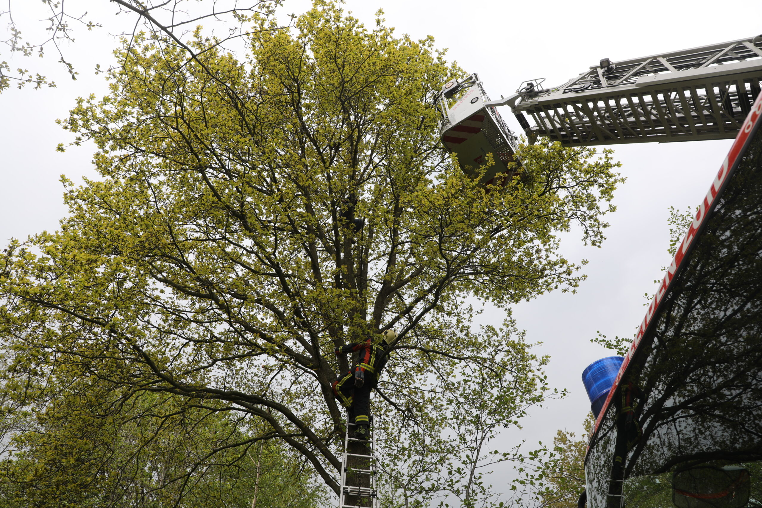 Om bij het tweetal in de boom te komen moest de brandweer een paar houten hekjes verwijderen. Het incident trok de nodige bekijks van voorbijgangers.