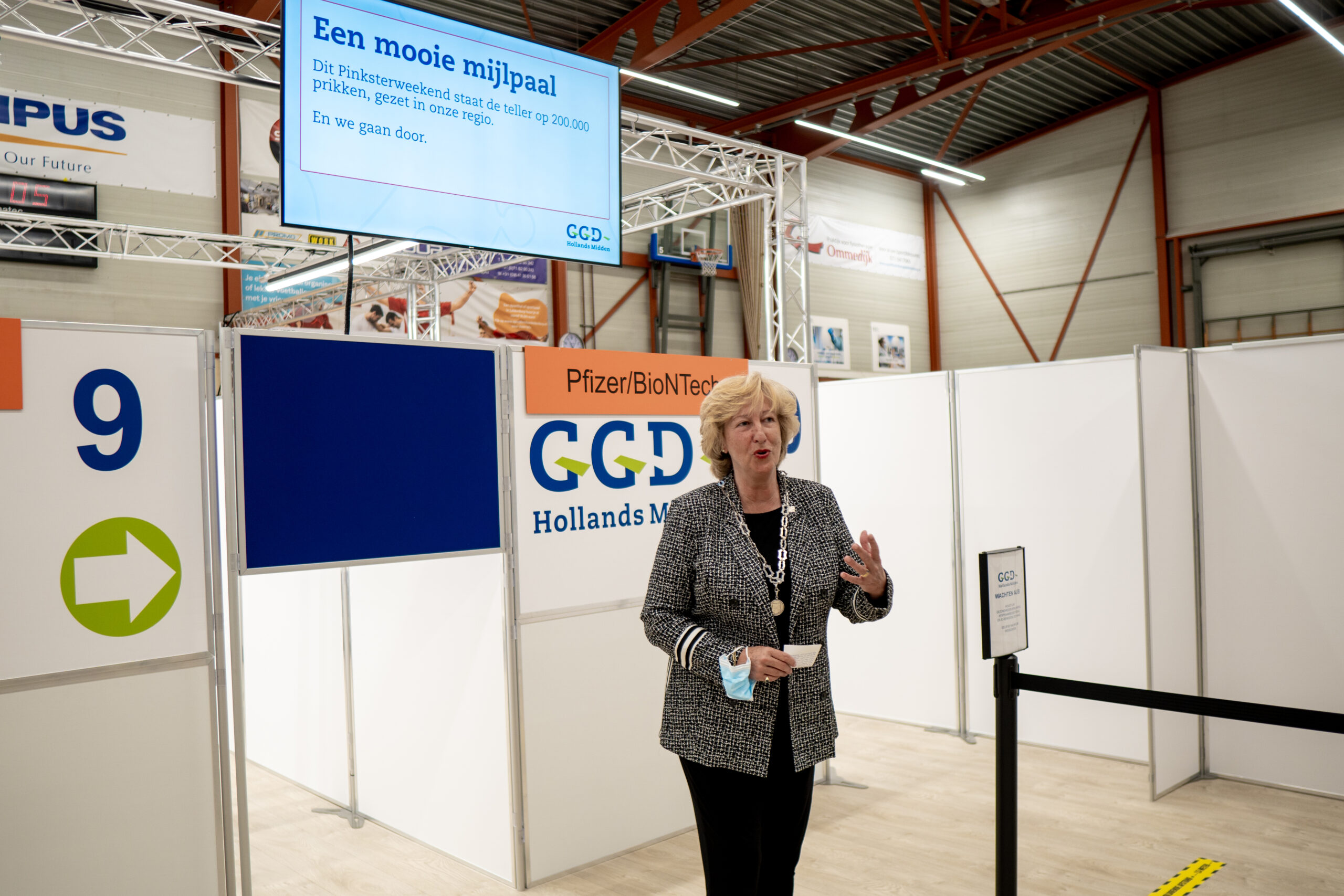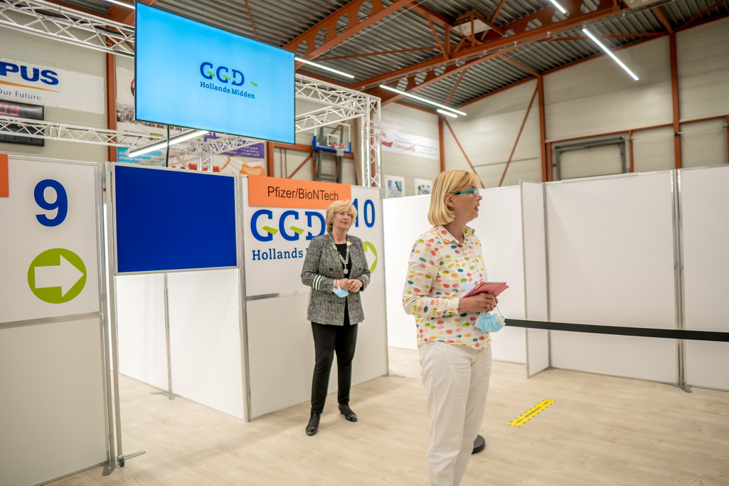 Sporthal De Bloemerd in Leiderdorp is maandagochtend in gebruik genomen als priklocatie van de GGD. Burgemeester Laila Driessen en GGD-projectleider Margreet Bekedam verrichtten samen de officiële opening. Er is ruimte om zo’n 1.800 mensen per dag te vaccineren tegen het coronavirus.