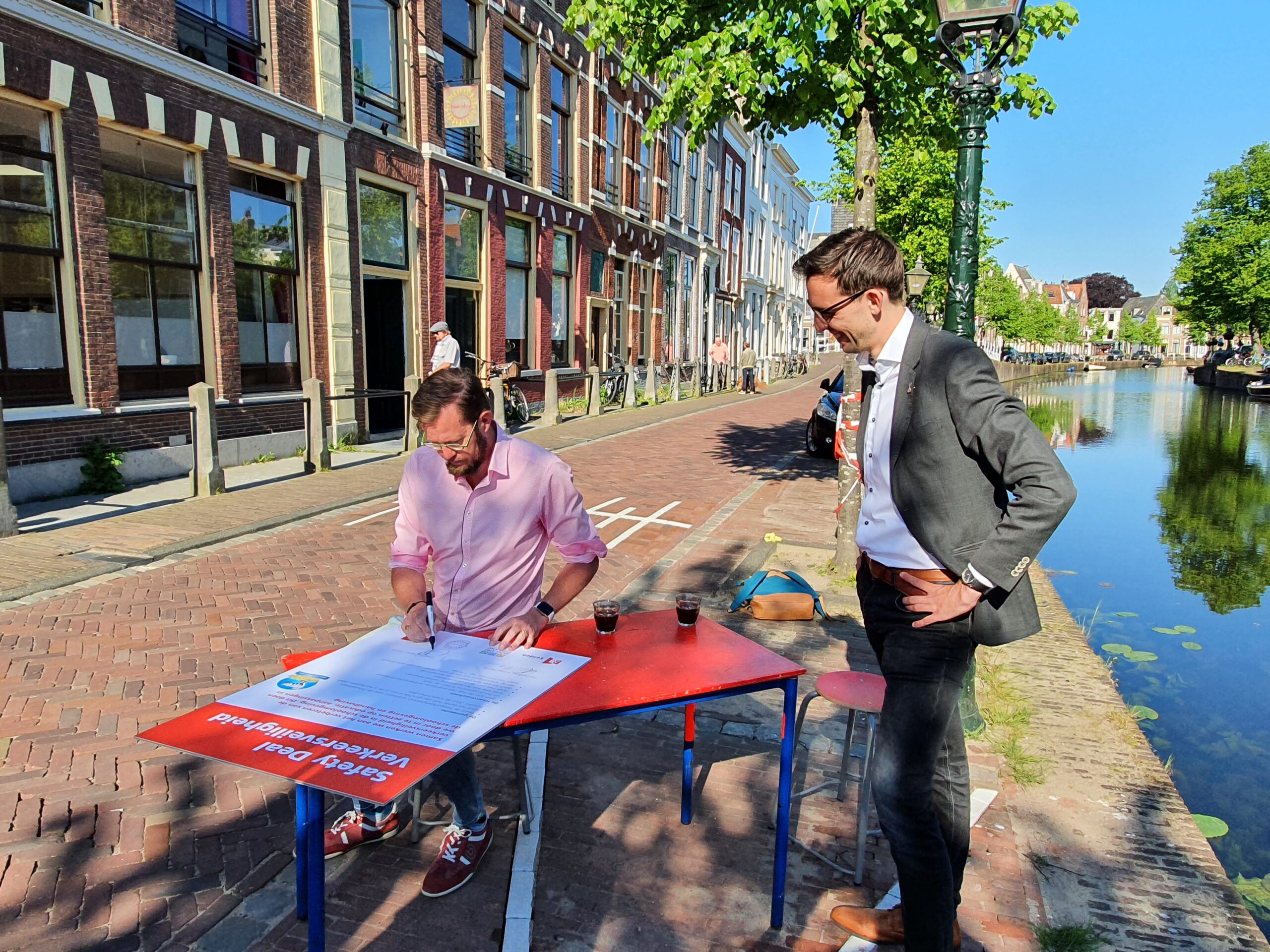 Naast de fysieke verplaatsing van de fietsenstalling, is er ook een serie afspraken gemaakt tussen de gemeente en de school. Die zijn vastgelegd in een ‘Safety Deal’ die vanmorgen werd ondertekend. Daarin belooft de gemeente om het komende jaar extra toezicht te houden op het autoverkeer rond te school op de momenten dat de leerlingen aankomen en weer naar huis gaan. De school op haar beurt zet in op verkeersonderwijs uit het programma ‘School op Seef’ en gaat meedoen aan verkeersexamens. Ook komen er ‘dodehoeklessen’ en zorgt de school ervoor dat de gestalde fietsen geen overlast veroorzaken bij het Heilige Geesthofje waar de nieuwe stalling is aangelegd.