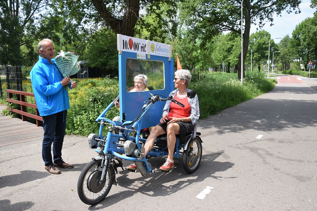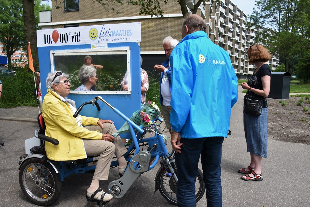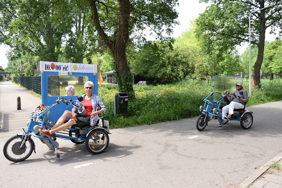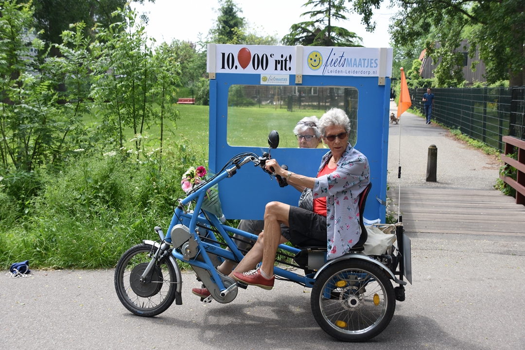 Elly Meijer en haar 89-jarige fietsmaatje Pieta Liefers hebben deze week de 10.000ste rit voor Fietsmaatjes LeidenLeiderdorp volbracht. De mijlpaal is 4,5 jaar na de start van Fietsmaatjes LeidenLeiderdorp bereikt. Inmiddels trekken 350 vrijwilligers met 450 gasten er gemiddeld eens per veertien dagen samen op uit.