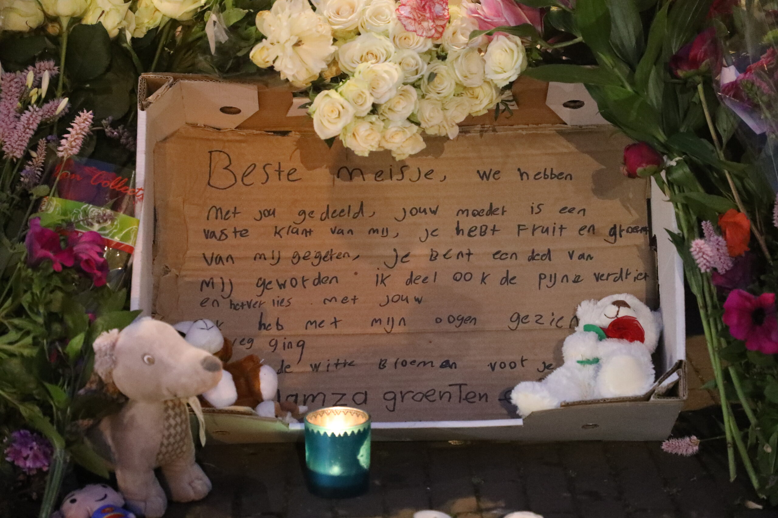 Aan het einde van de middag kwamen de eerste mensen naar de plek van het ongeval om bloemen neer te leggen. Martkoopman Hamza, die vanwege de coronamaatregelen tijdelijk op de Beestenmarkt staat, schreef een ode aan het jonge kind. “Beste meisje”, schrijft de koopman die het ongeval zag gebeuren, “je hebt fruit en groente van mij gegeten, je bent een deel van mij geworden. Ik deel de pijn, het verdriet en het verlies met jou.”