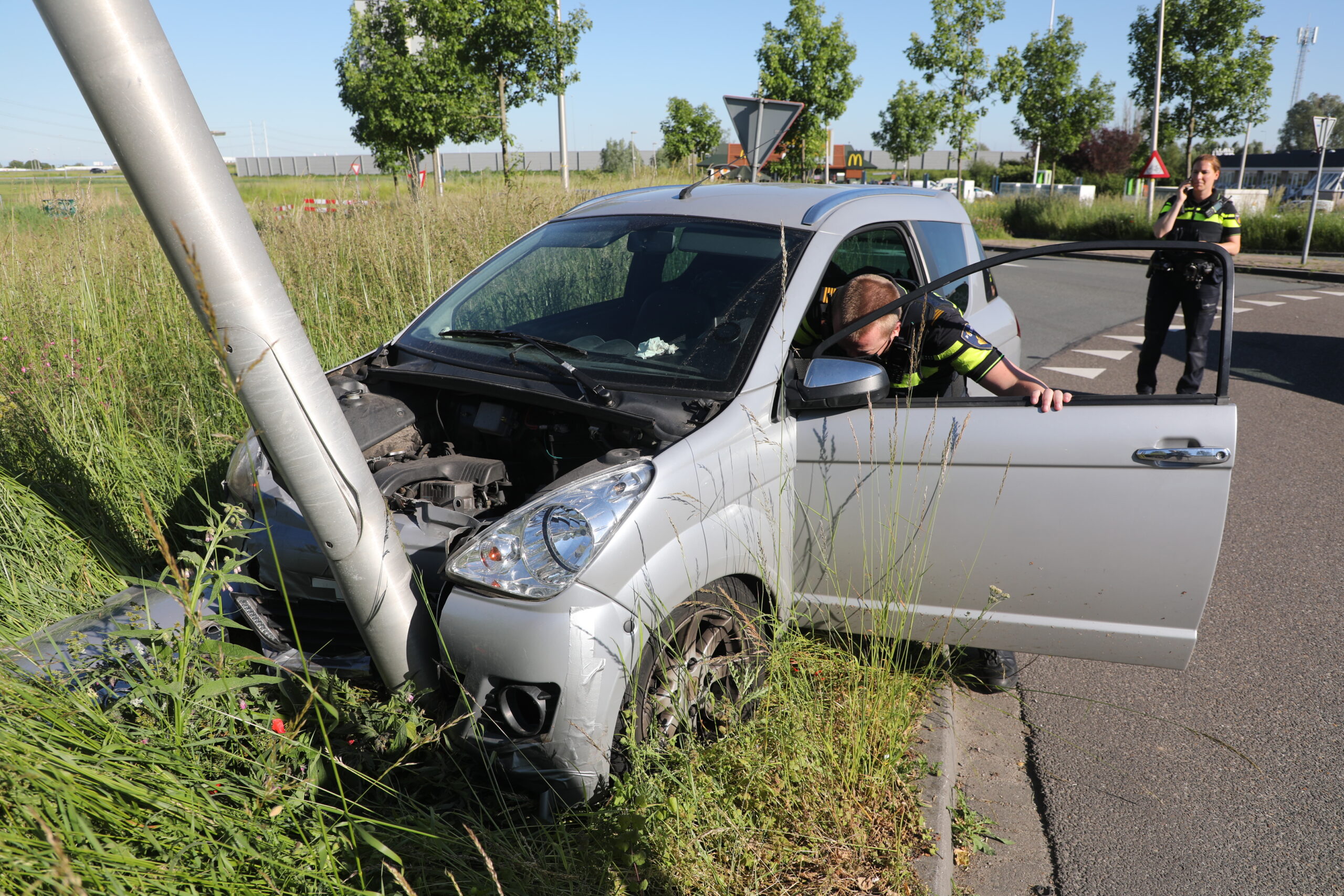 De politie heeft de brommobiel met de hulp van enkele aanwezige fotografen teruggeduwd op het parkeerterrein van het hamburgerrestaurant. Het voertuig liep aanzienlijke schade op. Net als de lantaarnpaal.