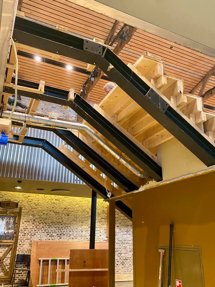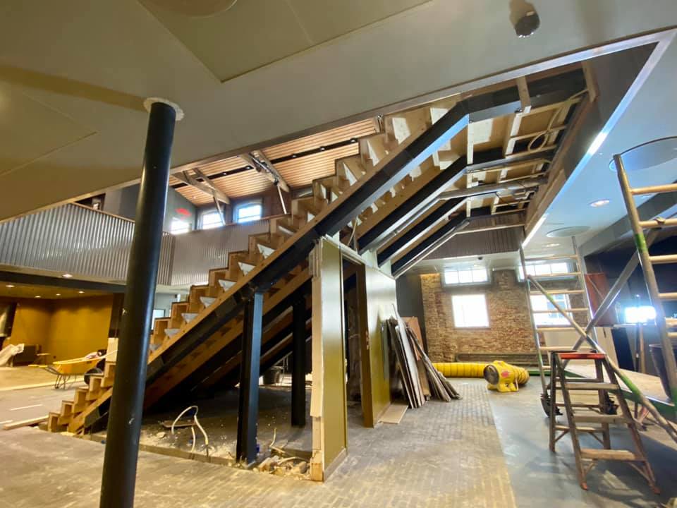 De kenmerkende trap in de foyer van Gebr. de Nobel is grotendeels gesloopt. Het is het meest in het oog springende deel van de verbouwing van de entreeruimte van het popcentrum in de Marktsteeg.