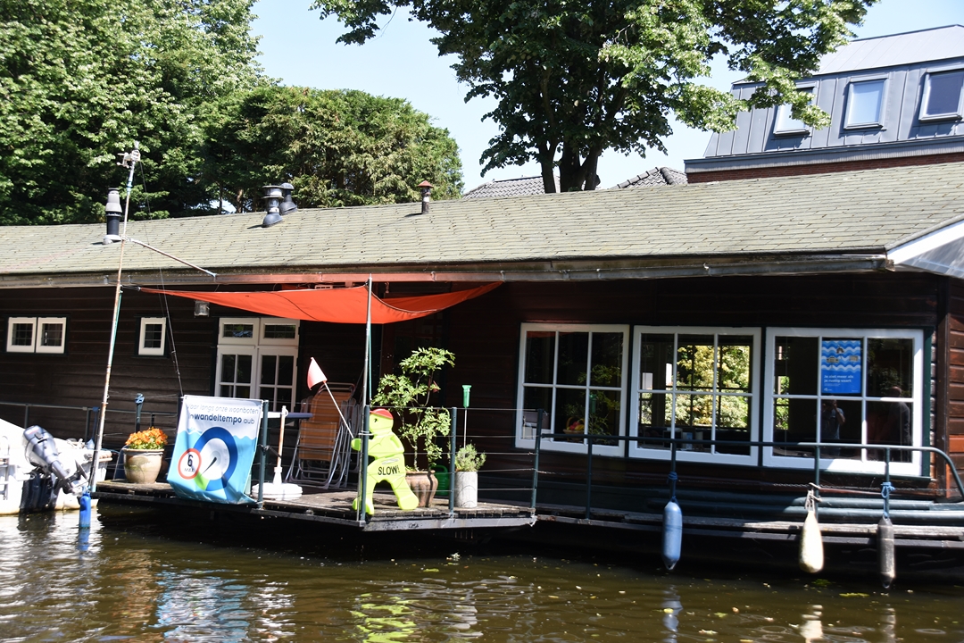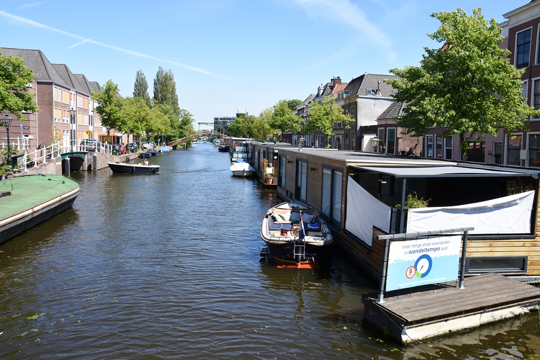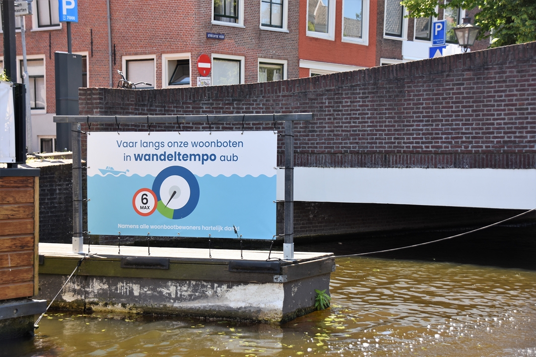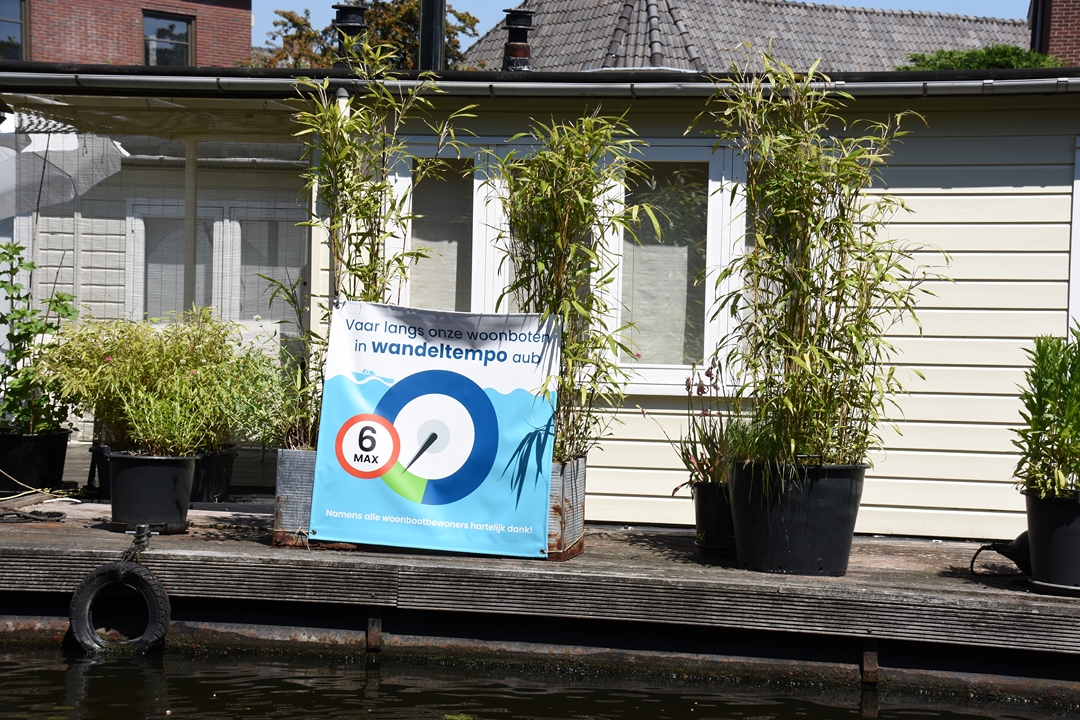 Al jaren vragen woonbootbewoners in Leiden de plezierbootjes om rustig te varen. Dit seizoen doen ze dat met spandoeken. Opdat het niemand ontgaat dat je maar zes kilometer per uur mag op de Leidse wateren.