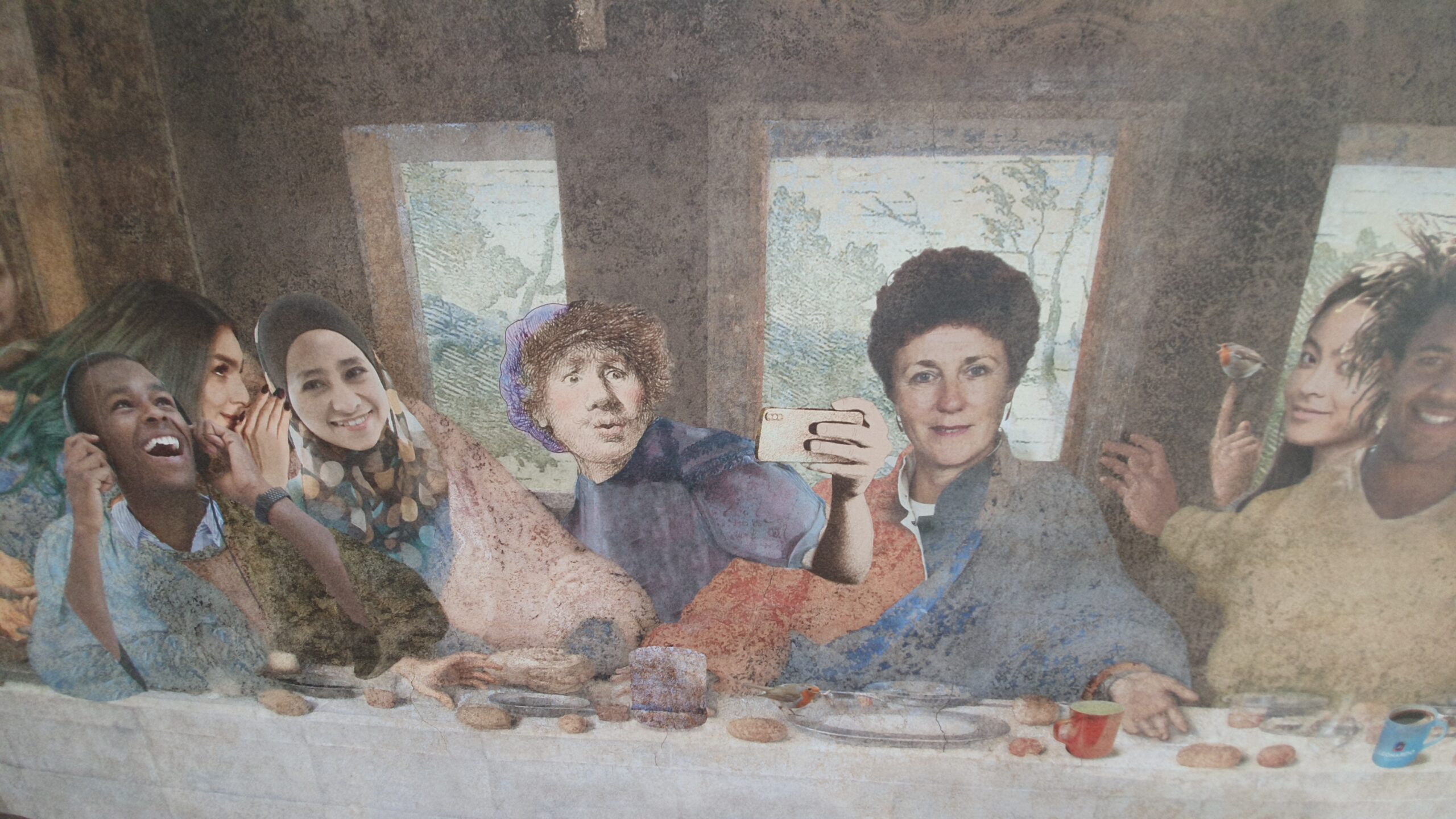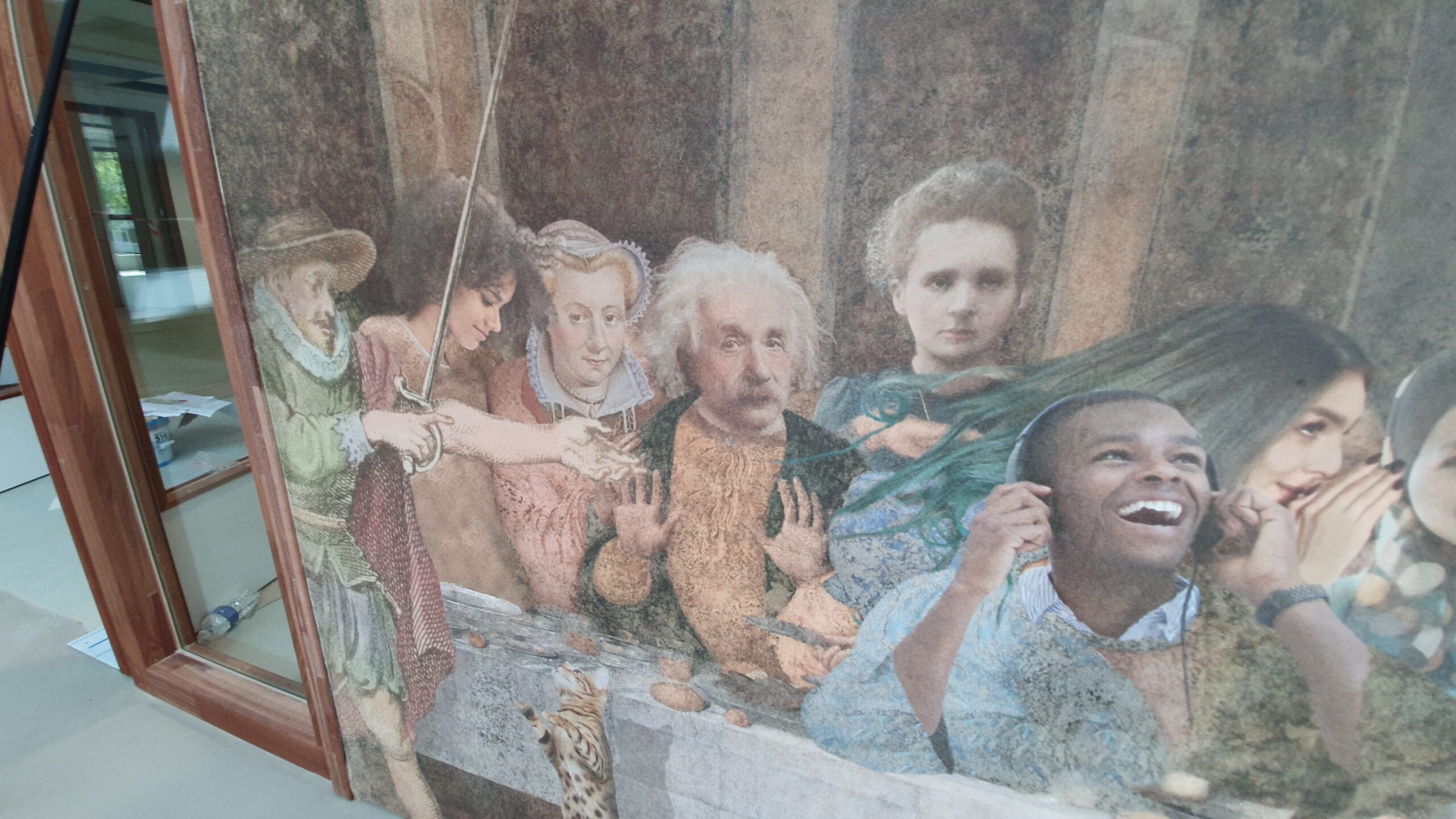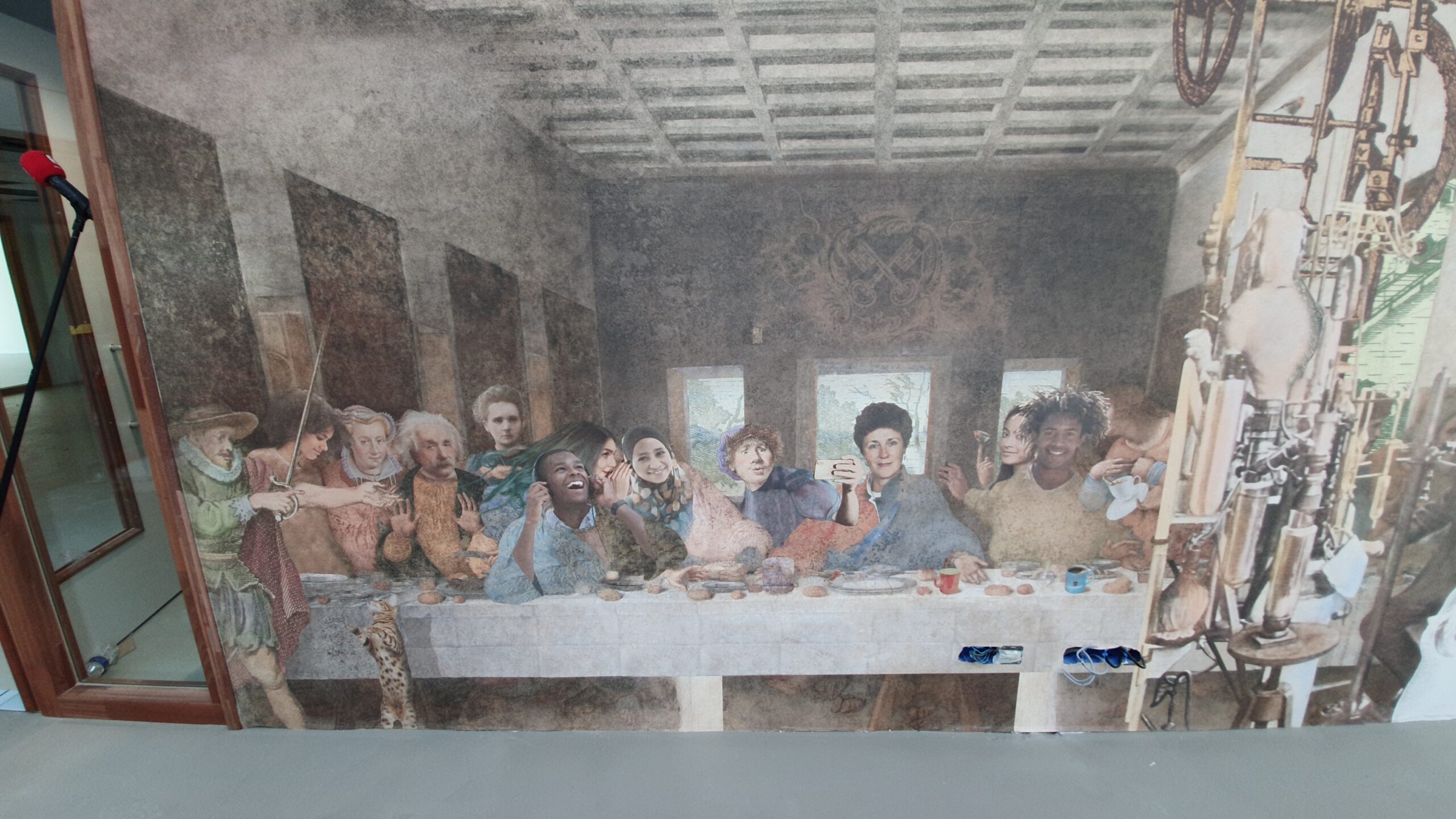 Onderdeel van het enorme werk is een speciale versie van het fresco het Laatste Avondmaal van Leonardo da Vinci. “We hebben er het Leidse Avondmaal van gemaakt,” vertelt Koutouras terwijl ze enkele bijzonderheden in het werk aanwijst. Aan tafel bekende Leidenaren als Kamerlingh Onnes, Rembrandt en burgemeester Van der Werf. Maar ook prominenten die een band hadden met de stad. Einstein bijvoorbeeld, en Madame Curie. Een bijzondere gast aan tafel is Ria Mooij die veel voor de school heeft betekend. Ze was de onvergetelijke oud-rector die vlak na haar pensionering in 2006 te vroeg overleed. Zij had altijd oog voor alle leerlingen en collega’s en vanuit het kunstwerk zal zij dat blijvend doen.