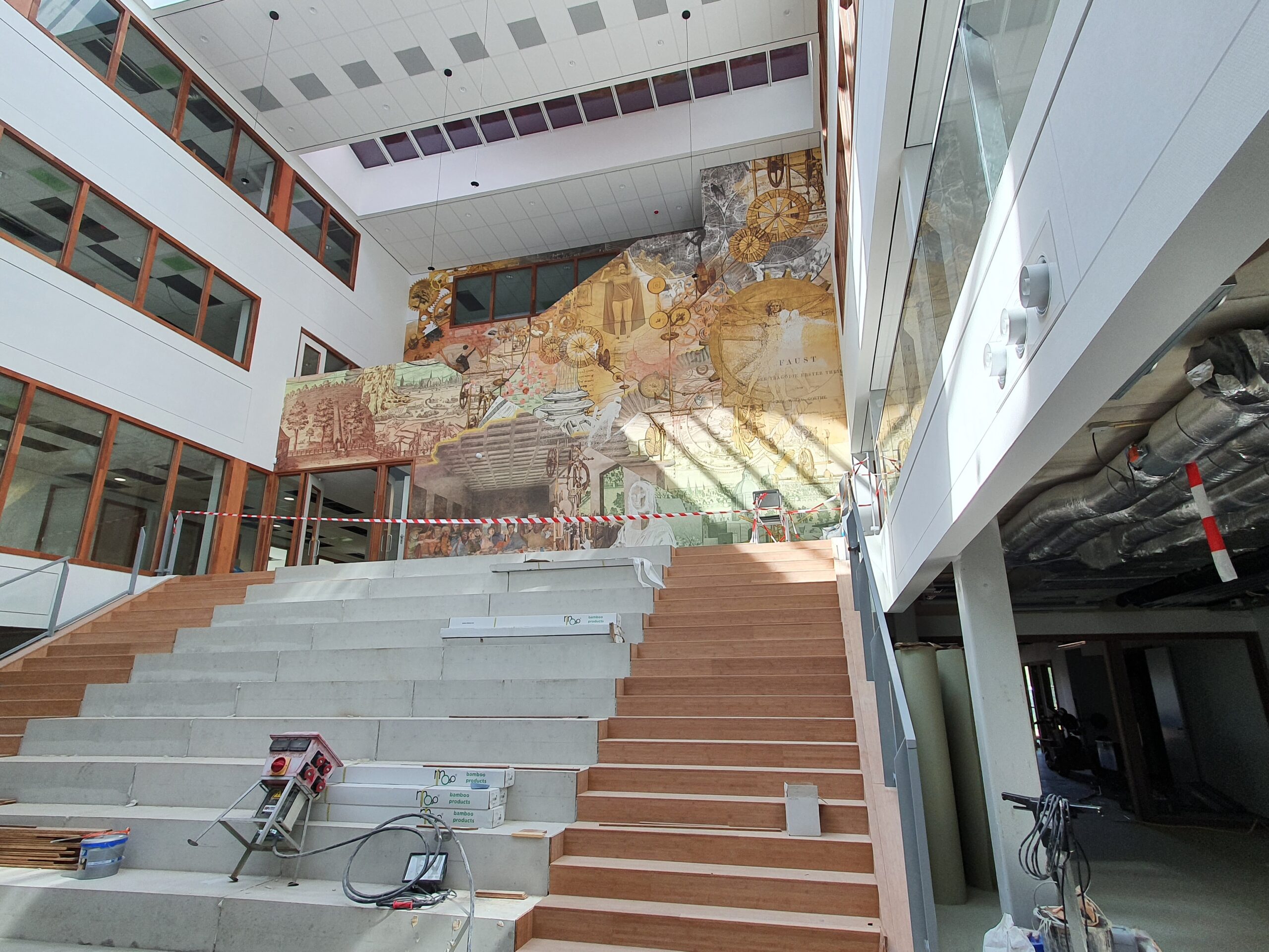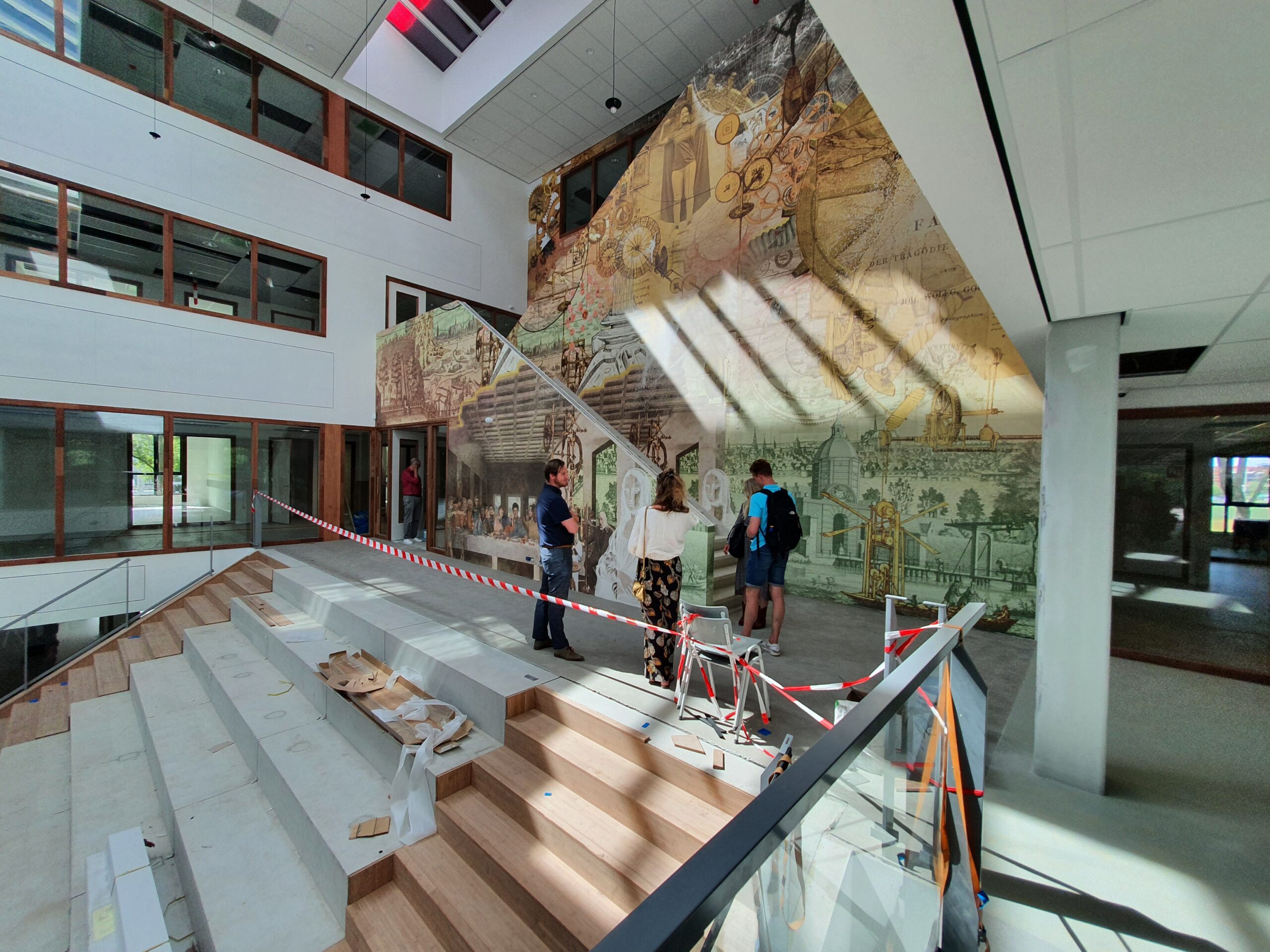 Bijna een jaar na het slaan van de eerste paal werd deze week een ‘eerste oplevering’ bij het Leonardo College gevierd. Zo noemt directeur Wim van der Veer de onthulling van een tien meter hoog kunstwerk in de stijl van de naamgever van de school.