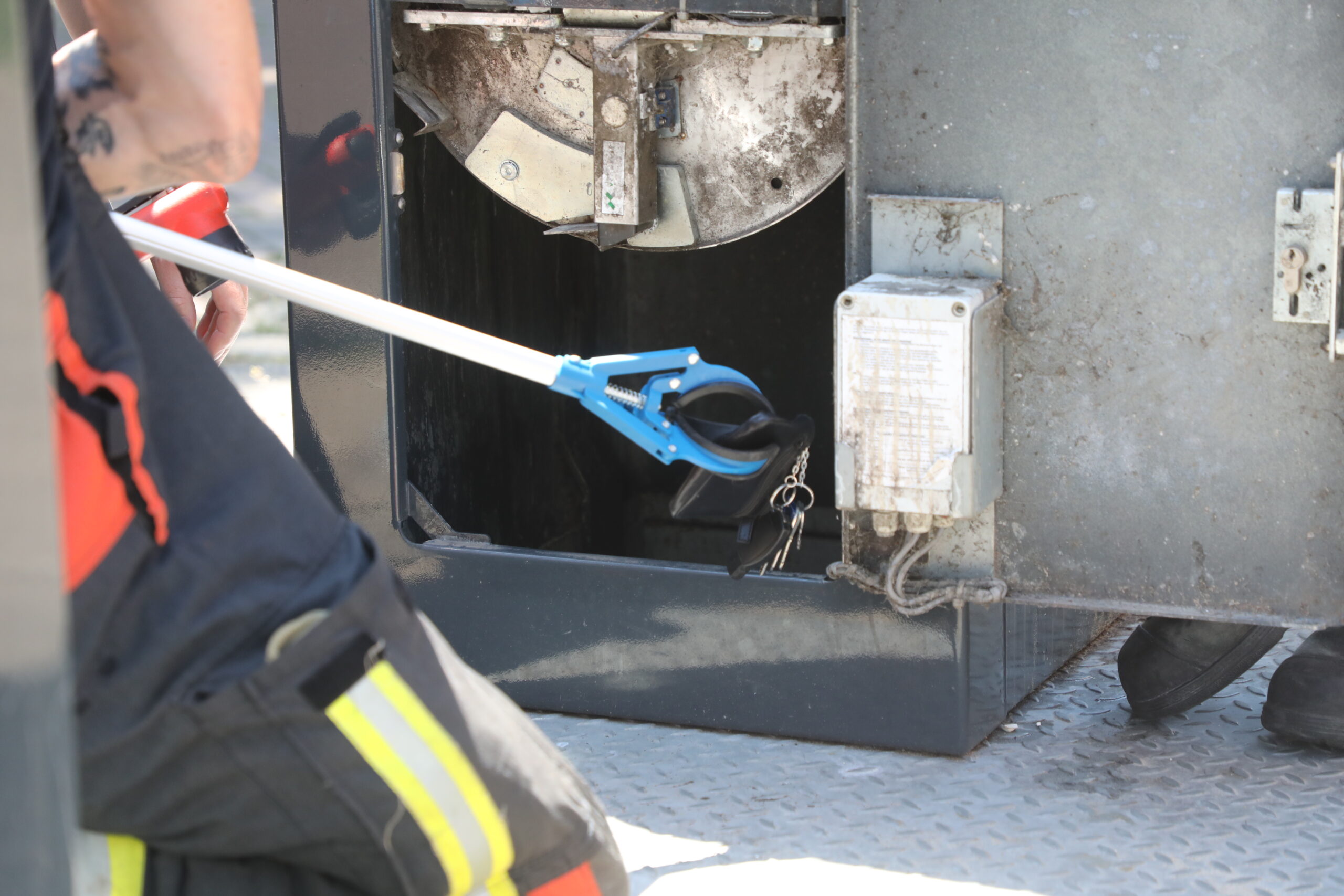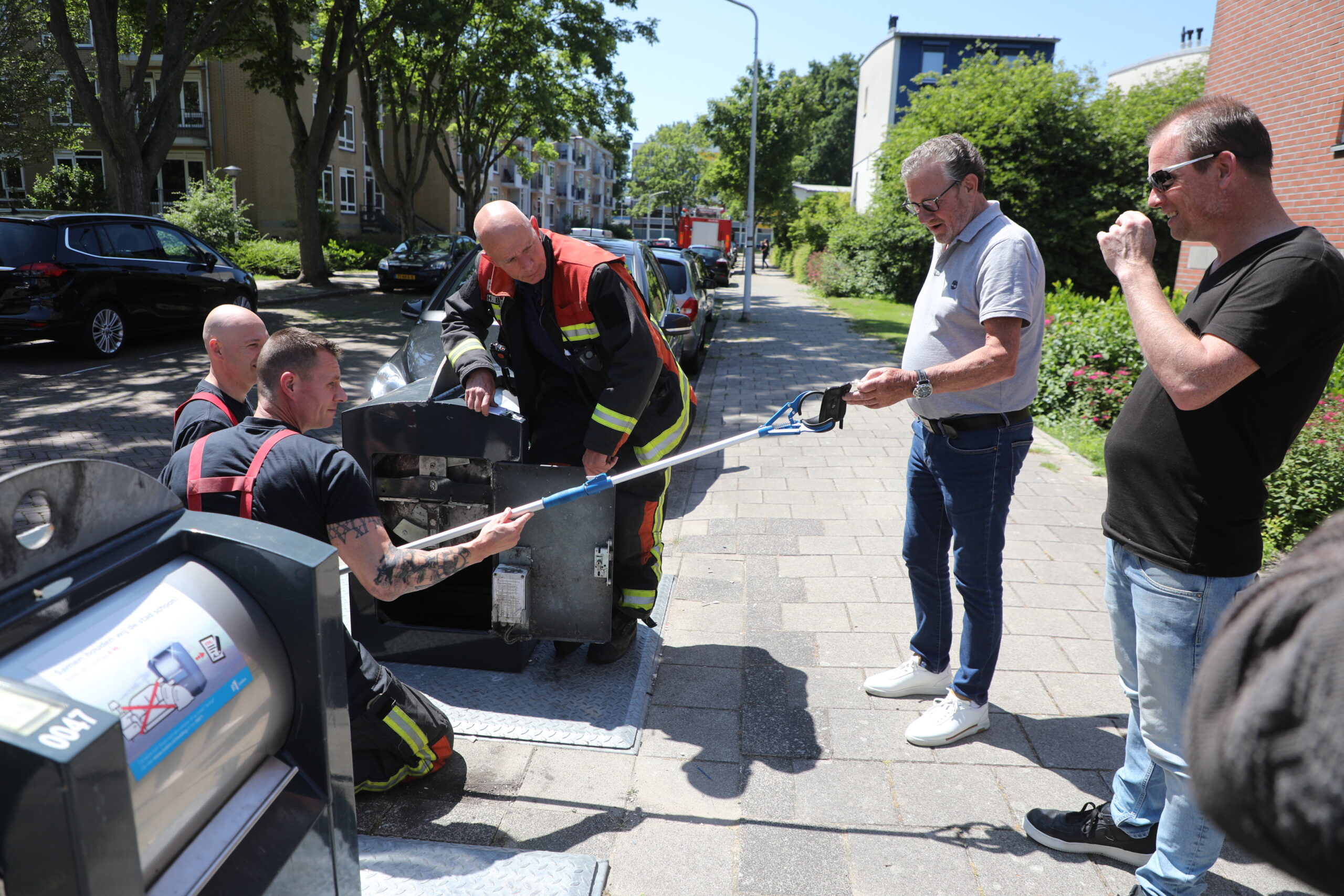 De brandweer schoot de pechvogel te hulp en viste de sleutelbos met een lange grijparm uit de container. De dolgelukkige man bedankte de brandweer van Leiden Noord en is meteen een appeltaart gaan halen voor op de brandweerkazerne.