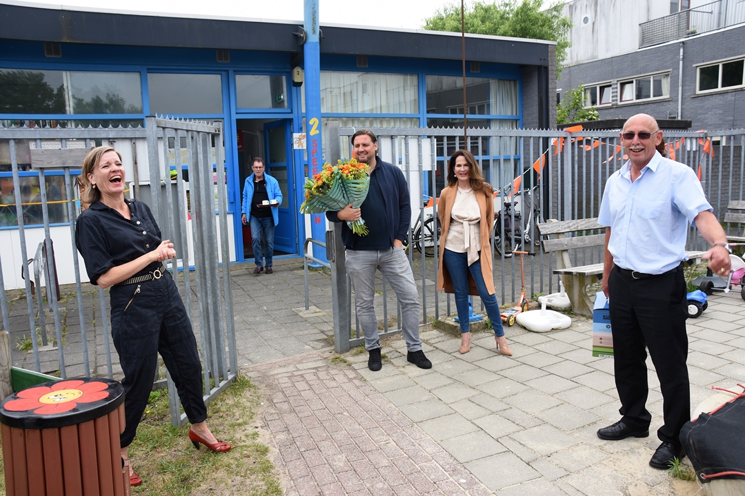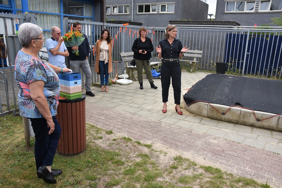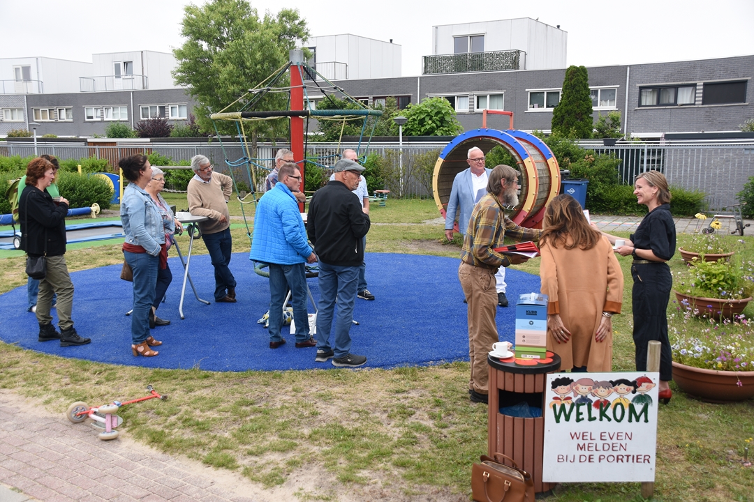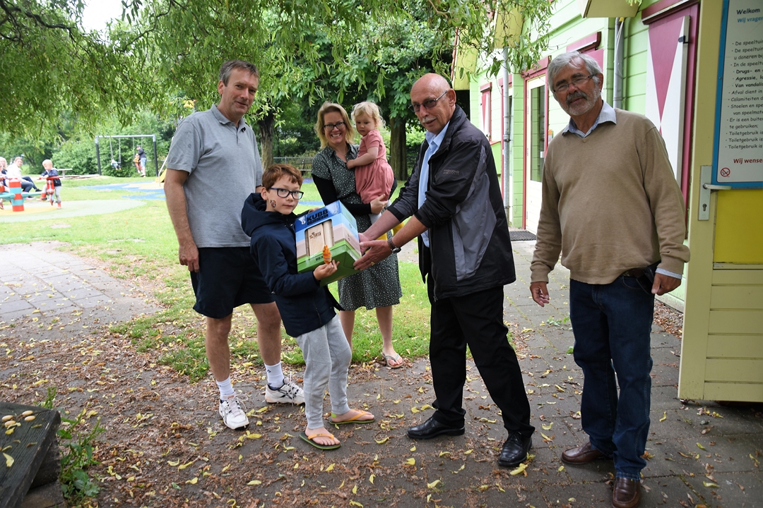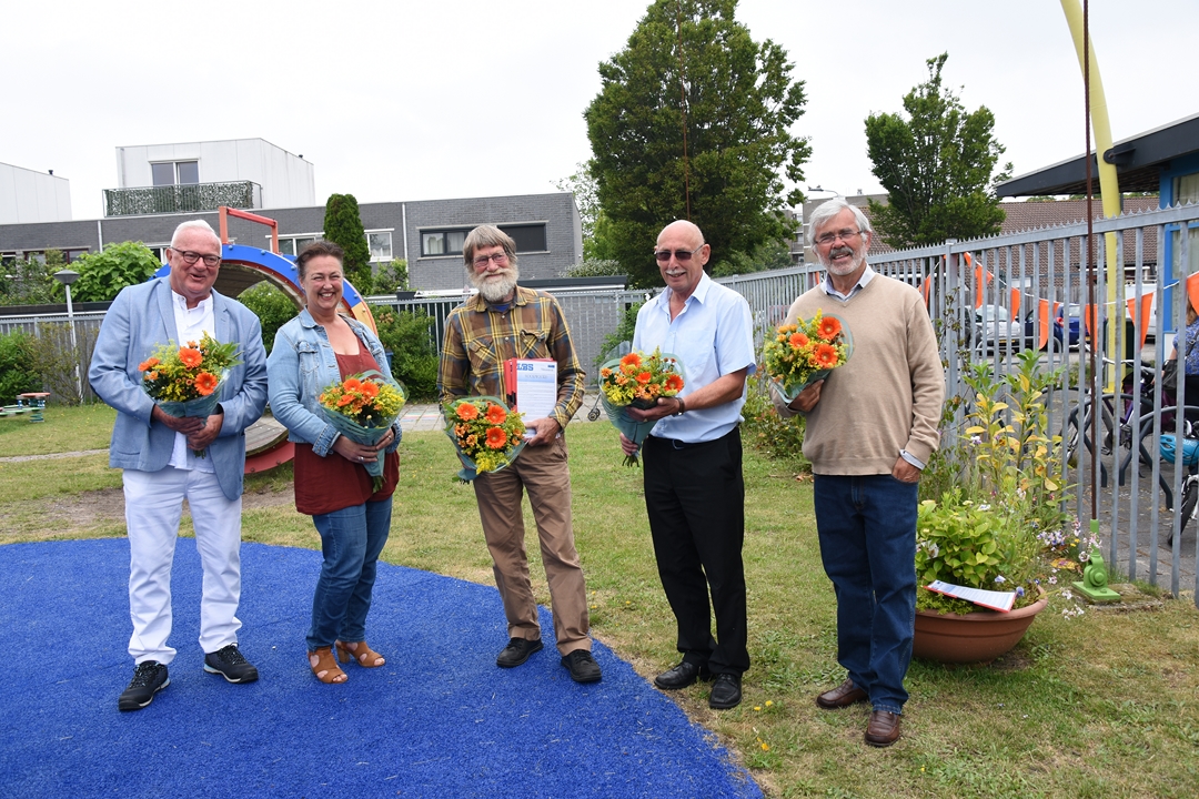 De bestuursleden van de jubilerende vereniging – John van Haasteren, Roos van Gelderen, Frans Ballering, Nico Massaar en Guus Ceulemans – gingen in twee groepen op pad om bij alle speeltuinen een presentje uit te delen. Bij Speeltuinvereniging De Stevenshof aan het Carry van Bruggenpad kwam iedereen samen. Daar was ook wethouder Marleen Damen om namens de LBS aan het speeltuinbestuur van SV de Stevenshof het spel aan te bieden. Het werd in ontvangst genomen door Clemi Frankhuizen die daar al decennialang actief is.
