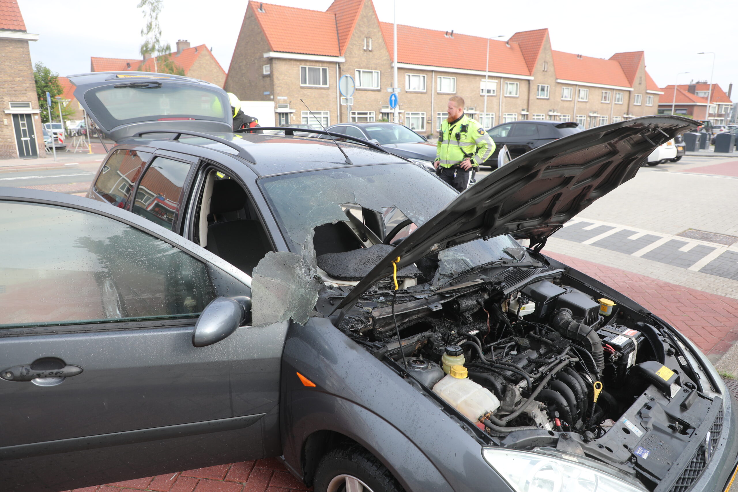 Voor de veiligheid van andere voertuigen is de auto door een omstander naar voren geduwd. De brandweer heeft de brand geblust.