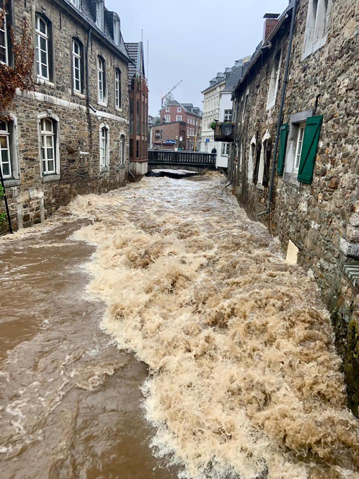 Maar die pracht wordt ruw verstuurd door de sirenes van brandweerwagens. Ze beginnen met het uitrollen van slangen om kelders leeg te pompen. Daarna zien we ze een brug afzetten met roodwit lint. En een paar minuten later rijdt de politie door de straat: ‘Achtung, Achtung’ klinkt het dreigend, we moeten de binnenstad met spoed verlaten. De Vichtbach, die door Stolberg stroomt dreigt buiten zijn oevers te treden. Winkels en horeca sluiten hun deuren. Op een holletje stappen we naar onze auto. We verlaten een stad waarvan we voelen dat er weldra veel verdriet is over schade. Van slachtoffers zijn we ons dan nog niet bewust.
