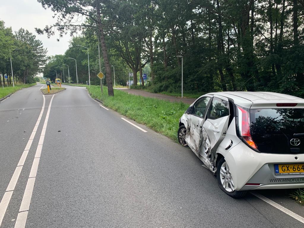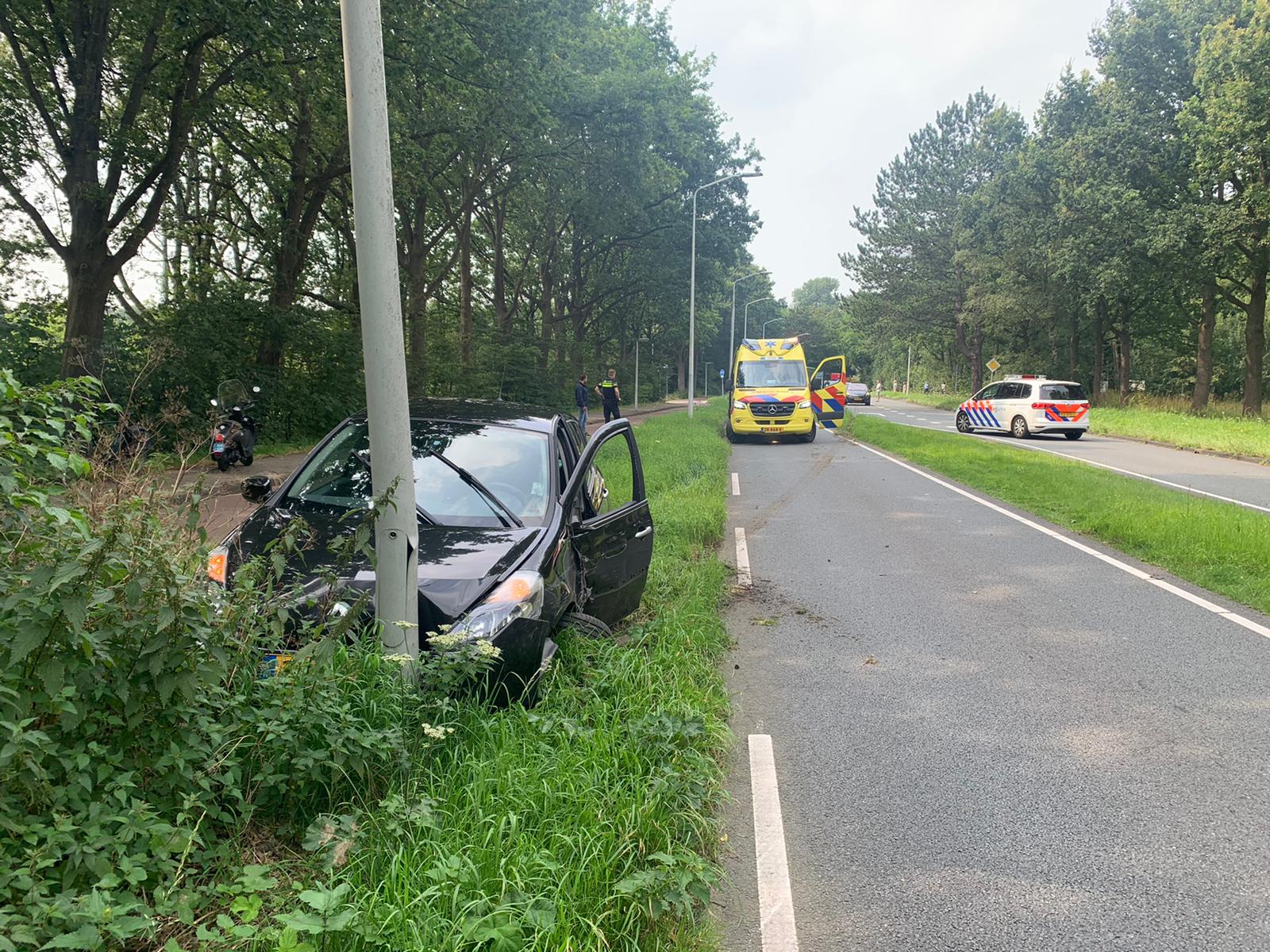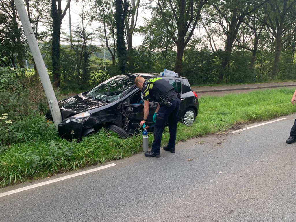 Op de Oegstgeesterweg tussen Leiden en Oegstgeest heeft een automobilist rond 15.15 uur een tegemoetkomende witte auto geschampt. Die (witte) auto spinde en kwam achterstevoren in de berm terecht. De bestuurder van de zwarte auto is vervolgens links langs de vluchtheuvel gereden en vanaf de linkerbaan via de middenberm weer naar zijn eigen weghelft gereden. Daar is hij tegen een lichtmast gebotst.