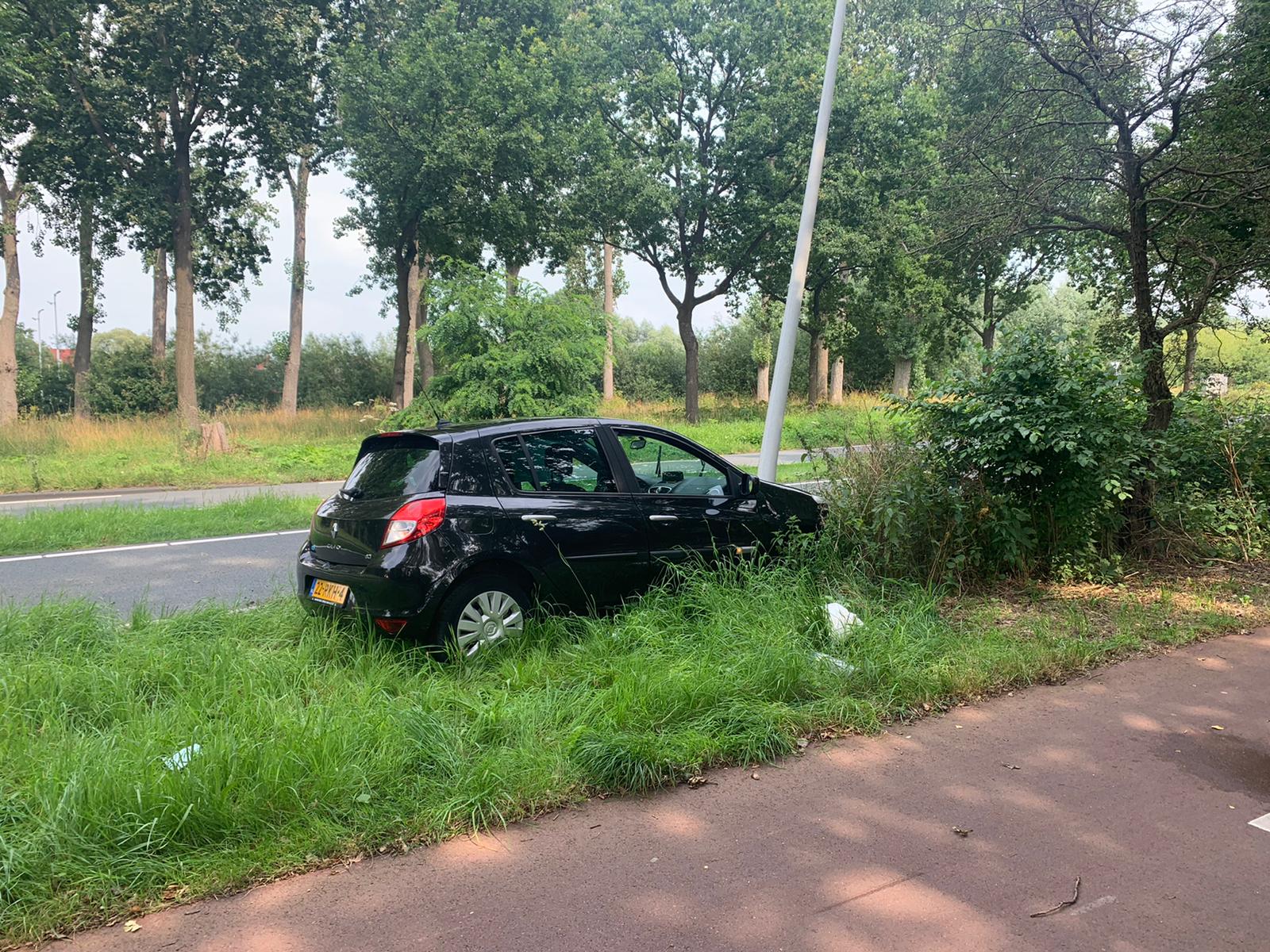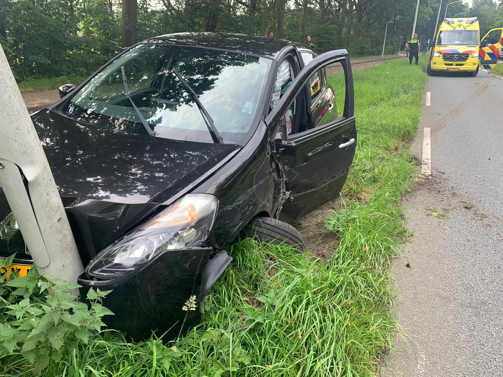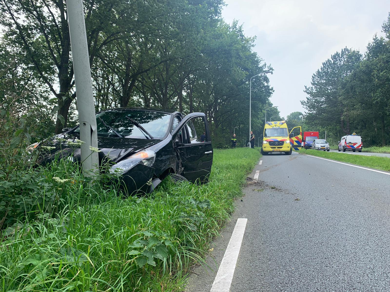 Op de Oegstgeesterweg tussen Leiden en Oegstgeest heeft een automobilist rond 15.15 uur een tegemoetkomende witte auto geschampt. Die (witte) auto spinde en kwam achterstevoren in de berm terecht. De bestuurder van de zwarte auto is vervolgens links langs de vluchtheuvel gereden en vanaf de linkerbaan via de middenberm weer naar zijn eigen weghelft gereden. Daar is hij tegen een lichtmast gebotst.