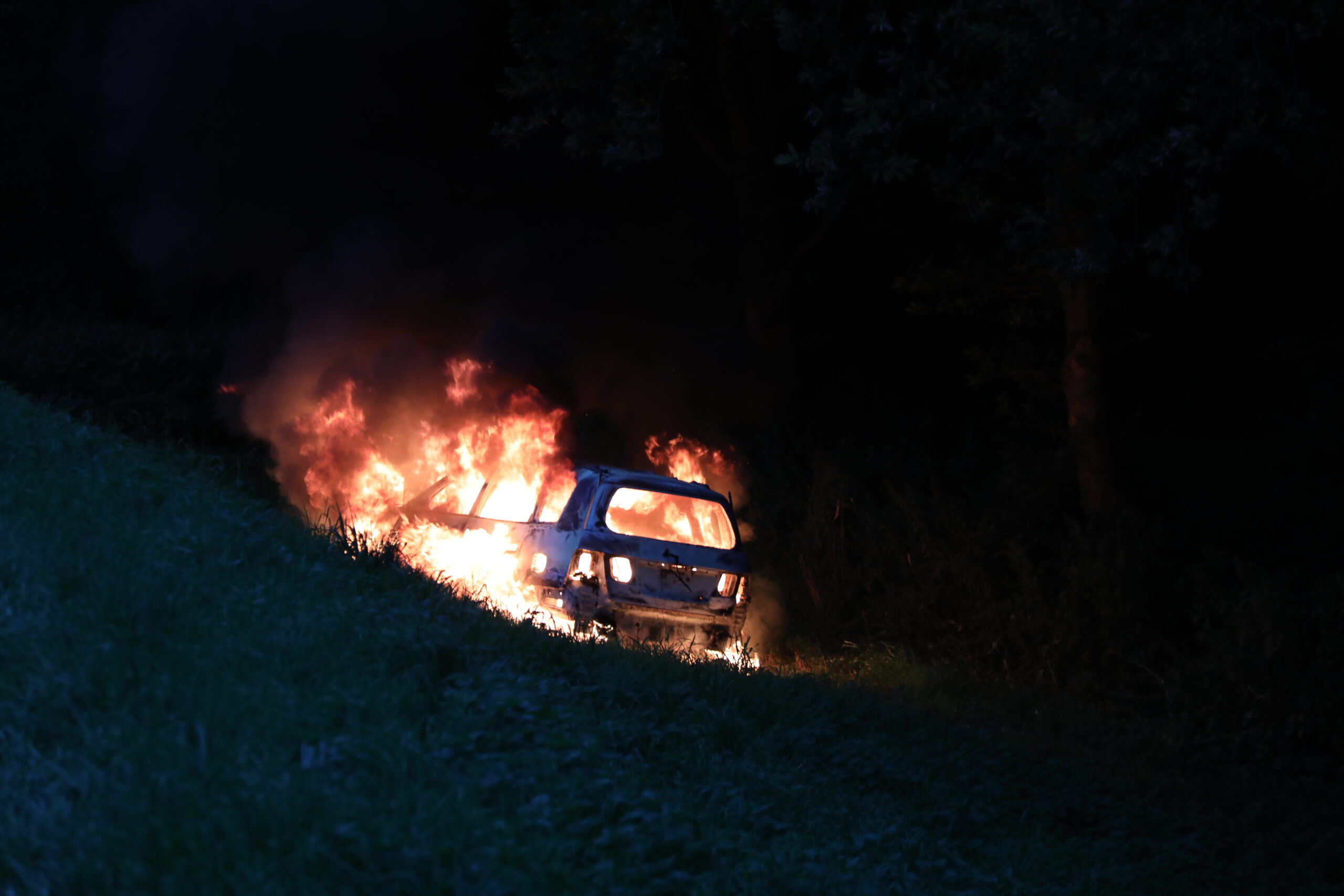 In de berm langs het Meeslouwerpolderpad in recreatiegebied Vlietland is vanmorgen vroeg een brandende auto met Pools kentekenplaten aangetroffen. De brandweer werd even na 6.00 uur gewaarschuwd, maar kon niet voorkomen dat het voertuig helemaal uitbrandde.