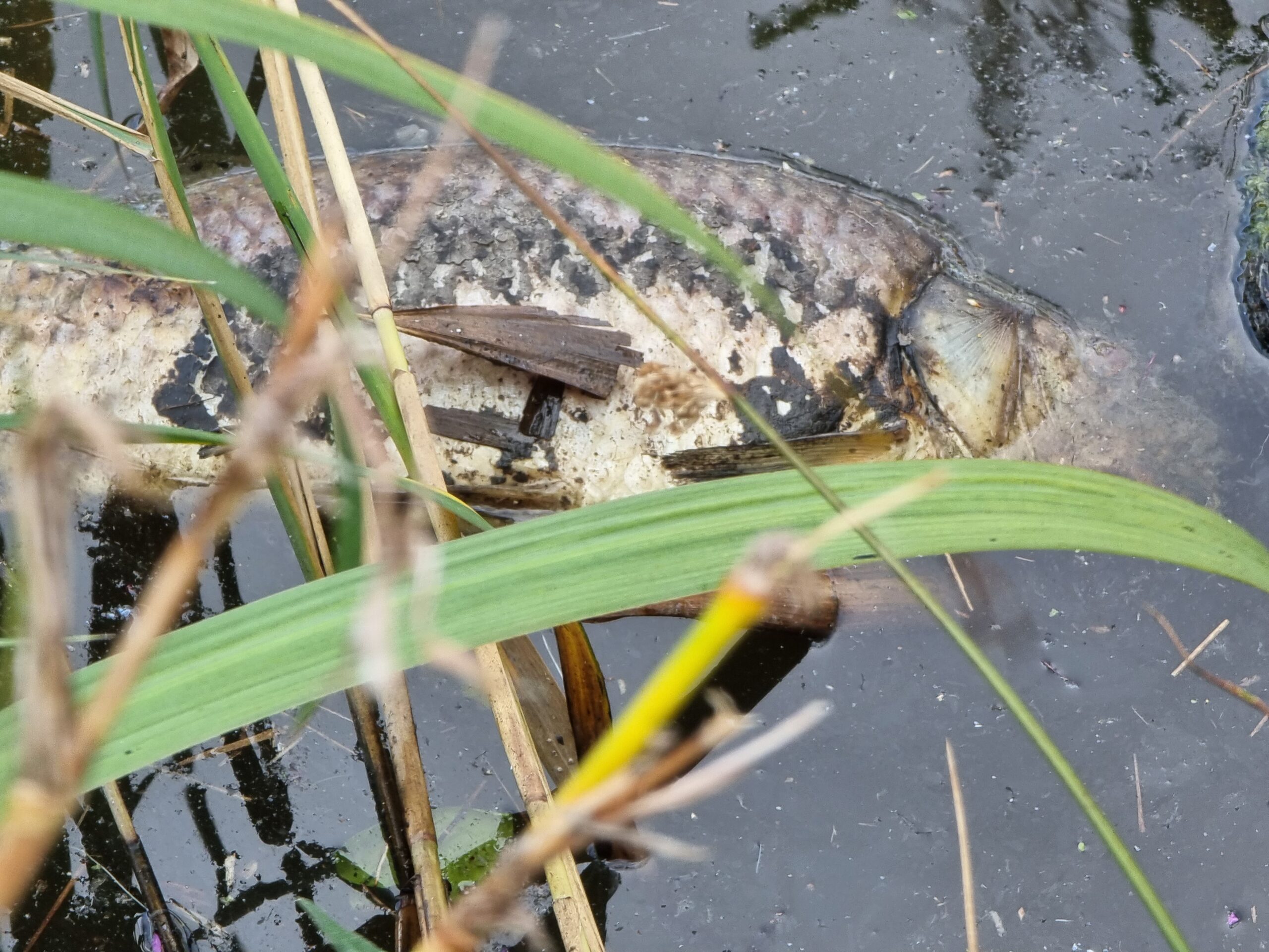 Overal waar je kijkt drijven rottende karkassen van karpers.