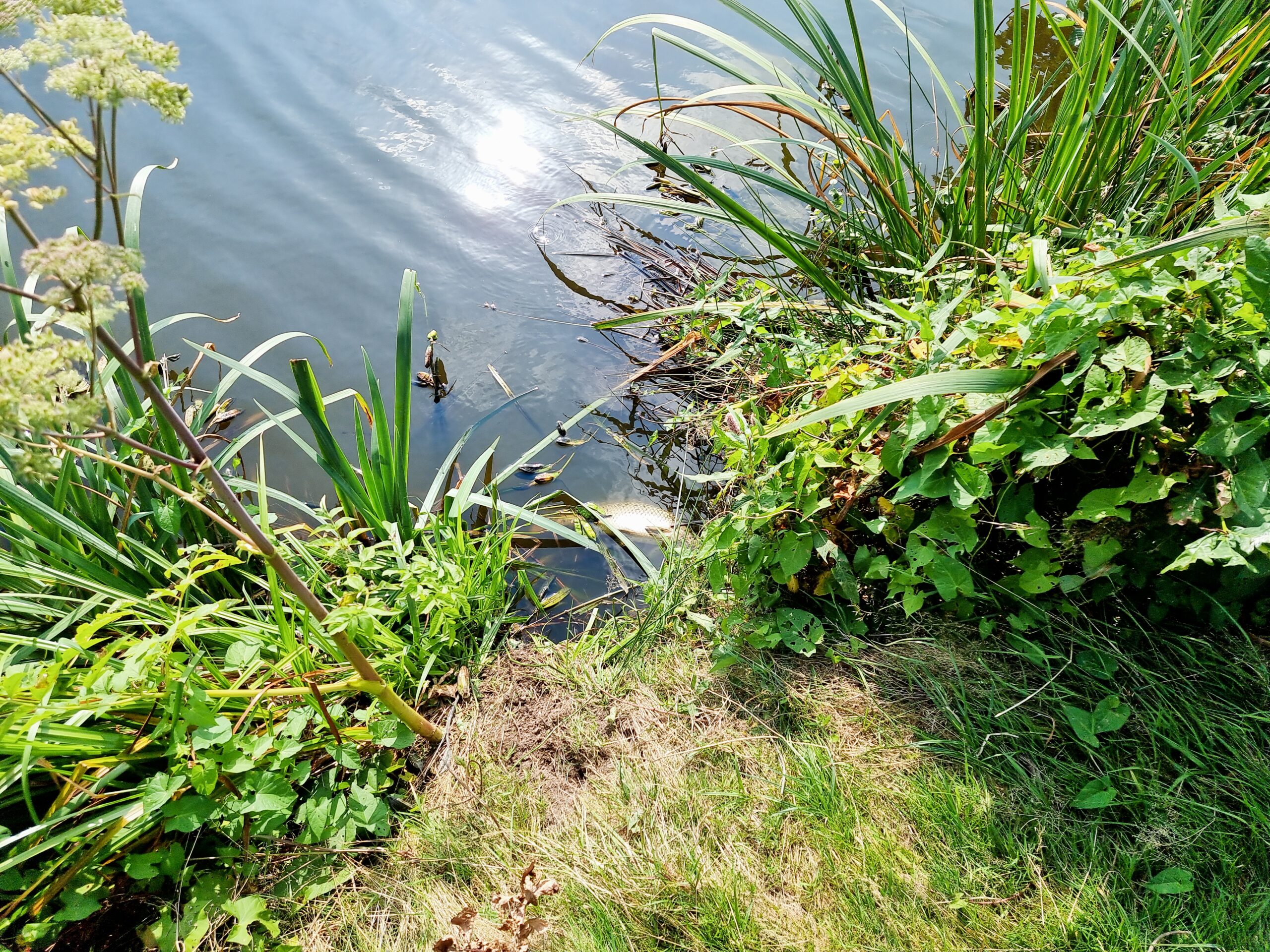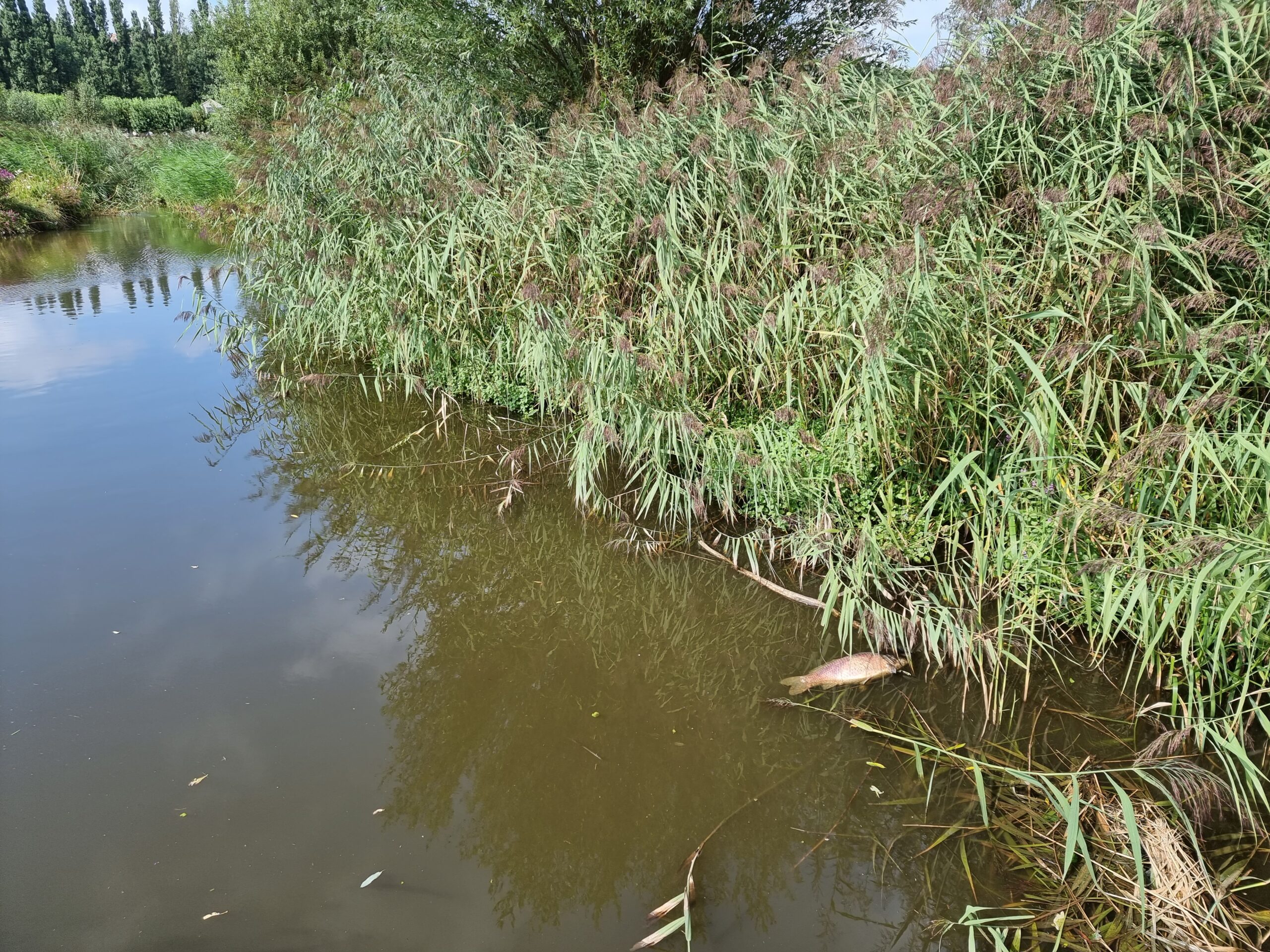 Mogelijk zijn het daarom ook vooral flink uit de kluiten gewassen karpers die dood in de sloten drijven. Soms met een paar bij elkaar. Een naar gezicht en op sommige plekken in het park hangt ook een penetrante lucht van dode vis. “Ik heb vandaag een rondje door het hele park gelopen en je ziet ze echt overal drijven’, vertelt Van Royen. Dat blijkt te kloppen. Je hoeft niet ver te zoeken om de ene na de andere dode karper te spotten.