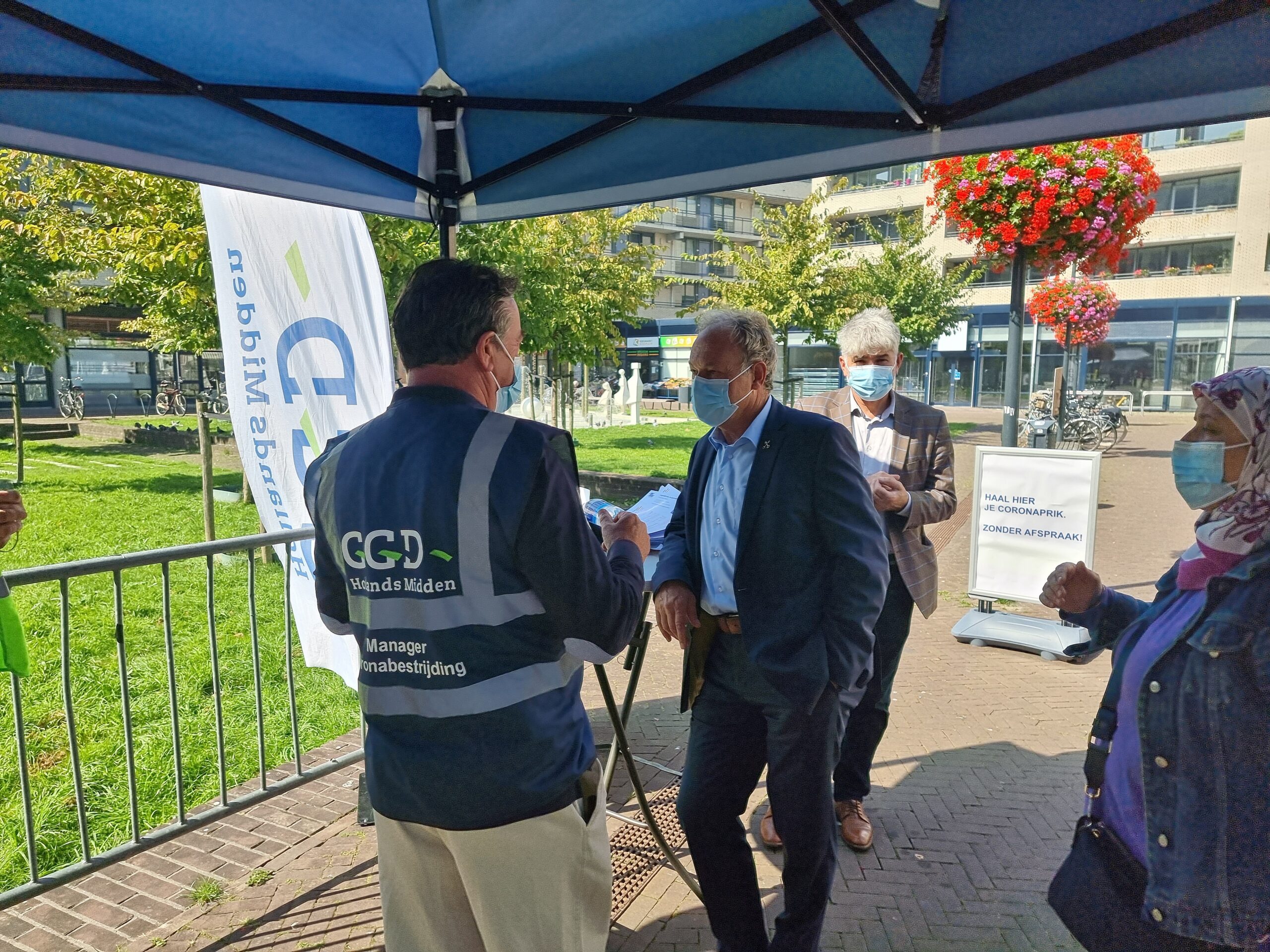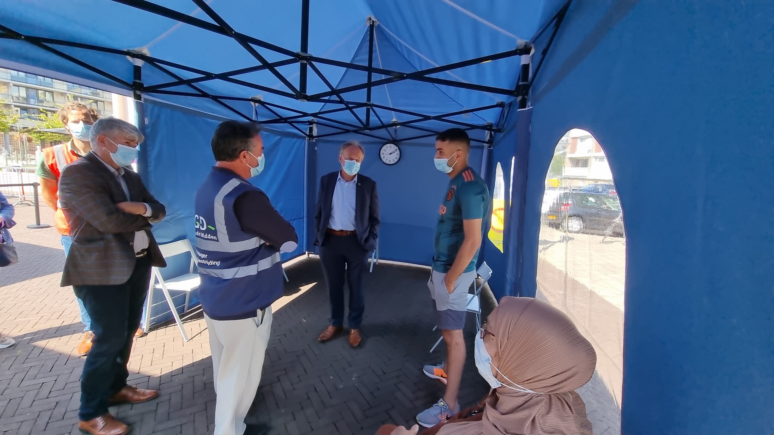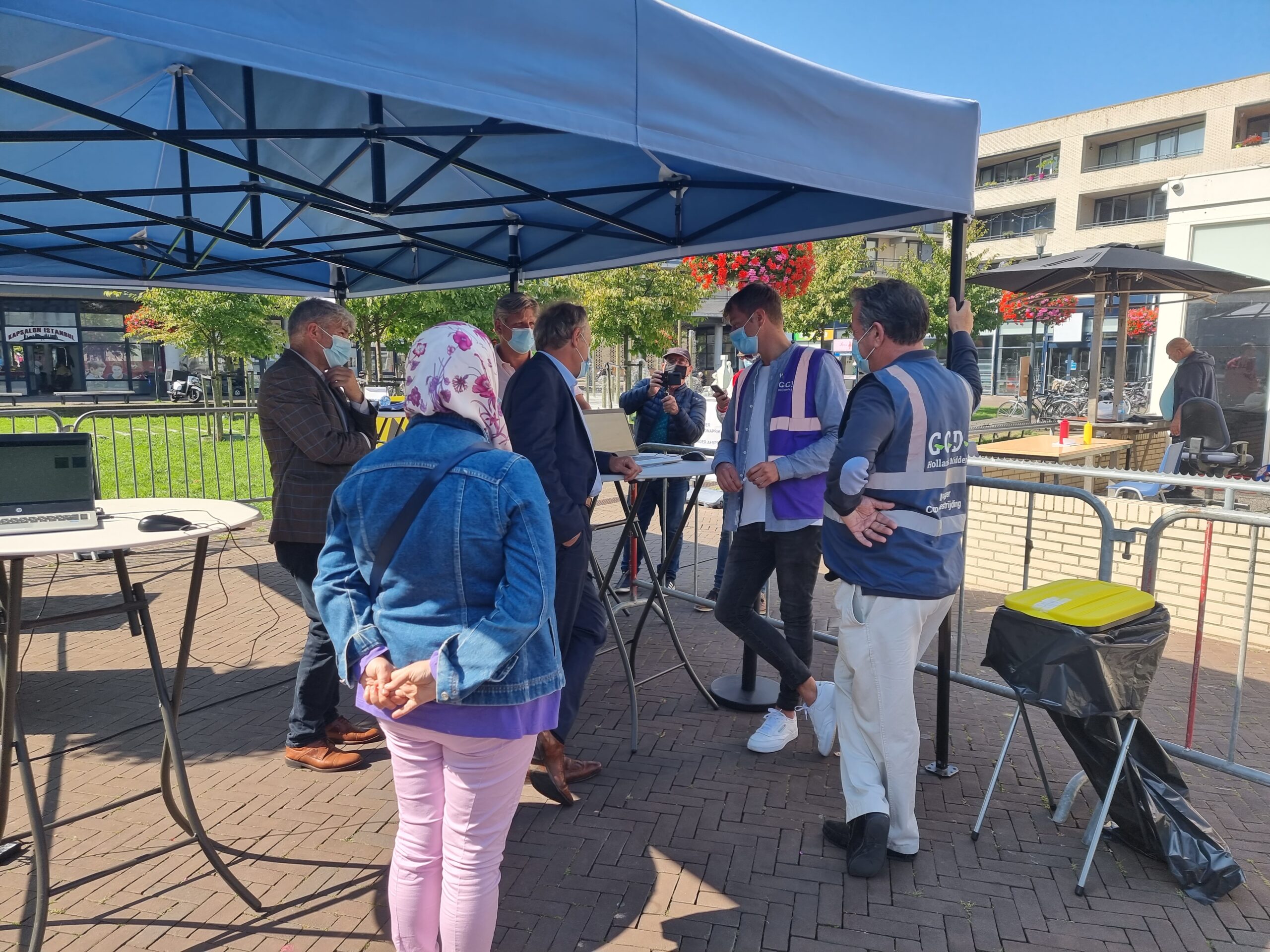 Vanmiddag kwam de Leidse burgemeester Lenferink ook even bij de prikbus kijken. Hij liet zich er door manager coronabestrijding Pieter Haasbeek van de GGD informeren over de manier van werken. Ook sprak hij met voorzitter Göksel Aribas van het bestuur van de Mimar Sinan Moskee. De moskee roept de eigen achterban voortdurend op om zich te laten vaccineren.
