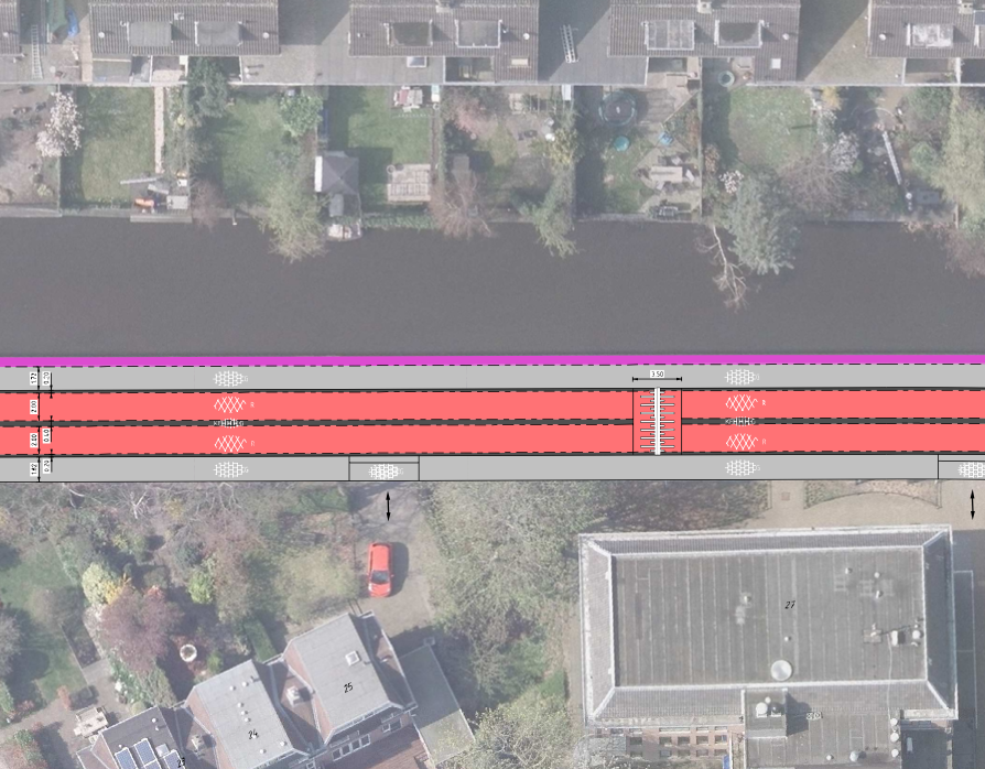 De weg krijgt de uitstraling van een fietspad met rood asfalt. De huidige versmallingen en obstakels verdwijnen. Om het verkeer af te remmen worden er enkele drempels aangelegd.