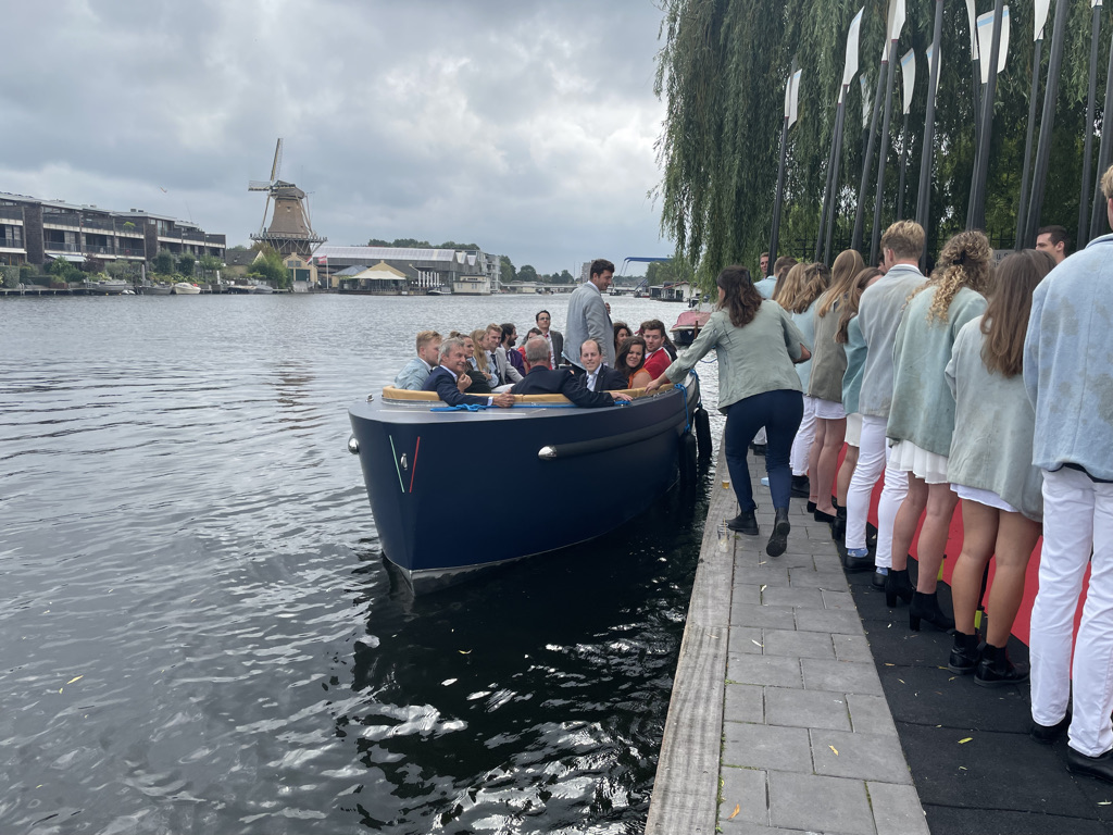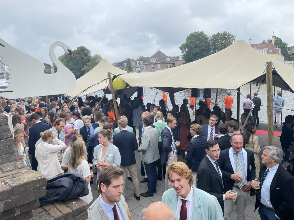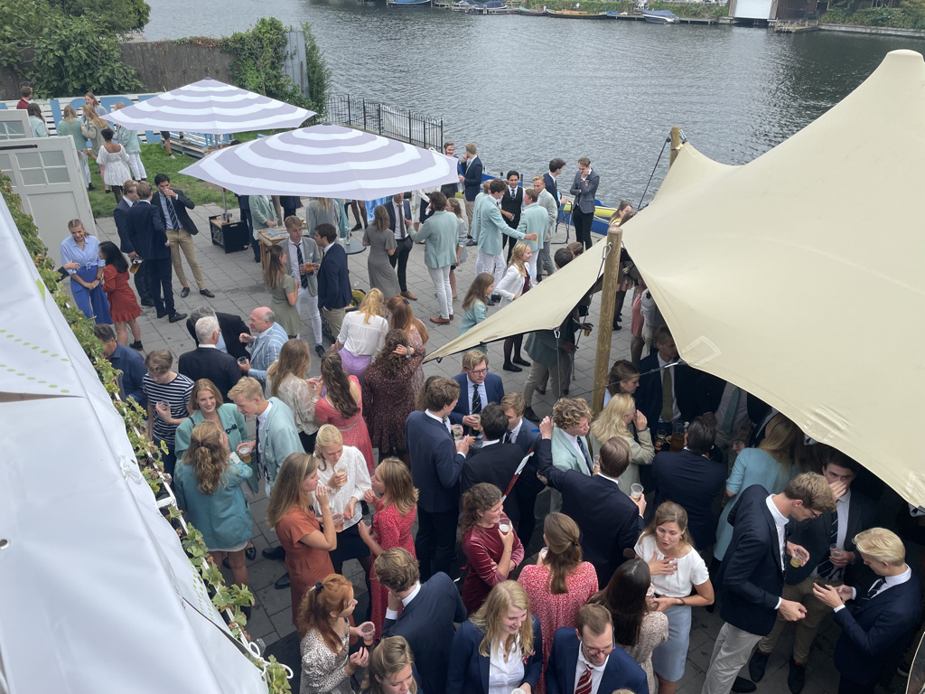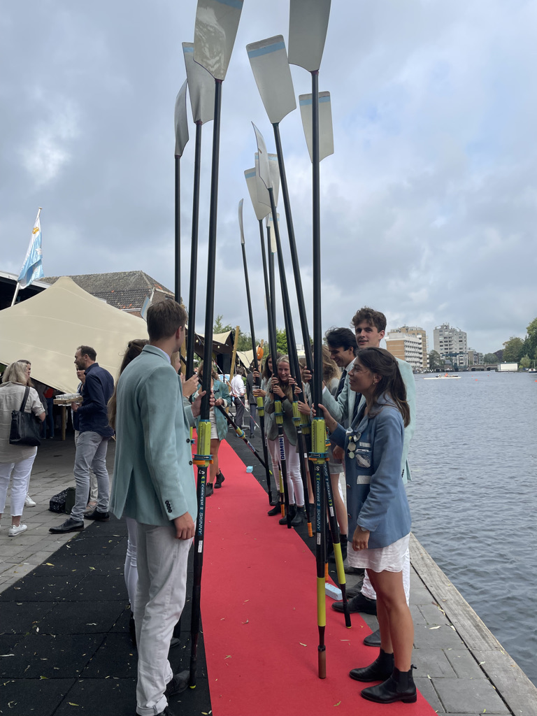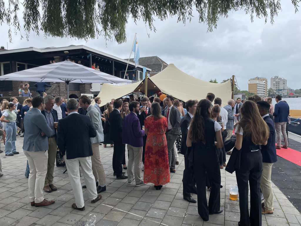Normaal mag de borrel op de studentenroeivereniging pas om 17:26 uur beginnen, nadat in een ver verleden een aantal bezoekers met een champagnekurk de klok op dat tijdstip hadden teruggezet, maar de aankomend praeses Floris Gerritsen nodigde iedereen direct na de aankomst van de boot met toproeiers uit een drankje te nemen. Maar allereerst applaus voor Annika, Stef, Nicole, Lisa en Koen.
