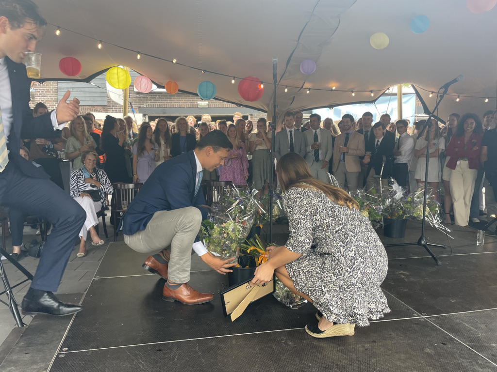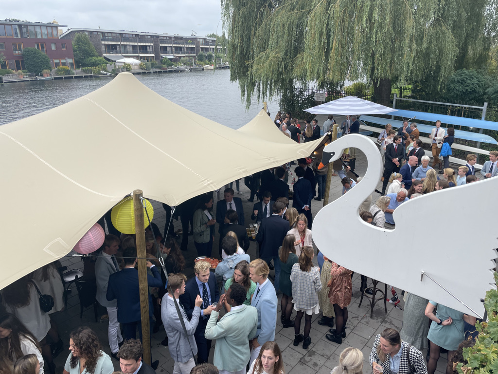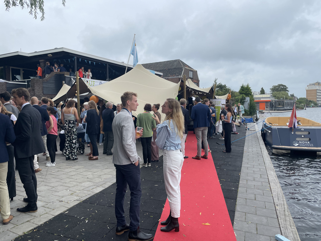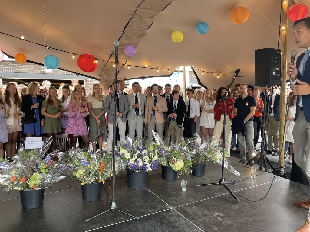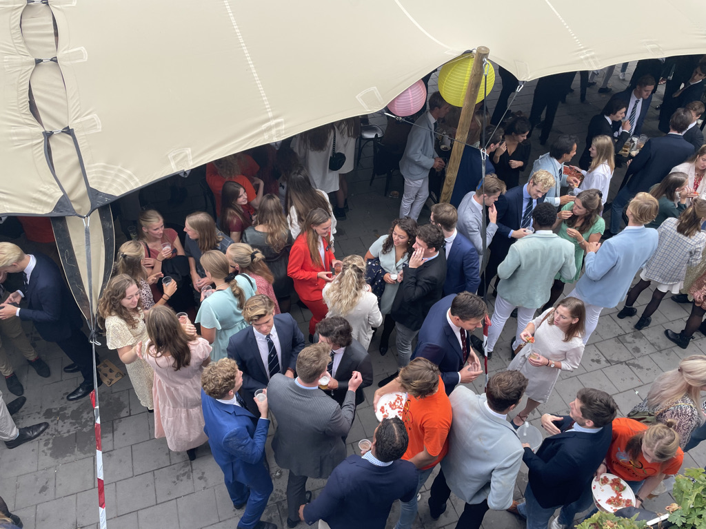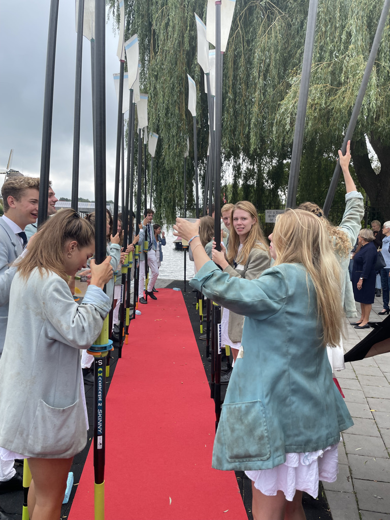 Normaal mag de borrel op de studentenroeivereniging pas om 17:26 uur beginnen, nadat in een ver verleden een aantal bezoekers met een champagnekurk de klok op dat tijdstip hadden teruggezet, maar de aankomend praeses Floris Gerritsen nodigde iedereen direct na de aankomst van de boot met toproeiers uit een drankje te nemen. Maar allereerst applaus voor Annika, Stef, Nicole, Lisa en Koen.