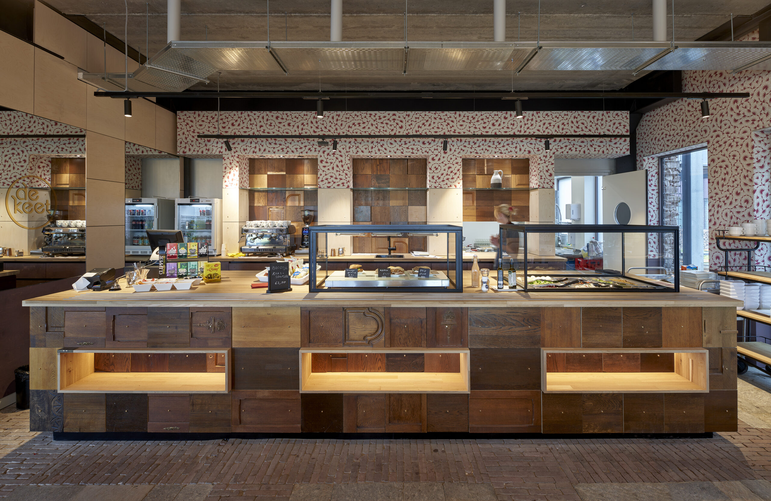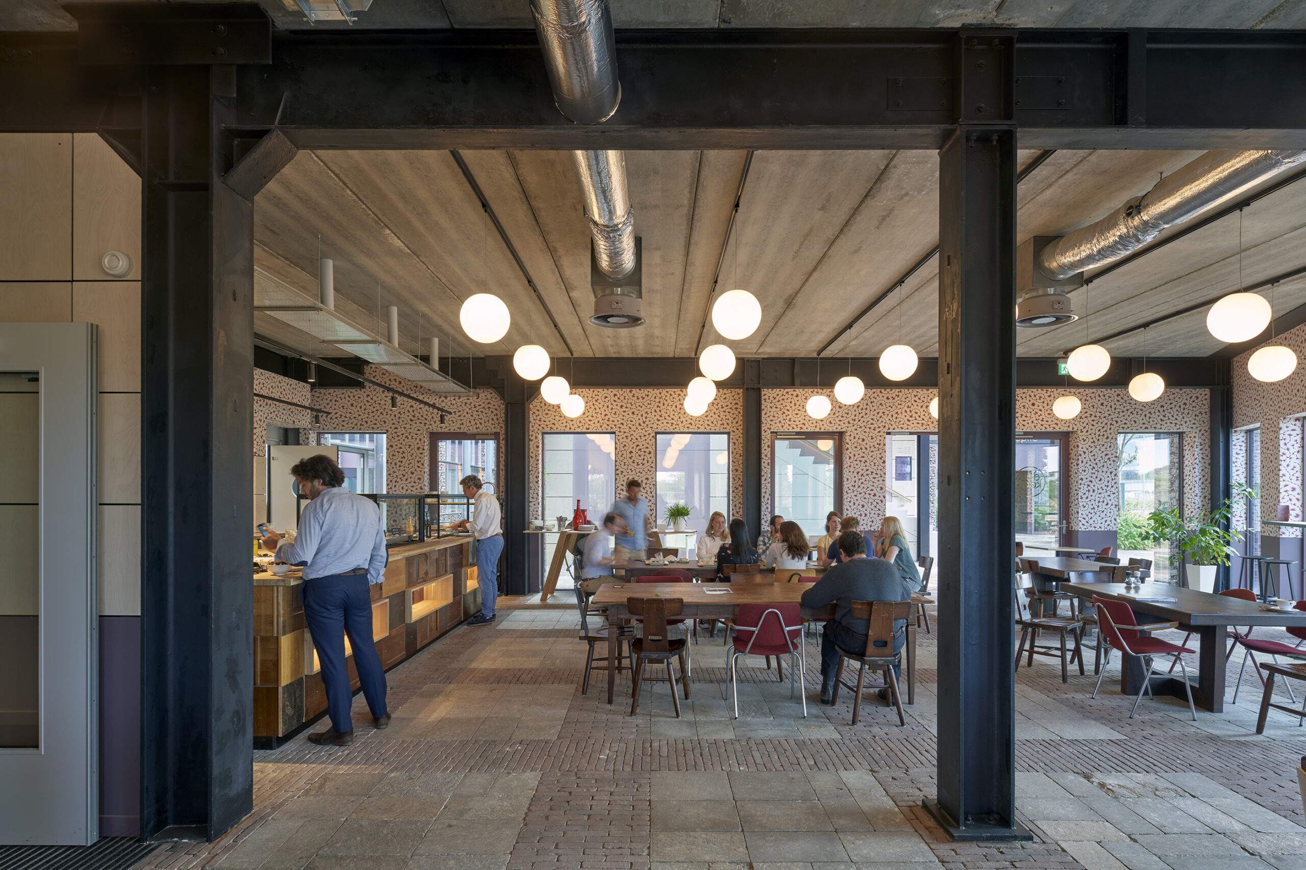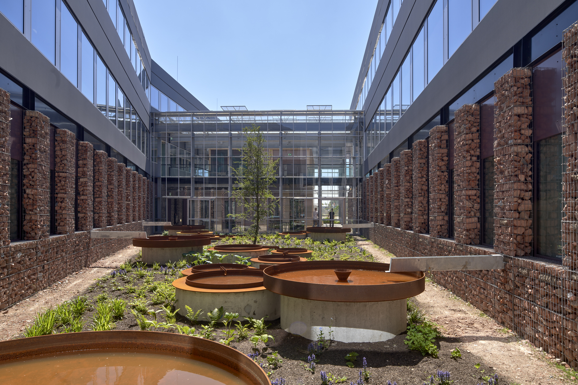 Naast de hergebruikte pilaren, kent het interieur van het gebouw ook tweedehands materialen. “Alles wat je hier ziet is circulair”, vertelt De Kleer. Zo bestaat het baliemeubel in de kantine uit oude eikenhouten kasten die decennia geleden in menig interieur te vinden waren. Ook hebben oude Perzische tapijten een tweede leven gekregen en is een afgekeurde partij tegelvloerbedekking hergebruikt. Daarnaast zijn de stalen plantenbakken op het terrein gevuld met steensoorten die weer fungeren als schuilplaats voor dieren en wordt op het dak overtollig regenwater opgevangen.