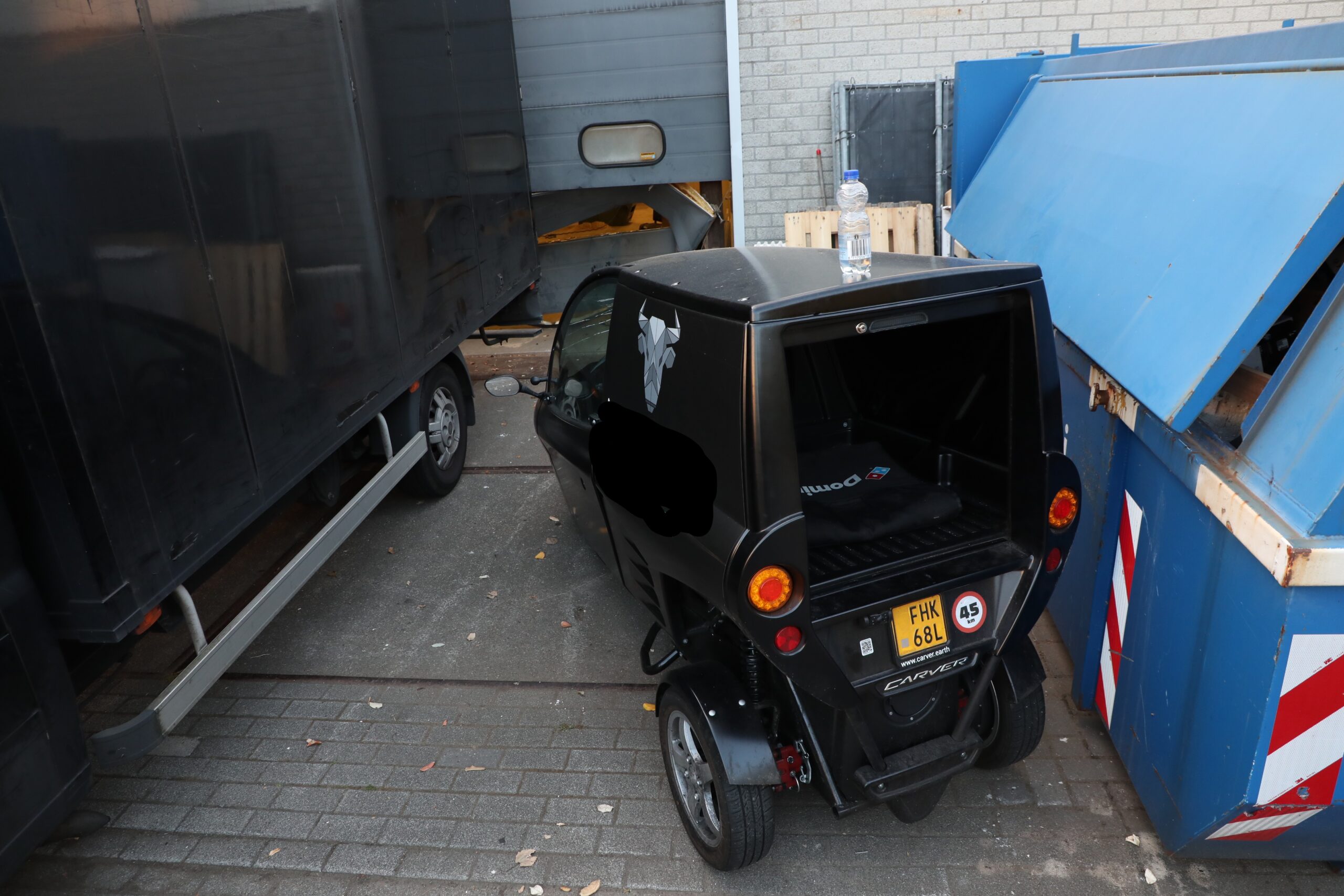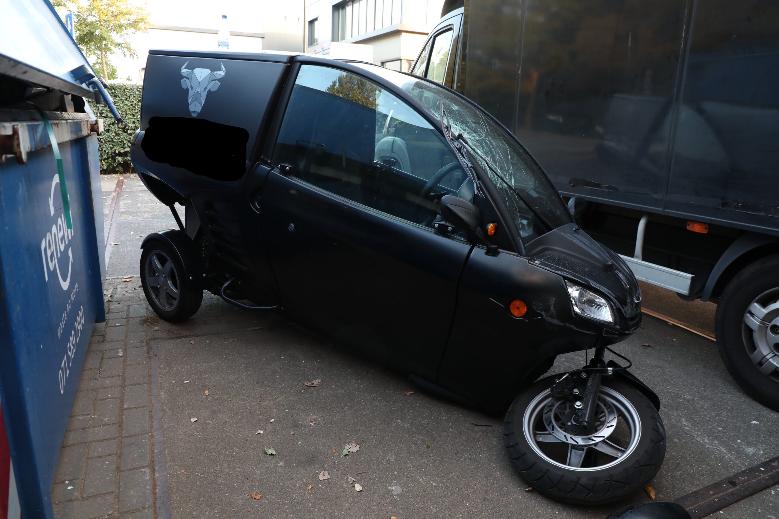 De jongen reed in een Carver, een elektrische kruising tussen een scooter en auto. Bij het inzetten van de bocht verloor de bestuurder de macht over het stuur. Het voertuig schampte een geparkeerde vrachtwagen, miste op een haar na een container en is tegen het rolluik van een bedrijfspand tot stilstand gekomen.
