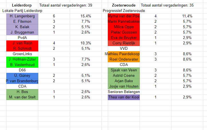 Sommige raadsleden hadden goede redenen voor het missen van vergaderingen. Zo was Andre in ’t Veen (VVD Voorschoten) er bij een aantal raadsvergaderingen niet bij vanwege ziekte. Dat gold ook voor Hugo Langenberg van Lokale Partij Leiderdorp. Hij miste vijftien procent van alle raadsvergaderingen.