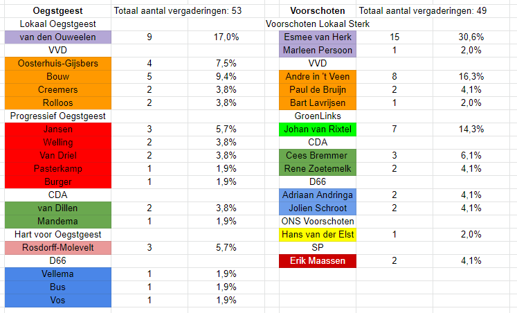 Een overzicht van de afwezigheid per raadslid voor de verschillende gemeenten. Raadsleden die bij elke vergadering aanwezig zijn geweest, komen niet in de tabel voor.