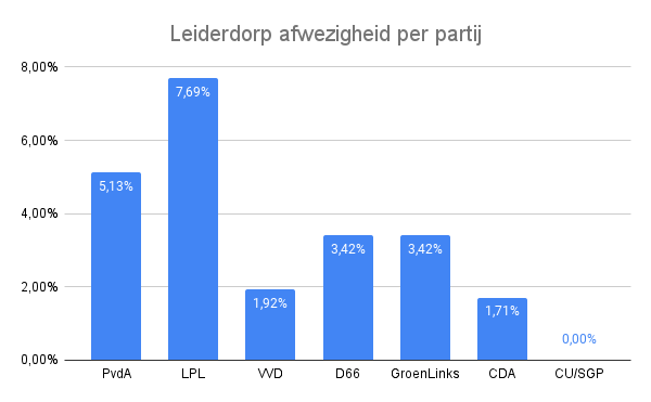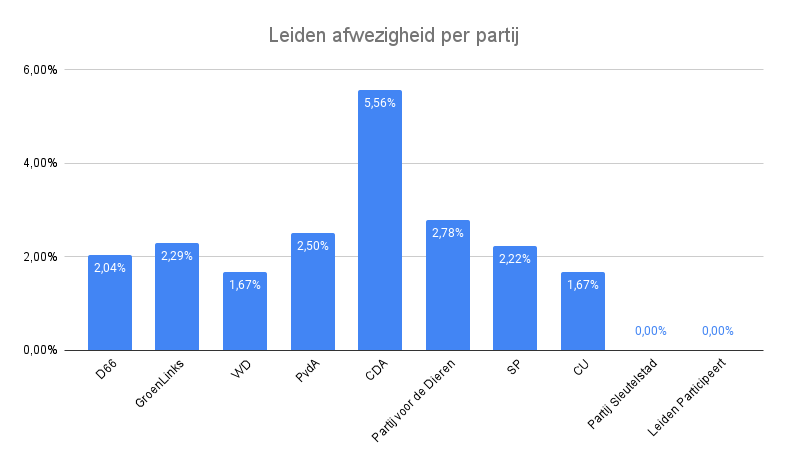 Als we kijken naar de aanwezigheid per partij (gecorrigeerd op het aantal zetels) dan valt op dat de lokale partijen in sommige gemeenten het slechtst scoren, terwijl ze in andere gemeenten juist de hoogste opkomst behalen. In Voorschoten, Leiderdorp en Oegstgeest voeren respectievelijk Voorschoten Lokaal Sterk, Lokale Partij Leiderdorp en Lokaal Oegstgeest het absentieklassement aan. In Zoeterwoude en Leiden zijn de lokale partijen juist het meest aanwezig. Zo misten Partij Sleutelstad en Leiden Participeert geen enkele vergadering.