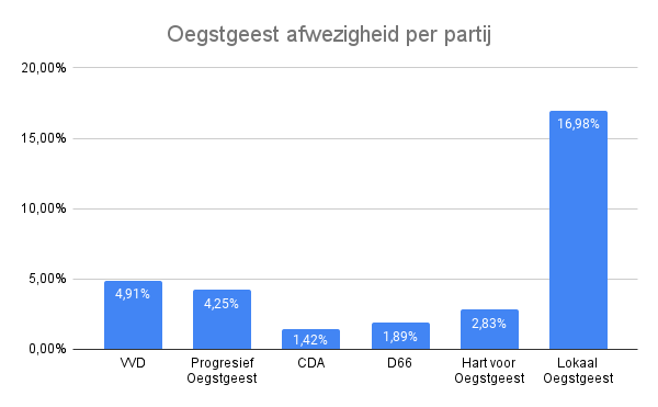 In Oegstgeest is Eelke van den Ouweelen van de partij Lokaal Oegstgeest koploper als het gaat om het niet aanwezig zijn bij raadsvergaderingen. Hij miste zo’n zeventien procent. “Ik doe alles zelf en heb geen commissieleden. Ik werk mij een slag in de rondte, maar ik moet keuzes maken ten aanzien van de onderwerpen”, zegt Van den Ouweelen. Daarnaast speelt zijn gezinssituatie een rol. Zijn kinderen wonen in het buitenland. “Daarom plan ik om de raadsvergaderingen heen. Als de griffie vergaderdata verandert (afwijkend van het vastgestelde vergaderrooster) kan ik daar helaas in sommige gevallen niet bij zijn.”