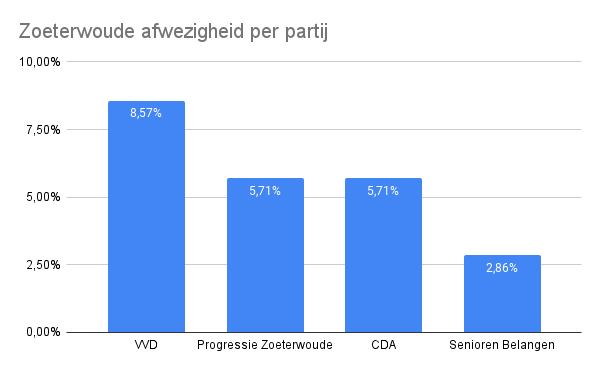 Het missen van geen enkele raadsvergadering kunnen de raadsleden in Zoeterwoude niet zeggen. Daar was iedereen minstens een keer afwezig. Dat maakt de kleinste gemeente van de Leidse regio een uitzondering op de andere gemeenten. Zo waren er in Voorschoten negen ijverige raadsleden die er altijd bij waren. In Leiderdorp waren dat er zes, in Leiden acht en Oegstgeest drie.
