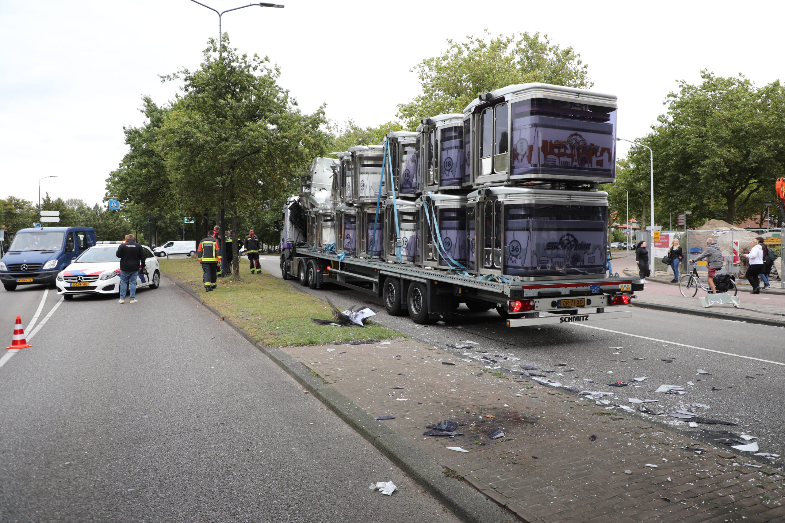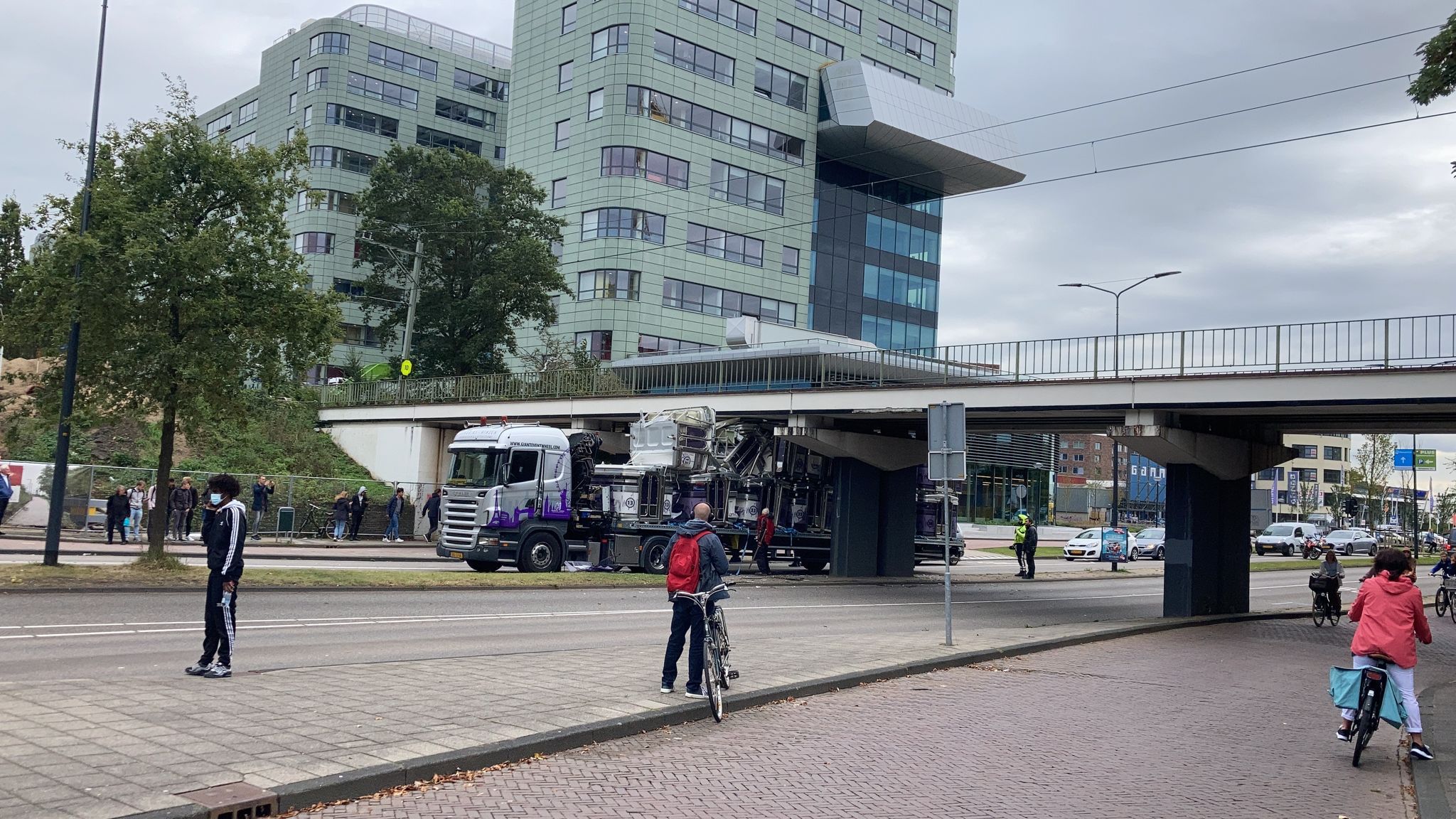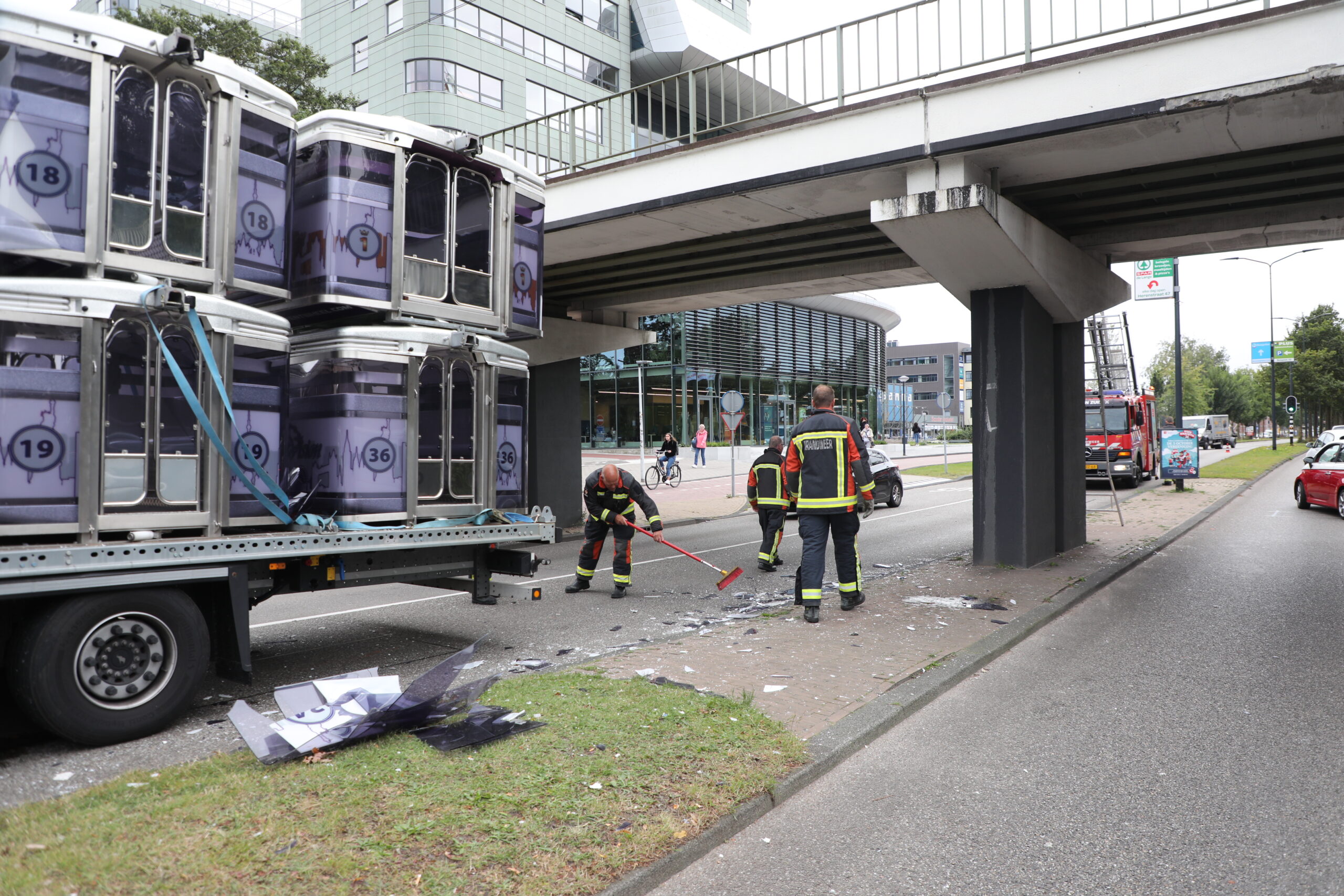 Een vrachtwagen met daarop de bakjes van het reuzenrad voor de kermis is vanmiddag tegen het spoorviaduct op de Lammenschansweg gebotst. Meerdere bakjes zijn zwaar beschadigd. Het geraamte van het reuzenrad is niet beschadigd, dat staat al klaar op de kermis.