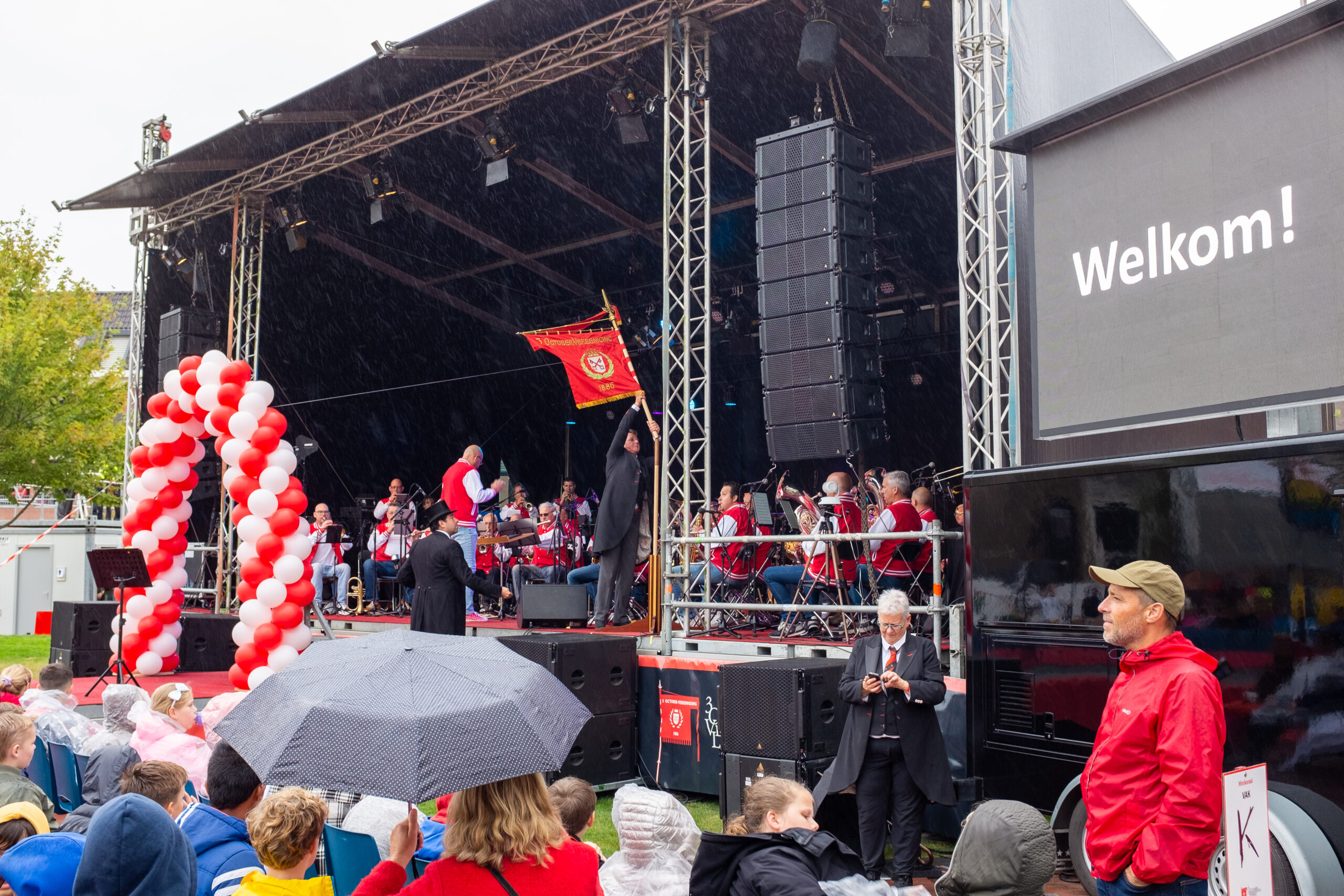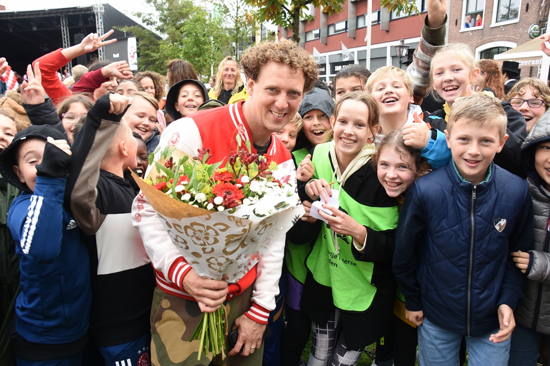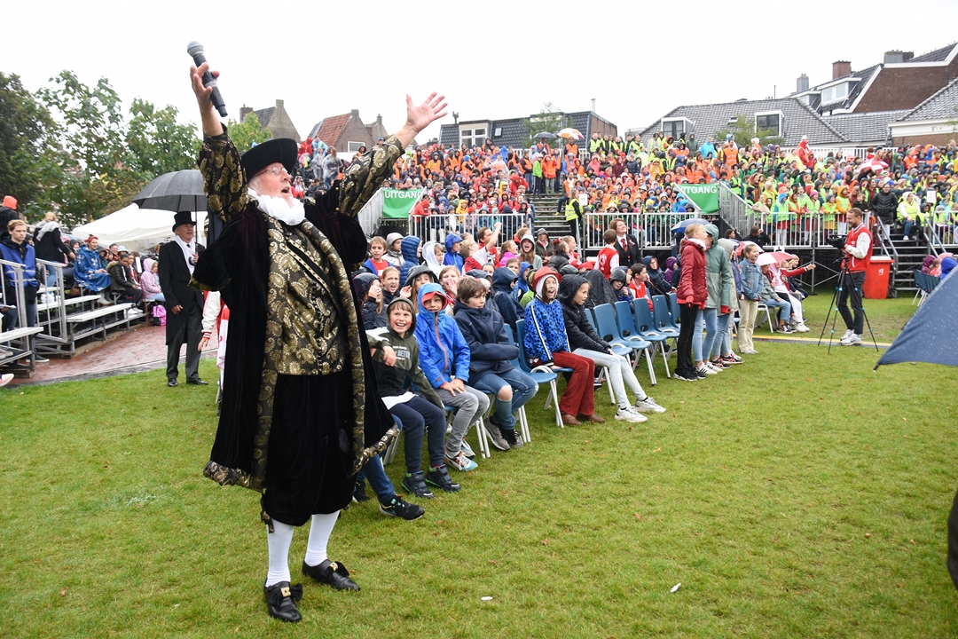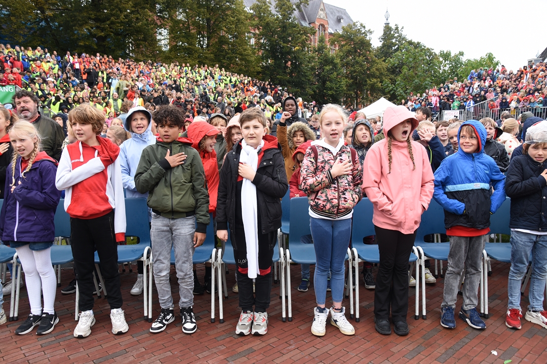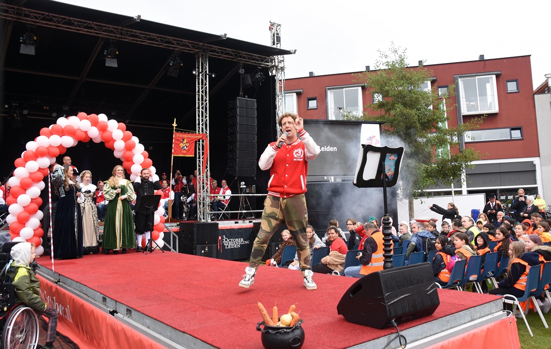 Uit volle borst zongen zo’n 3500 basisschool kinderen vrijdagmiddag mee met het minikoraal. Het traditionele begin van Leidens Ontzet. Het zangfestijn was weer terug op de Garenmarkt, maar voor cabaretier Jochem Myjer was het zijn laatste keer.
