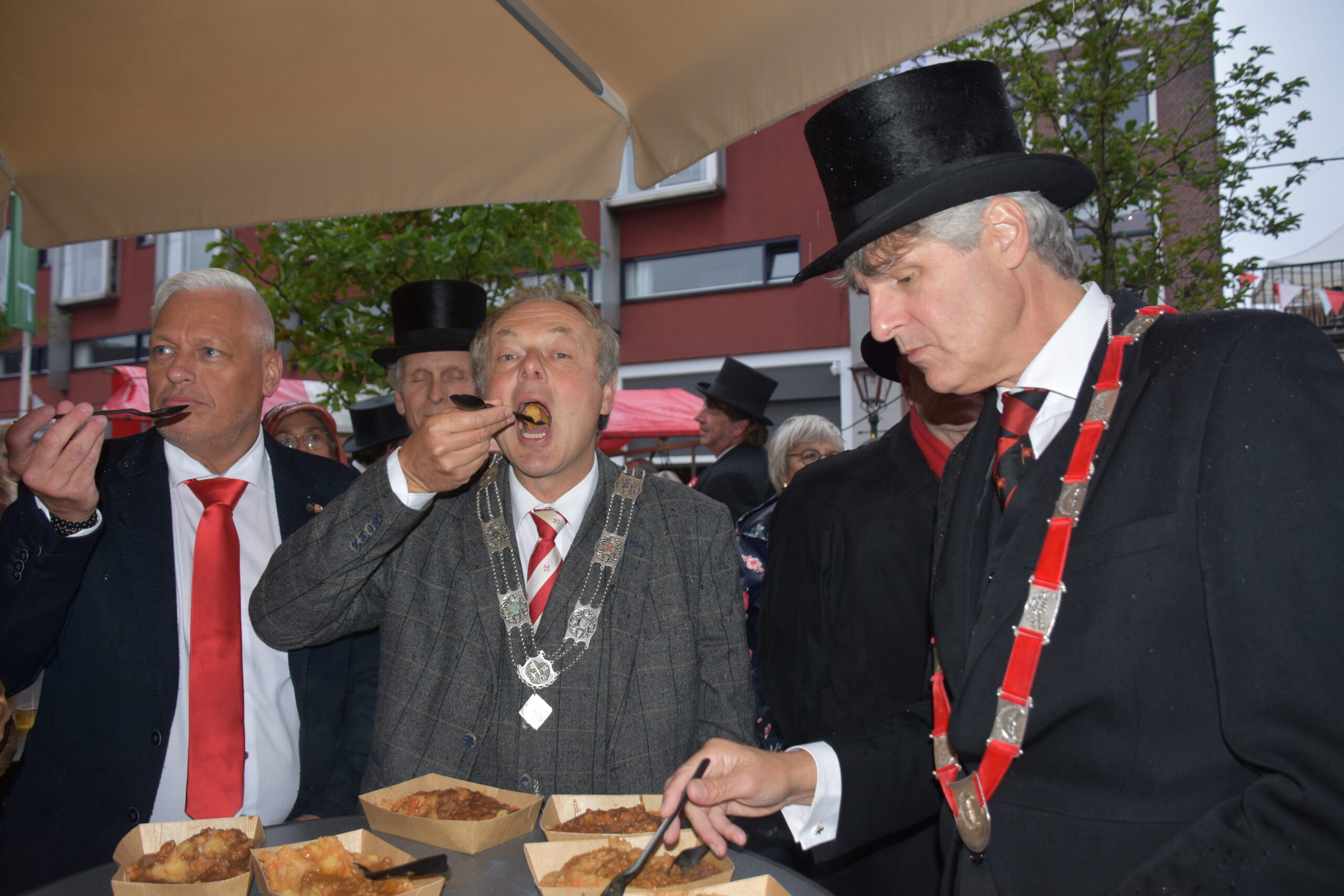Er was ook aandacht voor de nieuwe vindplaats van Schans Lammen, die is gevonden aan de voet van de Lammebrug bij de Europaweg. Niemand minder dan Gijsbert Cornelis Schaek kwam een pot traditionele hutspot afleveren. Het was namelijk niet Cornelis Joppensz die in 1574 een pot met hutspot vond, maar deze ‘ Gijs’. ” Vergeet die naam dus nooit meer”, aldus de rechtmatige vinder.