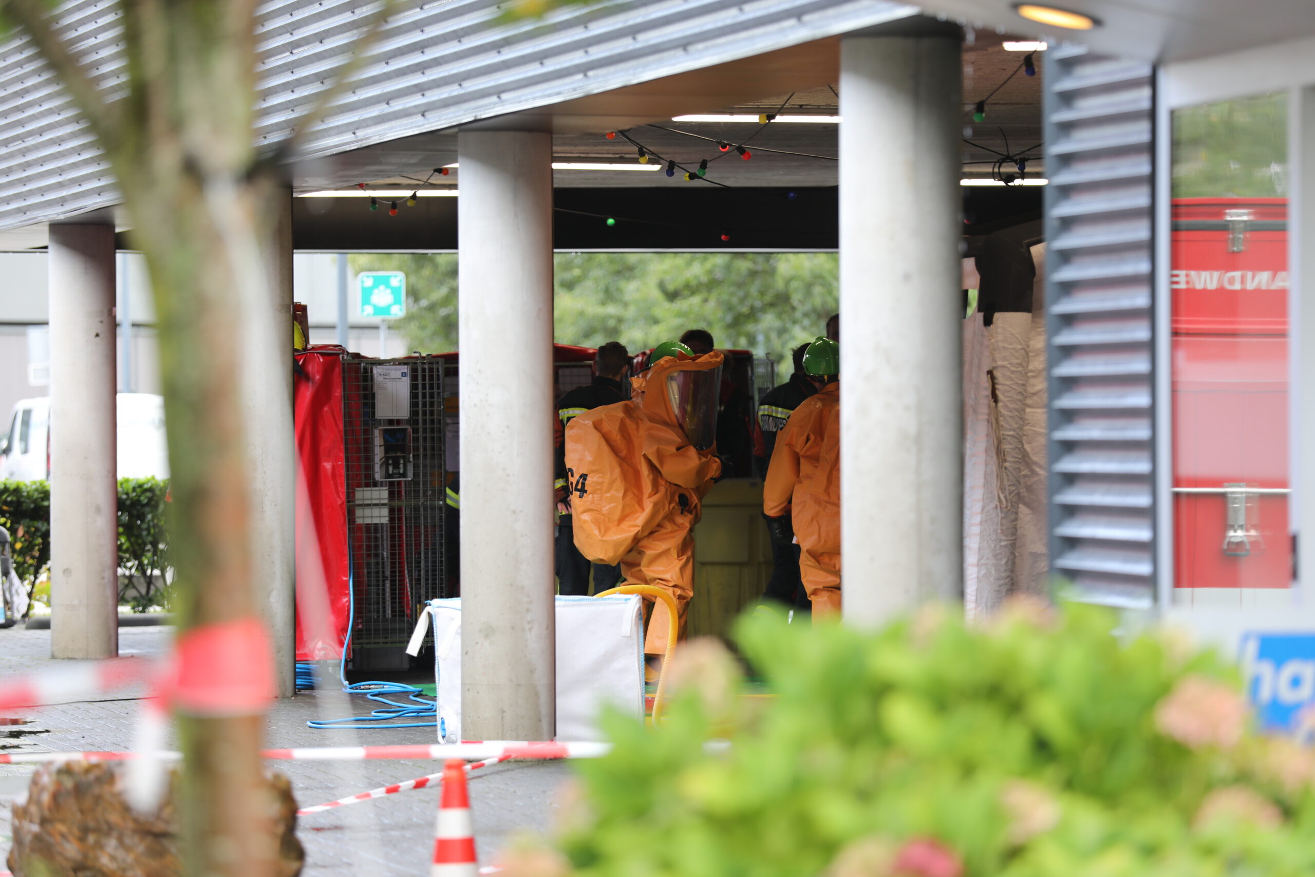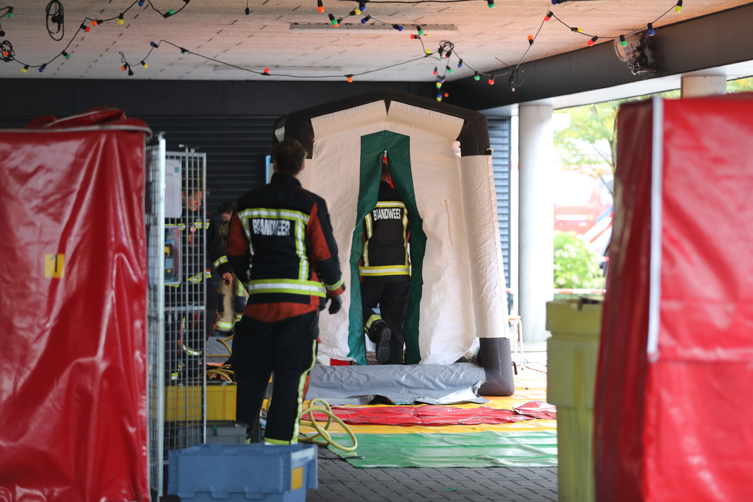 De brandweer neemt geen risico en stuurt manschappen gehuld in oranje afgesloten pakken naar binnen. Die moeten het pand bovendien via een inmiddels geïnstalleerde ontsmettingsstraat betreden.