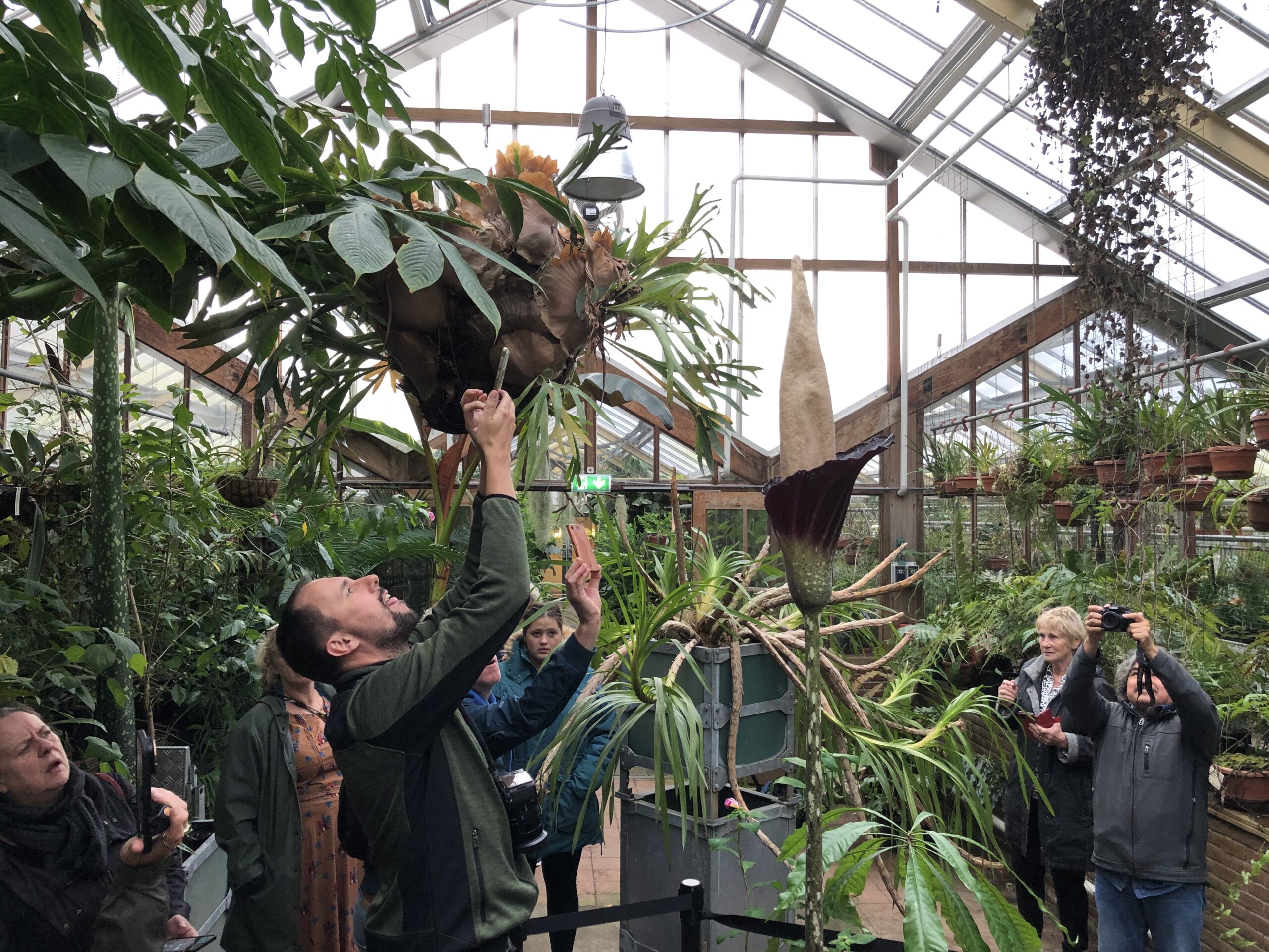 Het tot bloei komen van de plant trekt meteen veel bekijks in de Hortus. Zo’n vijftien mensen waren al aanwezig in afwachting van de bloei, maar nu de ‘penisplant’ zich daadwerkelijk laat zien komen er steeds meer mensen binnen. Van Vugt: “Planten hebben normaal gesproken een imagoprobleem. Dieren vinden mensen bijvoorbeeld veel leuker, een plant is minder spectaculair. Dan is het extra leuk dat het nu zoveel aandacht trekt.”