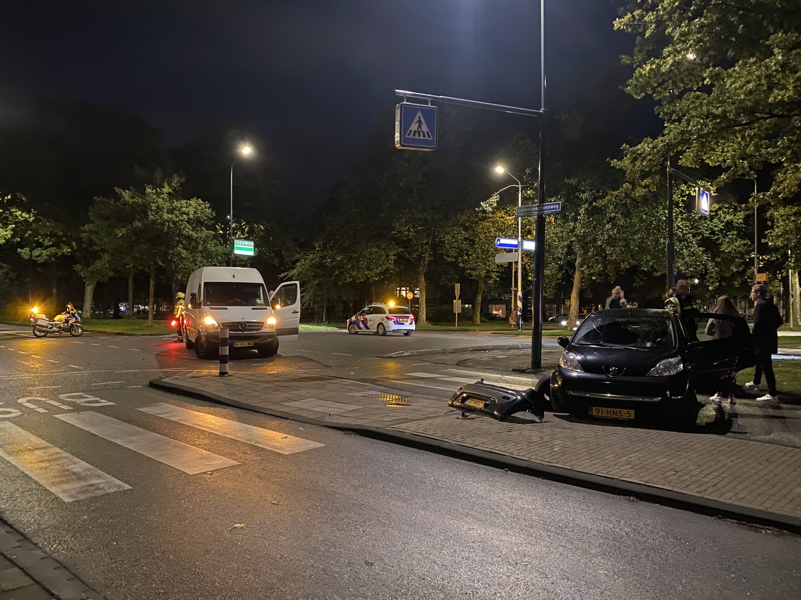 Een bestelbus en een personenauto zijn vrijdagavond flink beschadigd geraakt bij een botsing op het kruispunt van de Lammenschansweg en de De Sitterlaan bij station Leiden Lammenschans.