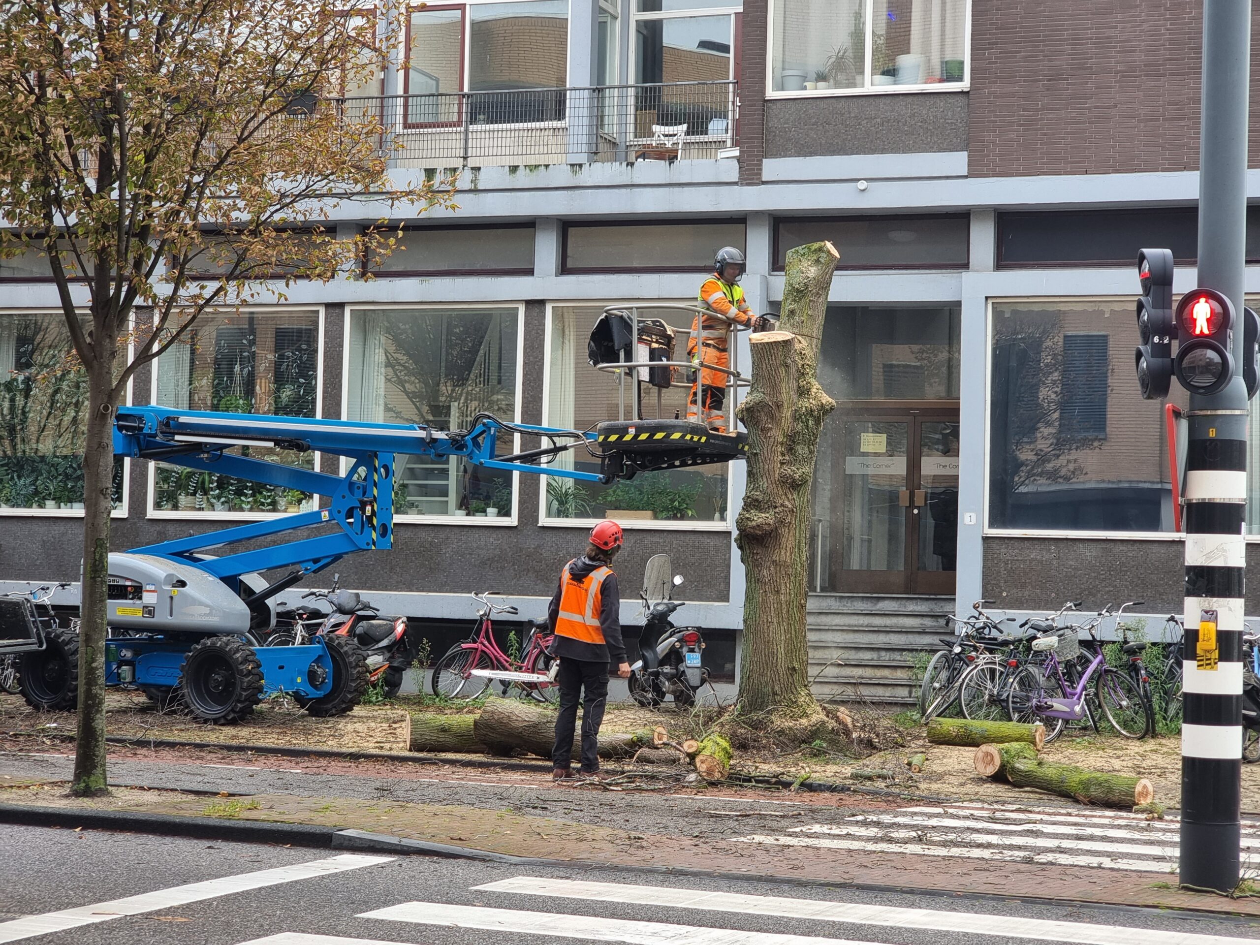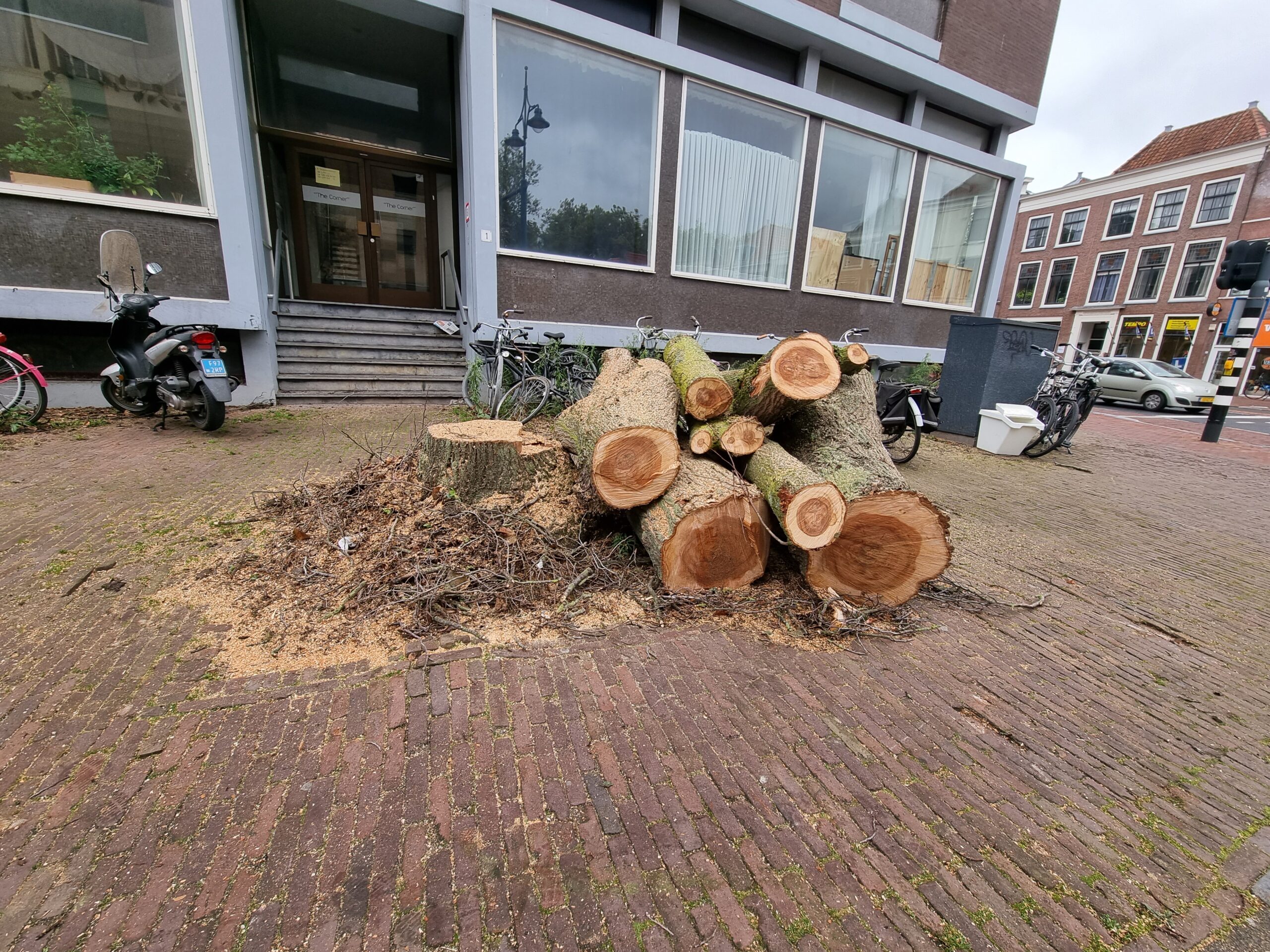 Een flinke boom op de hoek van de Ir. Driessenstraat en de Hooigracht is vanmiddag door de gemeente in stukken gezaagd. “Triest”, zegt fractievoorzitter Martine van Schaik van de Partij voor de Dieren in Leiden.