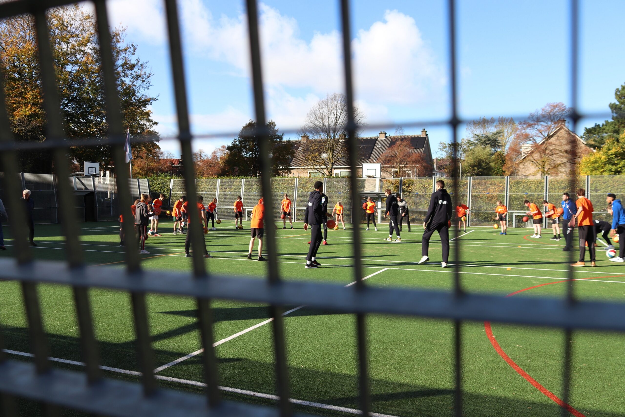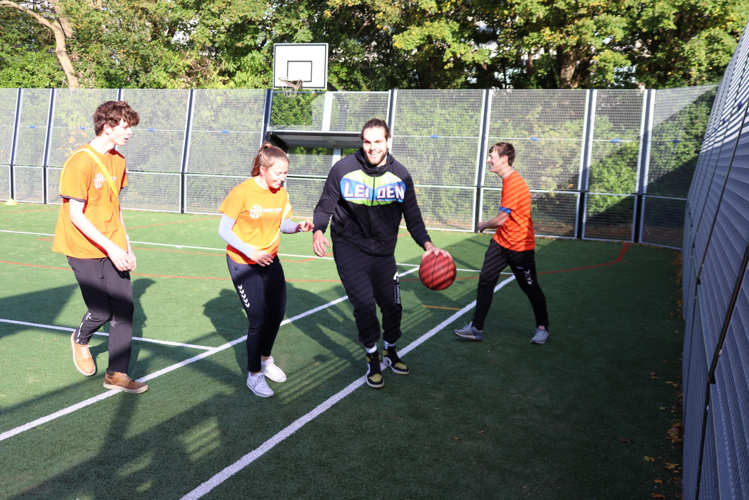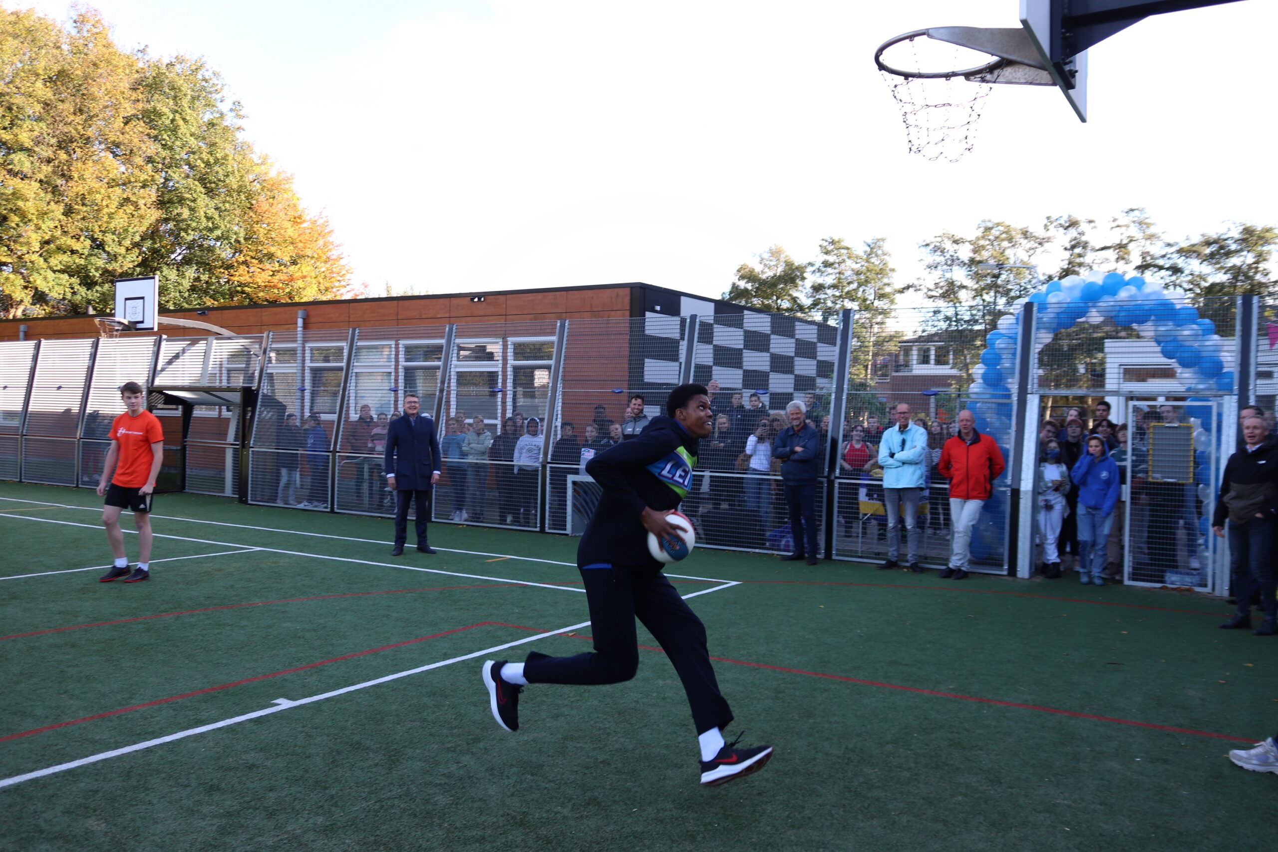 Met een vertraging van meer dan een jaar is deze week het nieuwe ‘multicourt’ van het Visser ’t Hooft lyceum aan de Kagerstraat officieel geopend. Begin 2020 was het sportveld net gereed gekomen maar toen moest de school noodgedwongen dicht vanwege corona. Deze week werd het multifunctionele sportveld alsnog officieel in gebruik genomen met een clinic van enkele topbasketballers van ZZ Leiden.