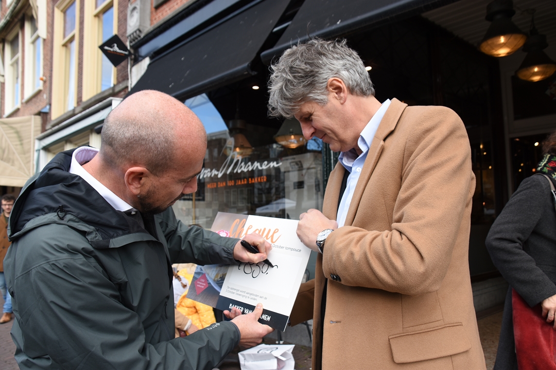 De speciale 3 oktober-tompouce die bakker Van Maanen maakte leverde de 3 October Vereeniging een bedrag van 850 euro op. Rik Kamps, voorzitter van de 3 October Vereeniging, kreeg het bedrag vandaag uitgereikt door John van Maanen.