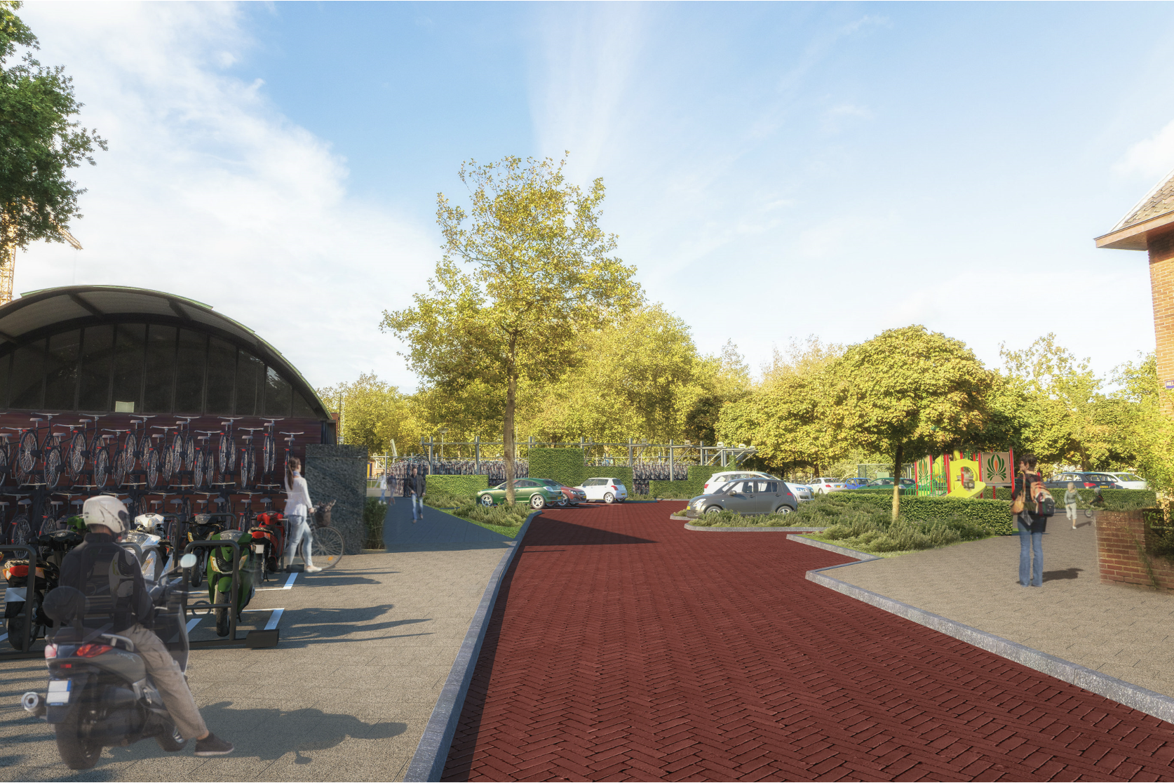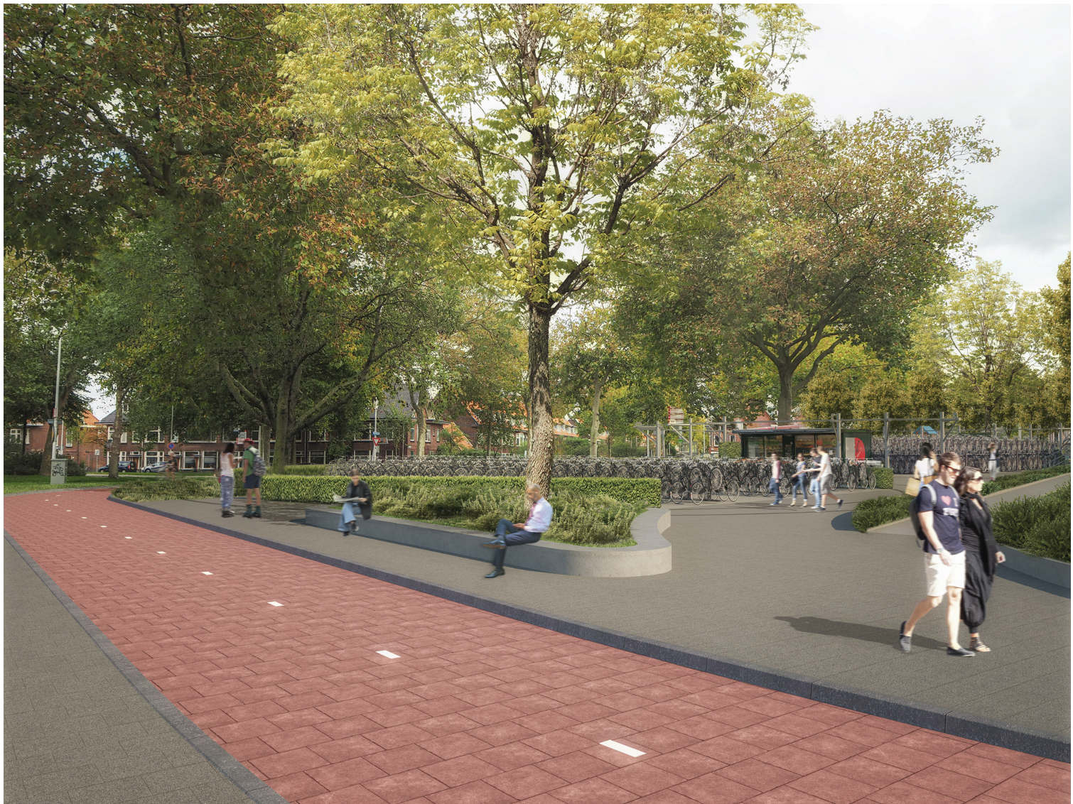 Op de rest van het plein zorgt de aanleg van veel groen en slingerpaden ervoor dat het zicht op de fietsenstallingen wordt ontnomen. North: “Je ziet ze niet, maar de extra plekken zijn er wel.” Fietseigenaren hoeven zich geen zorgen te maken dat de verborgen stallingen onveilig zijn. “Daar is aan gedacht. We richten het zo in dat iedereen zijn fiets veilig neer kan zetten”, belooft North.